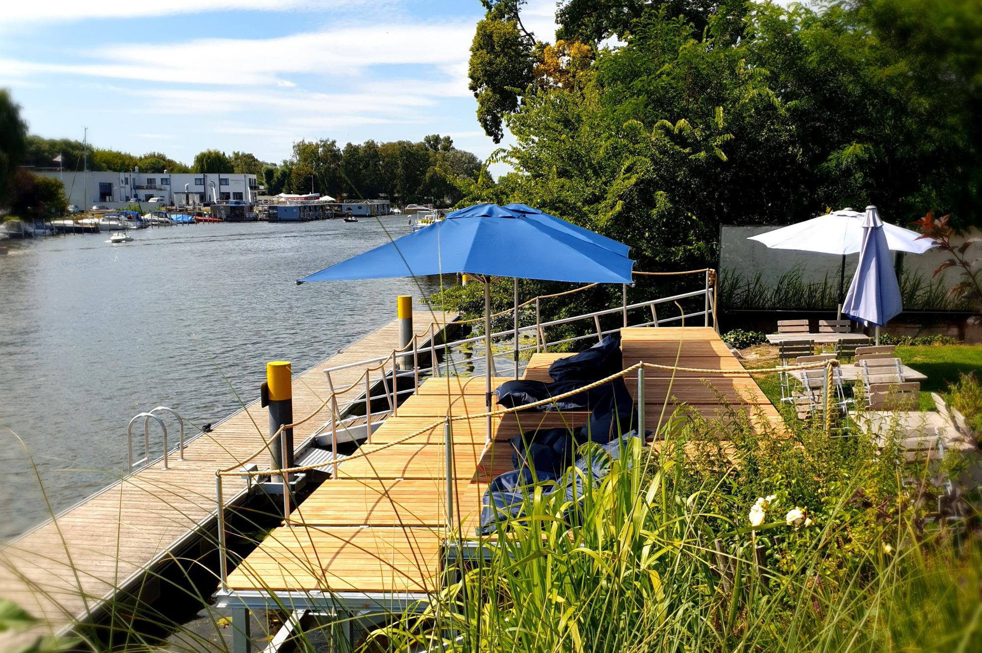 Zu dieser Ferienwohnung gehört die große Liege-/Spielwiese am Havelufer mit direktem Zugang zur hauseigenen Schwimm-/Badesteganlage, welche mit Badeleiter und einer Freibordhöhe von 20 cm errichtet wurde. Das ermöglicht Ihnen ein bequemes Ein- und Aussteigen aus ihrem Kanu bzw. Ruderboot. Weiterhin ist dort direkt neben dem übergroßen Natursteintisch (ca. 5 x 1,20m) der Grillplatz.