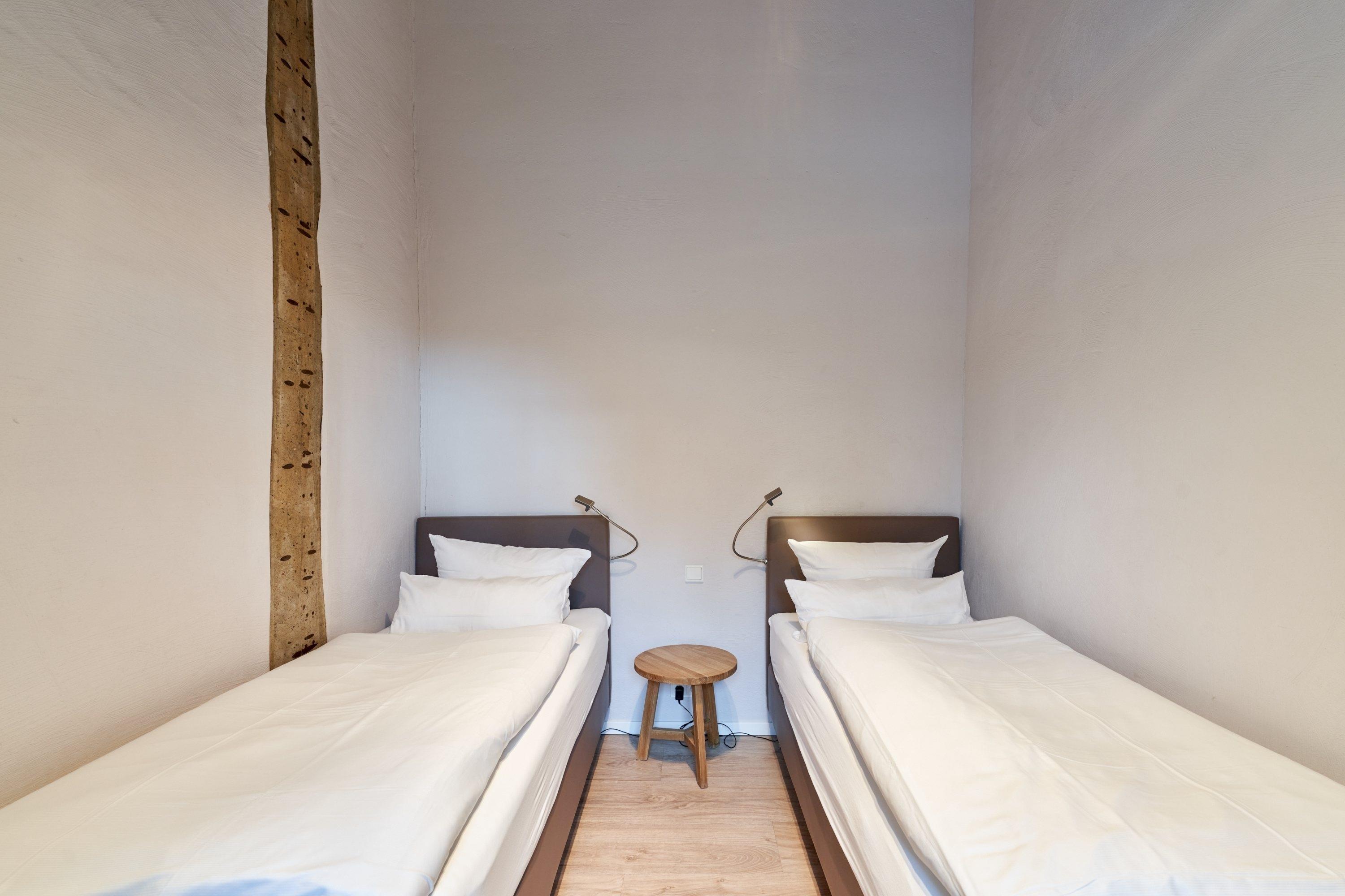 Diese Wohnung verfügt über 3 Schlafzimmer. In der unteren Ebene befindet sich ein Schlafzimmer mit einem Doppelbett und ein weiteres mit zwei Einzelbetten. Der dritte Schlafraum befindet sich in der Empore und ist mit einem Doppelbett ausgestattet. Alle Schlafzimmer sind jeweils mit überlangen (2,10 m) hochwertigen, komfortablen Boxspringbett versehen. Für die Unterbringung Ihrer persönlichen Dinge stehen Ihnen ein Teakholzschrank und zwei große Schwebetürenschränke zur Verfügung. Diese bieten Ihnen sehr viel Platz. Eine der Schwebetüren ist mit einem Ganzkörperspiegel versehen. Ein Safe für Ihre Wertsachen befindet sich in einem der Schwebetürschrank der unteren Ebene.