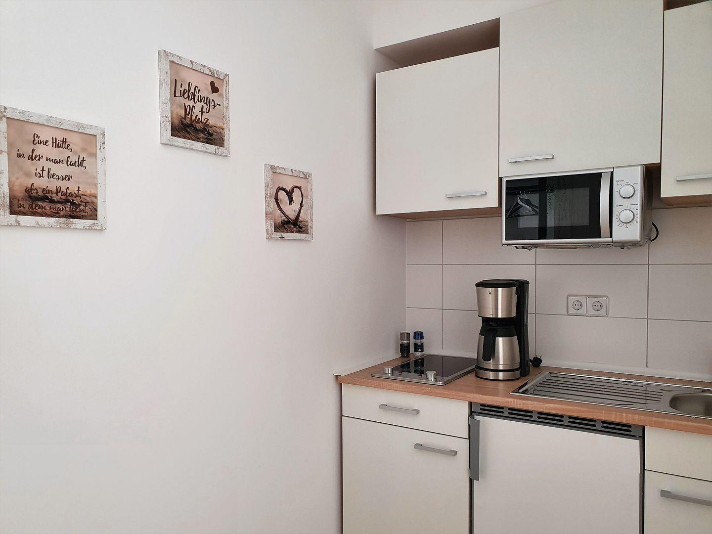 Die Ferienwohnung ist komplett ausgestattet und bietet alles, was Sie für einen angenehmen Aufenthalt benötigen. Die voll eingerichtete Küche ist das Herzstück des Appartements und lässt keine Wünsche offen. Hier finden Sie einen Herd, Kühlschrank mit Gefrierfach, Mikrowelle, Wasserkocher und eine Kaffeemaschine, um sich nach einem erlebnisreichen Tag einen duftenden Kaffee zuzubereiten. Geschirr und Besteck sind ebenfalls vorhanden, sodass Sie ganz bequem Ihre Lieblingsgerichte zaubern können. Genießen Sie Ihre Mahlzeiten an einem einladenden Tisch oder in der frischen Luft, wenn Sie sich entscheiden, auf dem Balkon zu speisen.