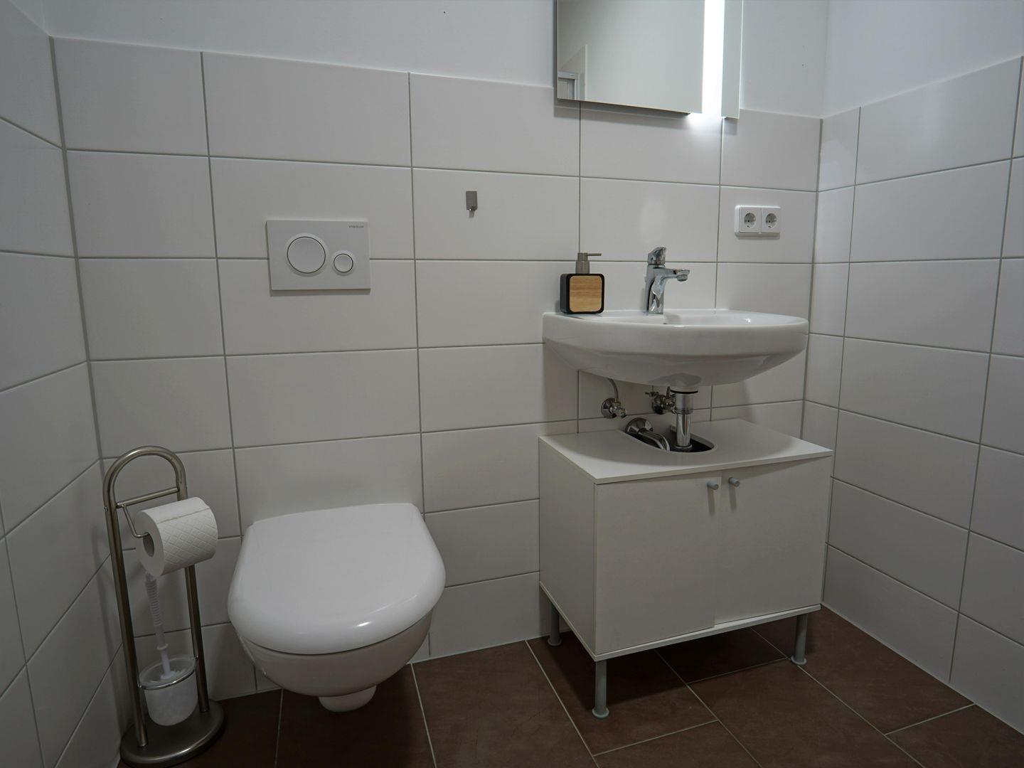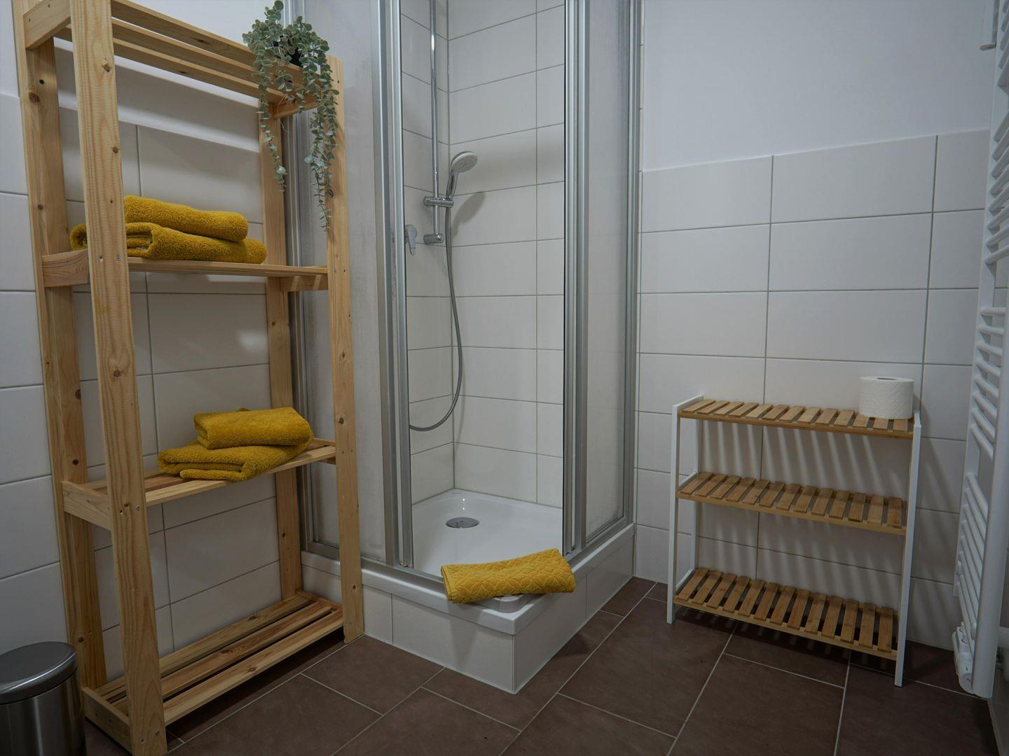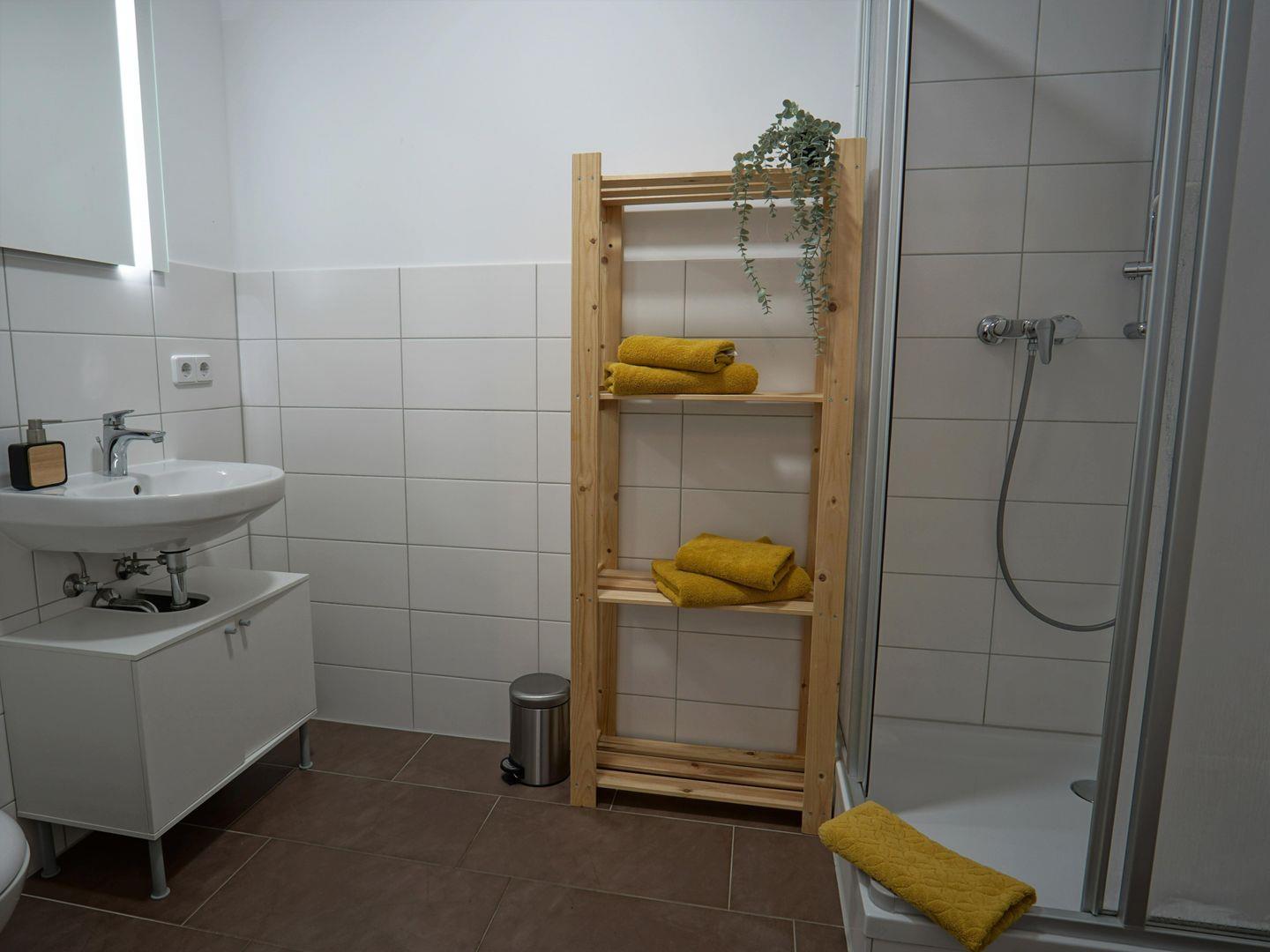 Das Badezimmer ist modern eingerichtet und verfügt über eine Dusche, ein Waschbecken und ein WC. Hier finden Sie auch einen Haartrockner sowie einen Spiegel, was Ihre morgendliche Routine leicht und angenehm macht. Für zusätzlichen Komfort sorgt der bereitgestellte Abfalleimer und die Wäschestücke, die Ihnen den Aufenthalt noch reibungsloser gestalten.