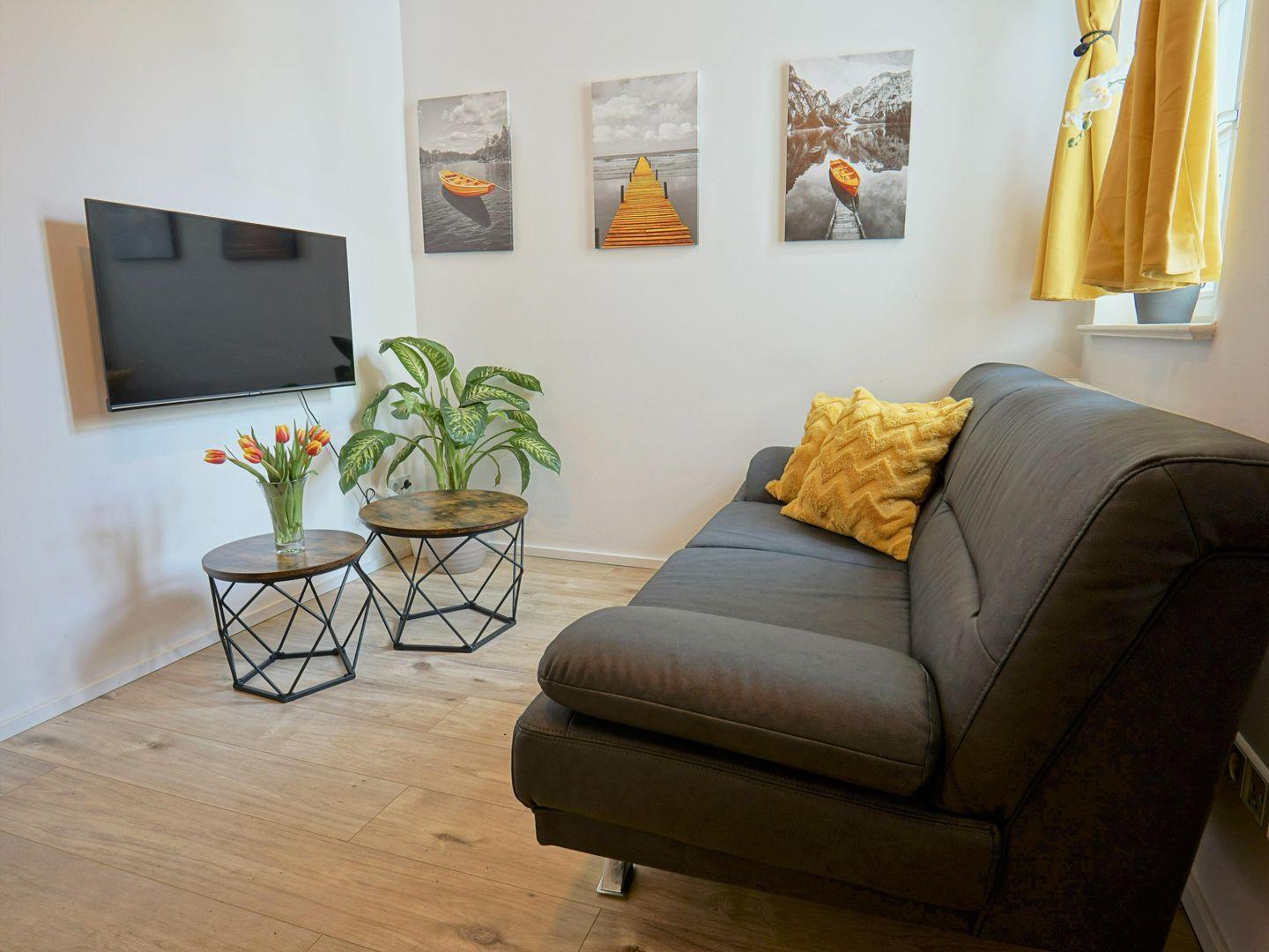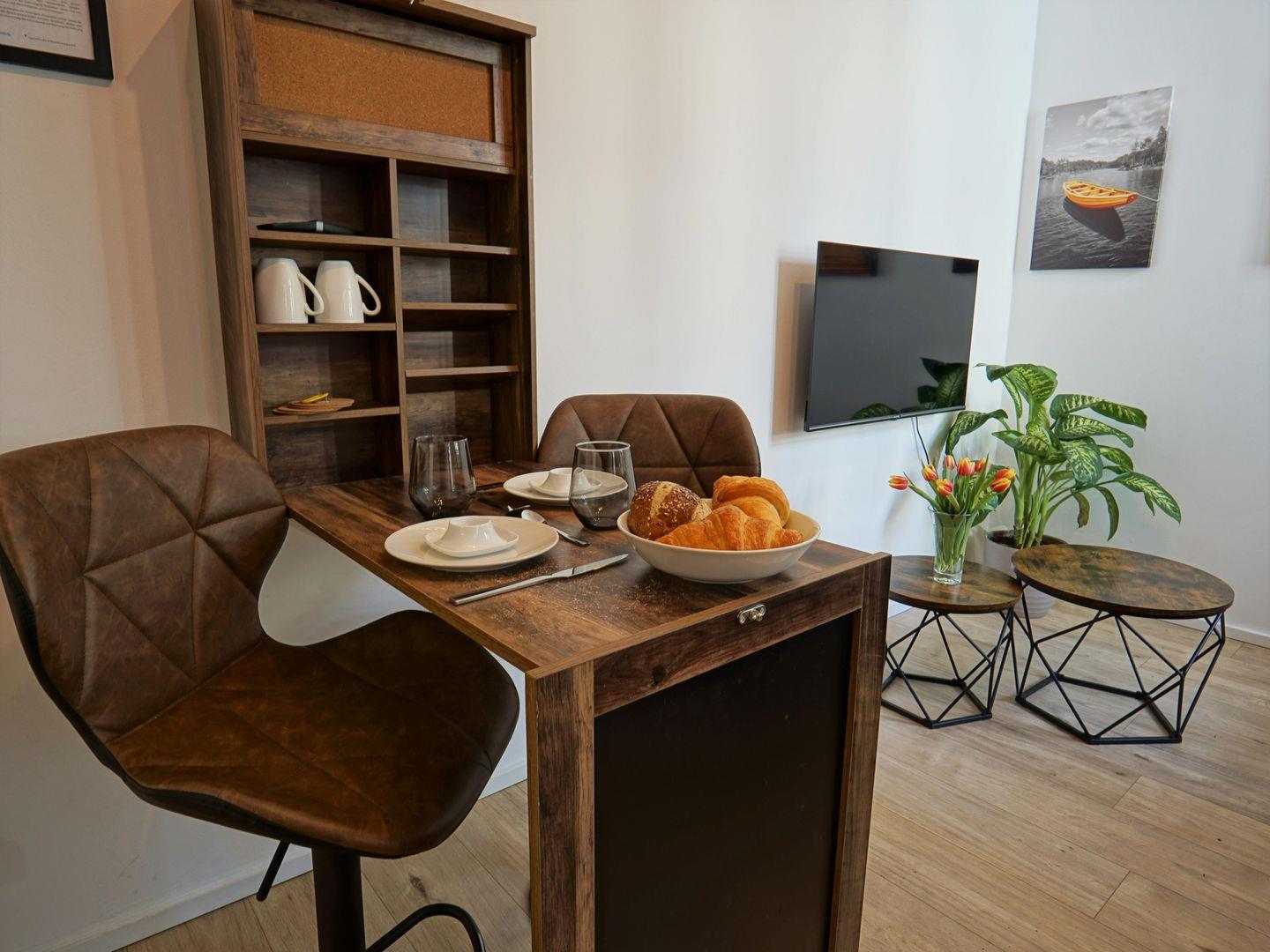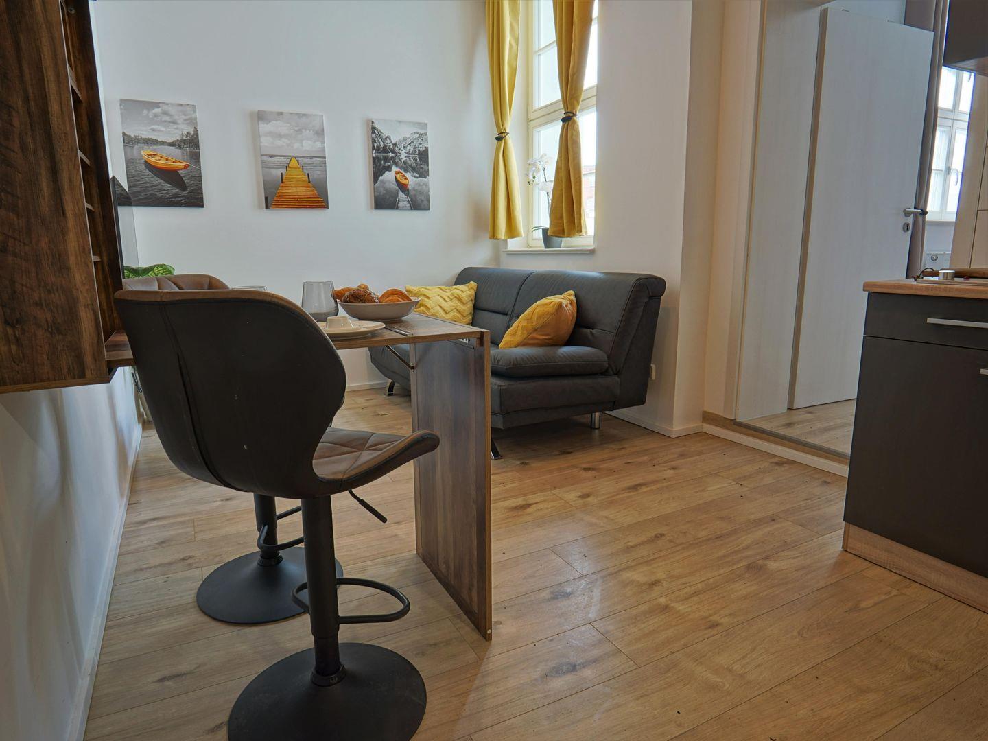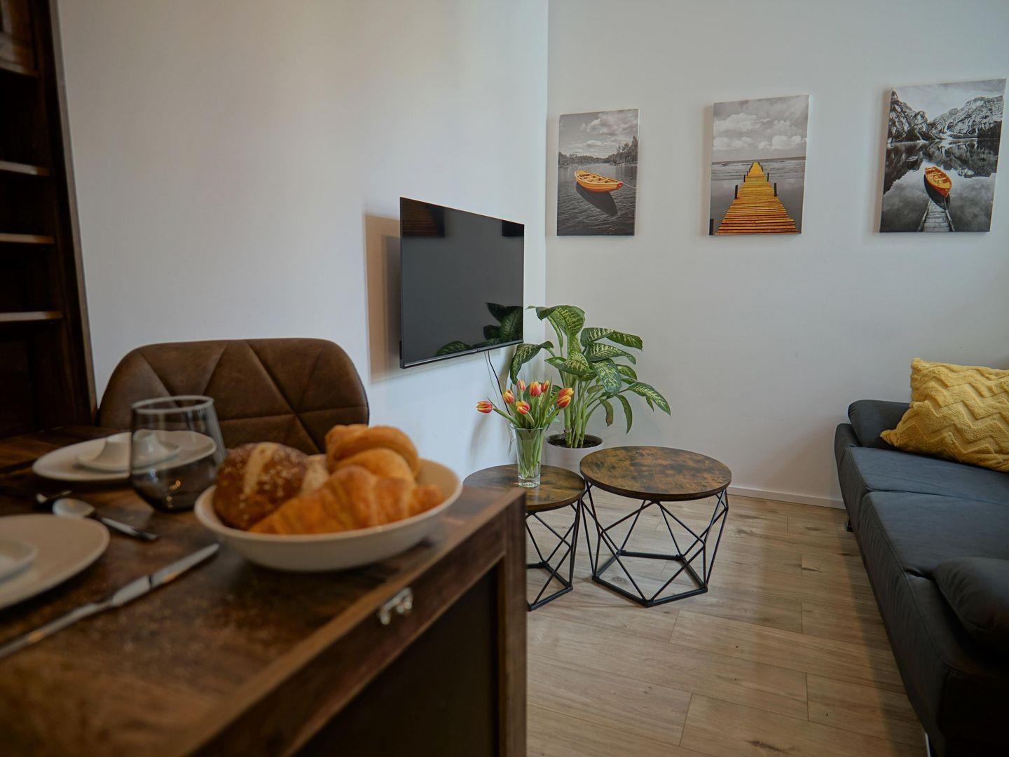 Die Wohnung verfügt über ein helles und freundlich eingerichtetes Wohnzimmer, das mit einer bequemen Sofaecke und einem TV ausgestattet ist. Hier können Sie sich nach einem erlebnisreichen Tag entspannen und Ihre Lieblingssendungen genießen. Der offene Essbereich mit einem großen Esstisch lädt zu geselligen gemeinsamen Abendessen oder Frühstücken ein, wo Sie in aller Ruhe den Start in den neuen Tag genießen können.
