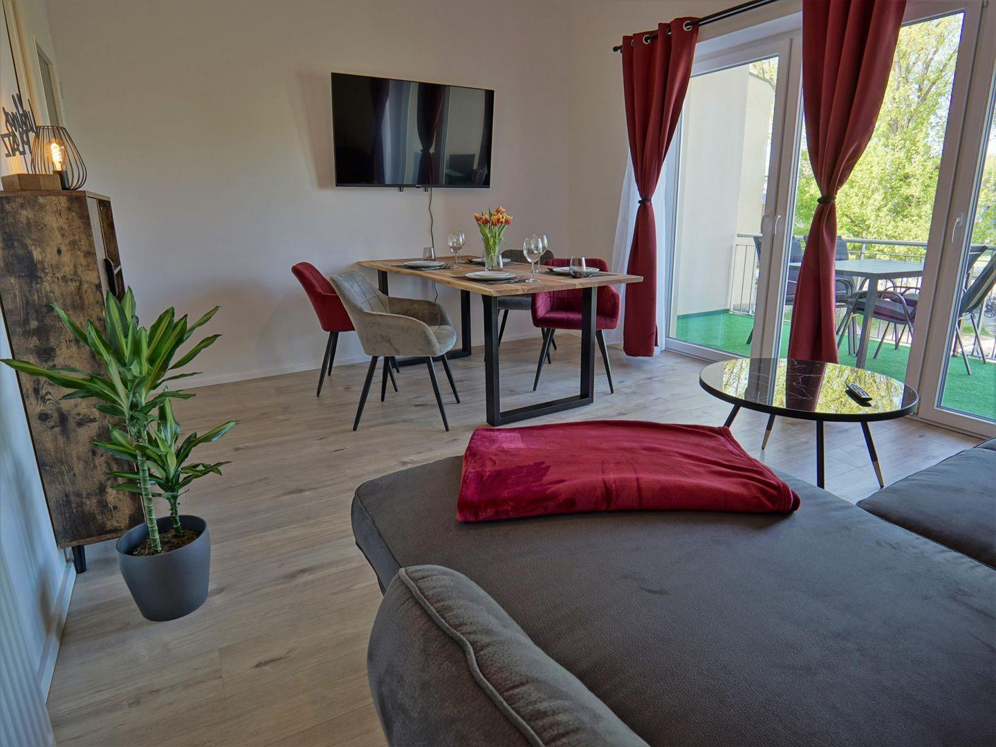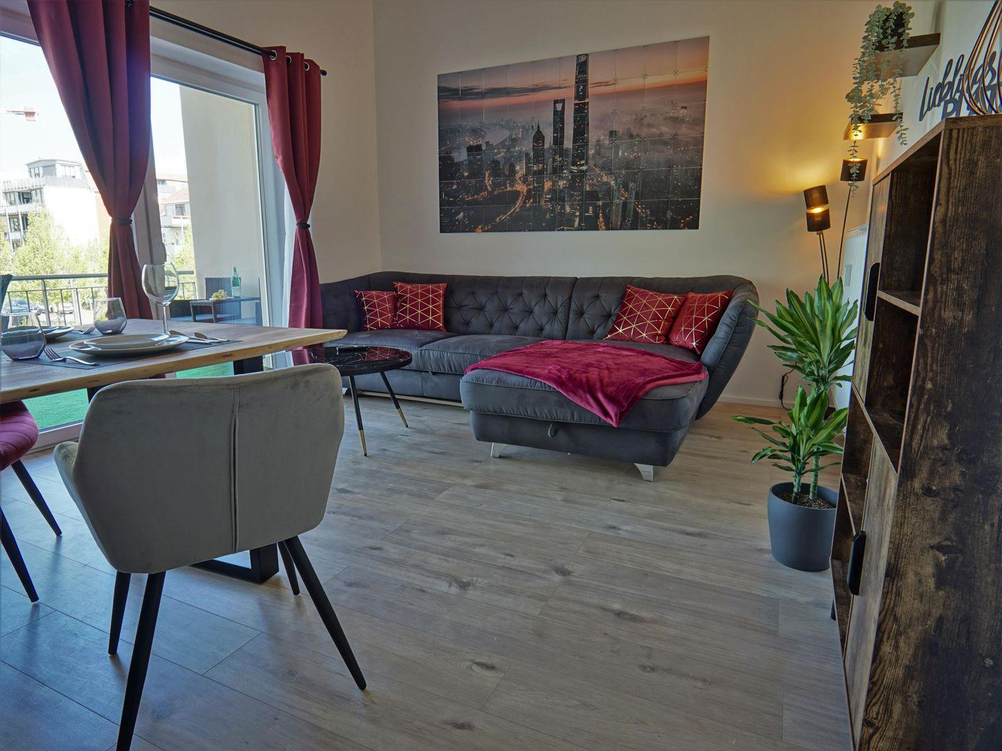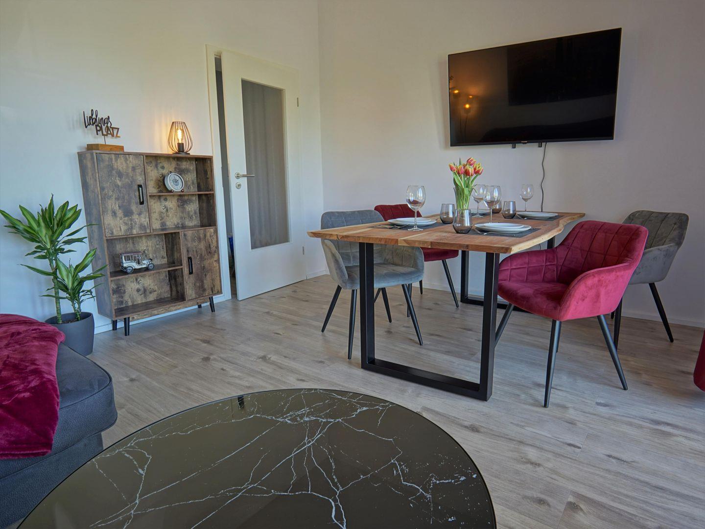 Das Appartement selbst besticht durch eine moderne und ansprechende Gestaltung. Es umfasst zwei Zimmer, darunter ein großzügiges Schlafzimmer mit komfortablen Schlafmöglichkeiten für bis zu vier Personen. Die durchdachte Raumaufteilung ermöglicht eine harmonische Nutzung des Wohnraums. Hier finden Sie ein einladendes Wohnzimmer mit einer Sofaecke, die zum Entspannen und Verweilen einlädt. Ein Esstisch bietet ausreichend Platz, um gemeinsam zu speisen und gesellige Runden zu erleben.