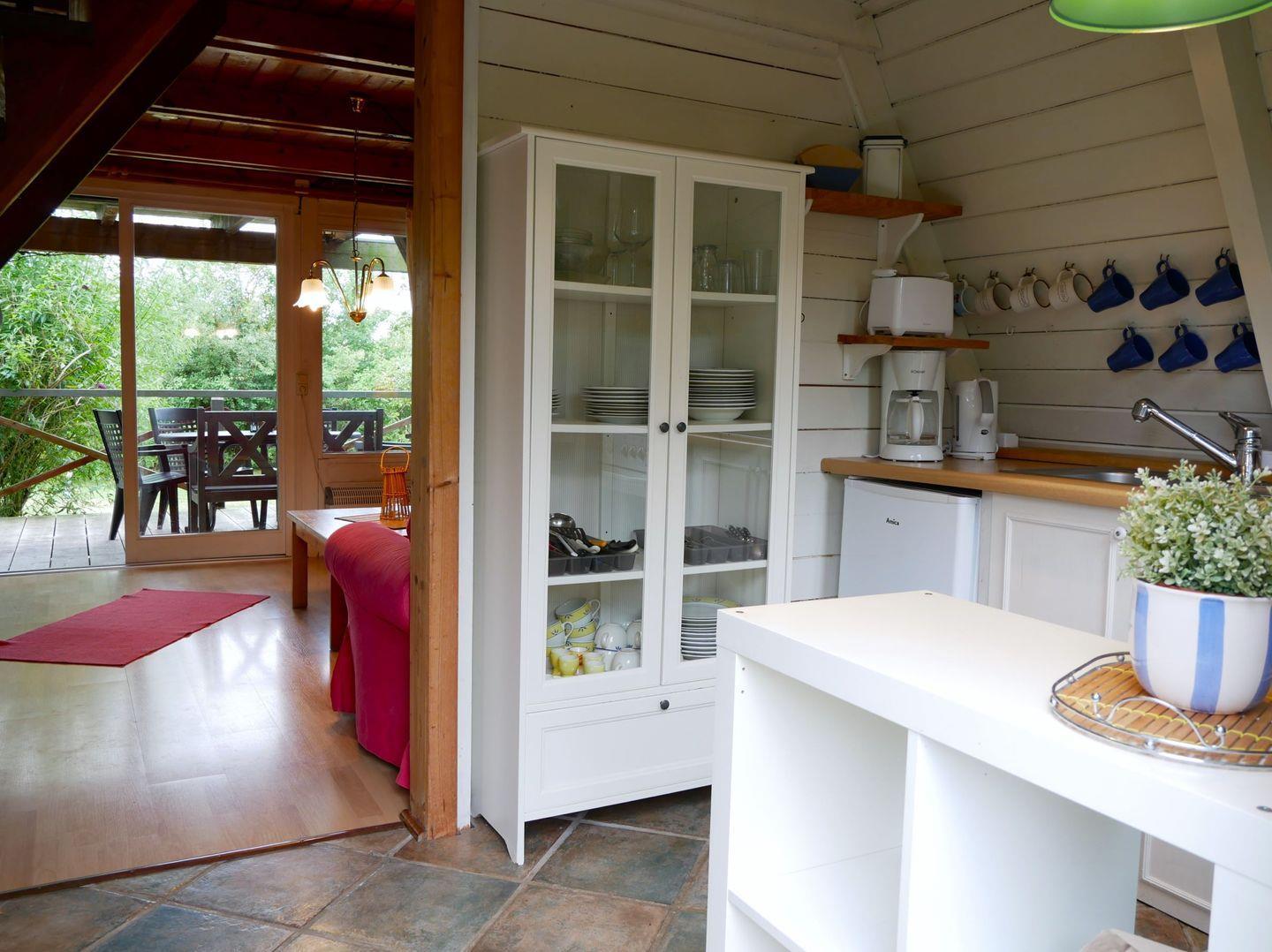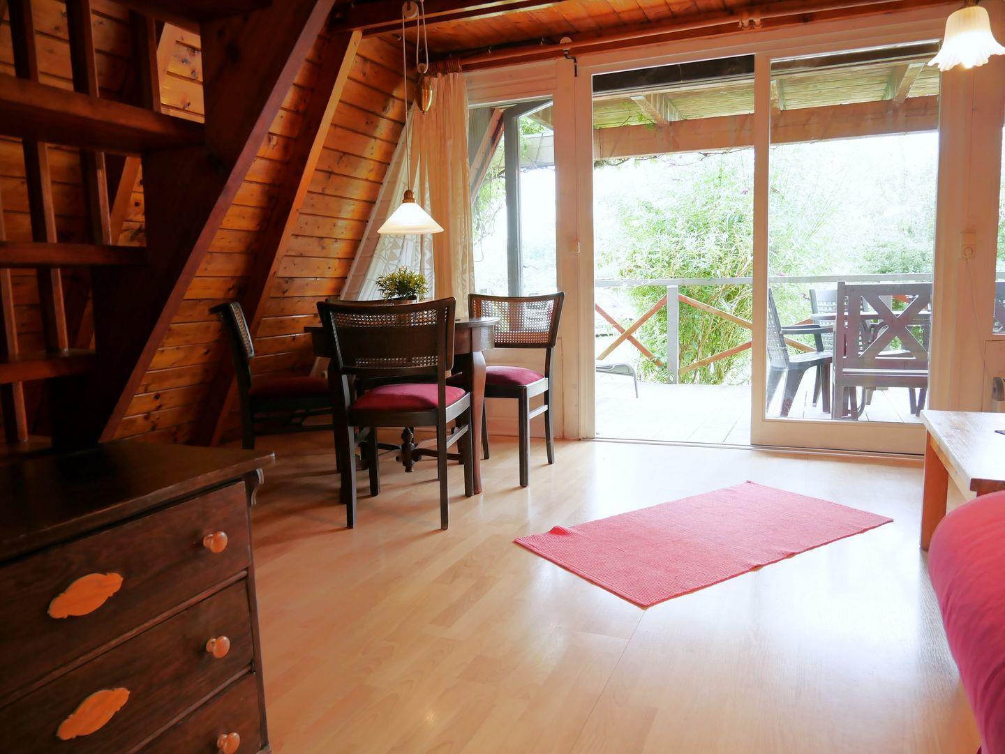 Im kombinierten, rustikal eingerichteten Wohnbereich verfügen Sie über eine Sofaecke mit TV, einen Esstisch und Zugang zur südlich ausgerichteten, überdachten Terrasse, von der aus Sie einen traumhaften Blick auf die umliegende Natur haben.