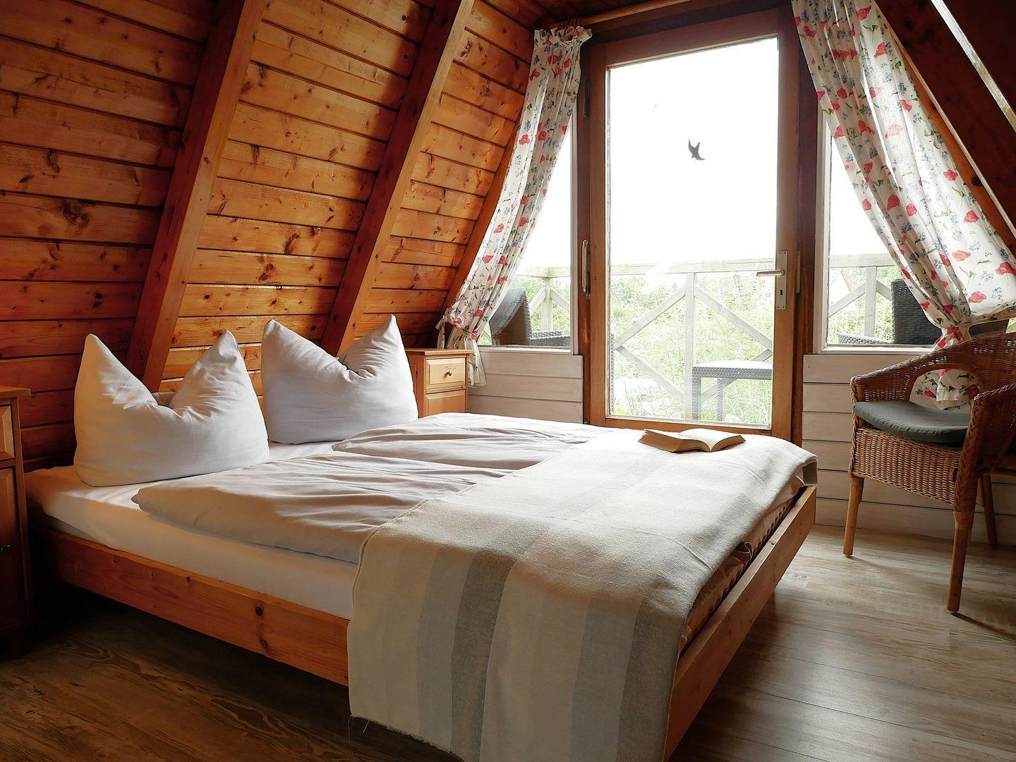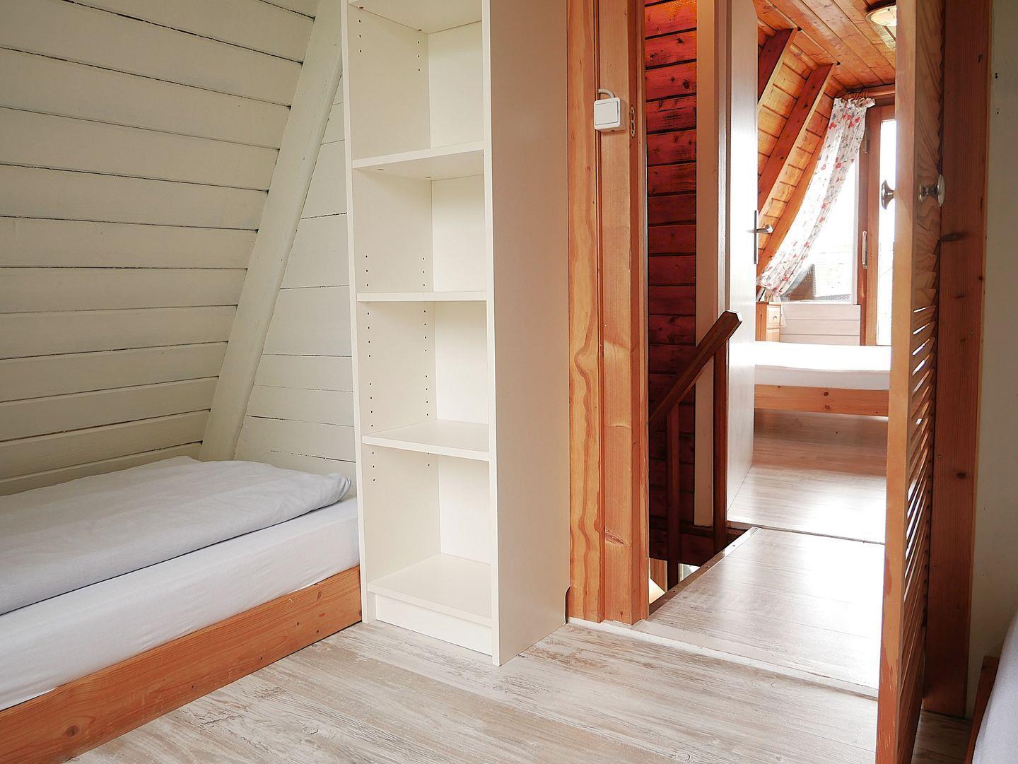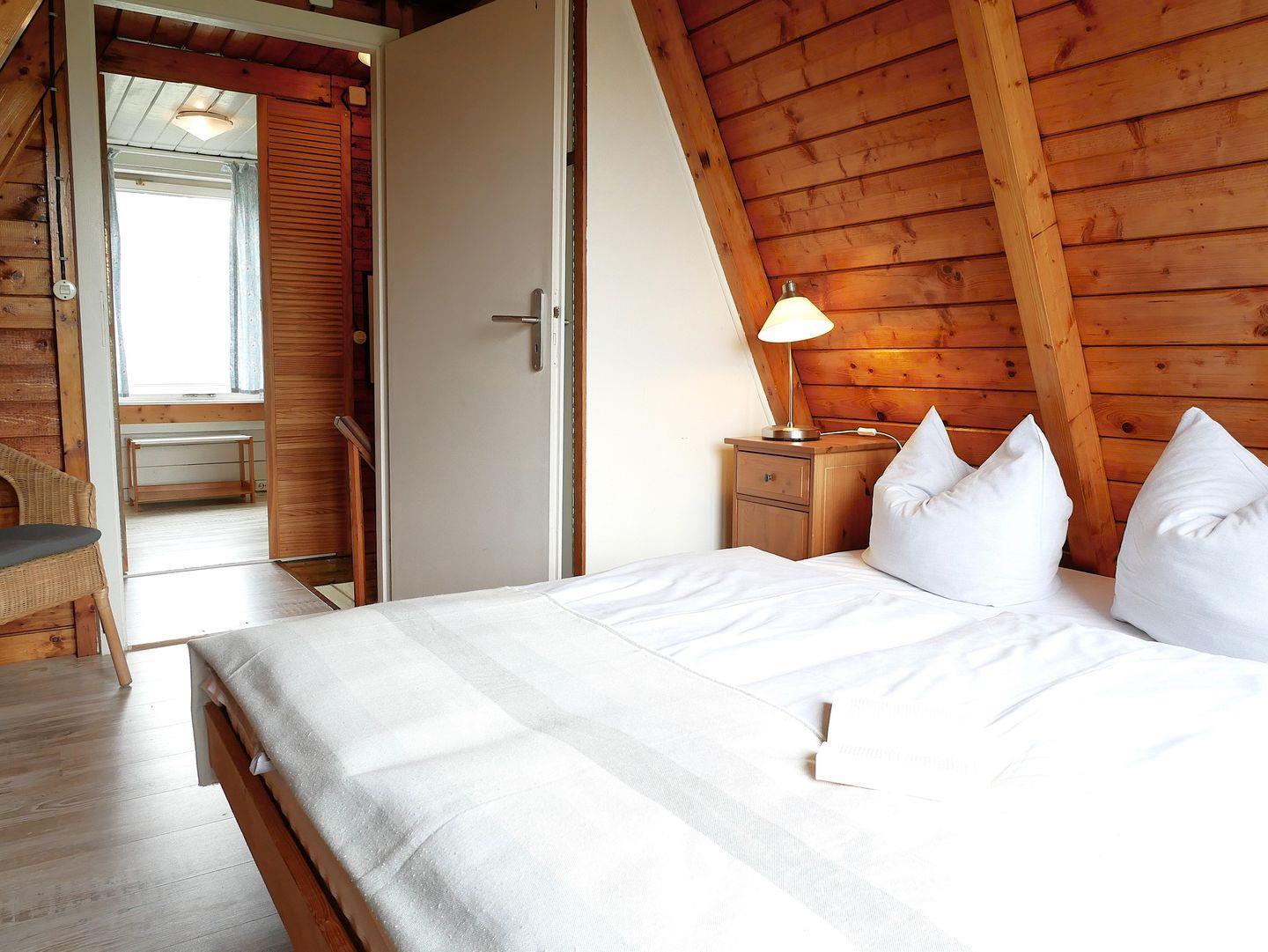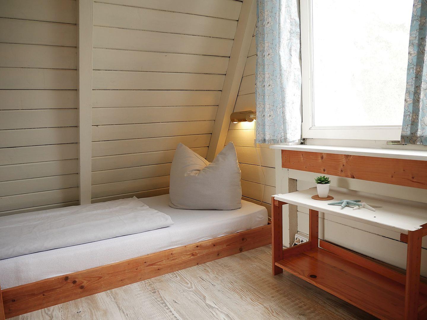 Im Obergeschoss des Hauses befinden sich die beiden separaten Schlafzimmer, die entweder mit einem französischen Doppelbett (160x200 cm) oder zwei Einzelbetten (Bodenbetten 90x190 cm) ausgestattet sind. Für Ihre Garderobe steht ebenfalls Stauraum zur Verfügung. Das Hauptschlafzimmer bietet Ihnen außerdem einen Balkon in südlicher Ausrichtung mit Meerblick auf dem Sie entspannte Stunden genießen können.