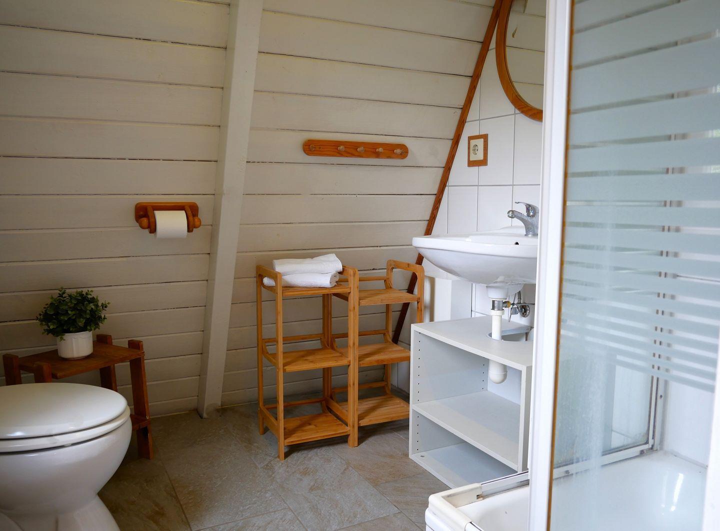 Das Tageslicht-Badezimmer ist mit einer Dusche, Waschtisch und WC ausgestattet und befindet sich in der unteren Etage.