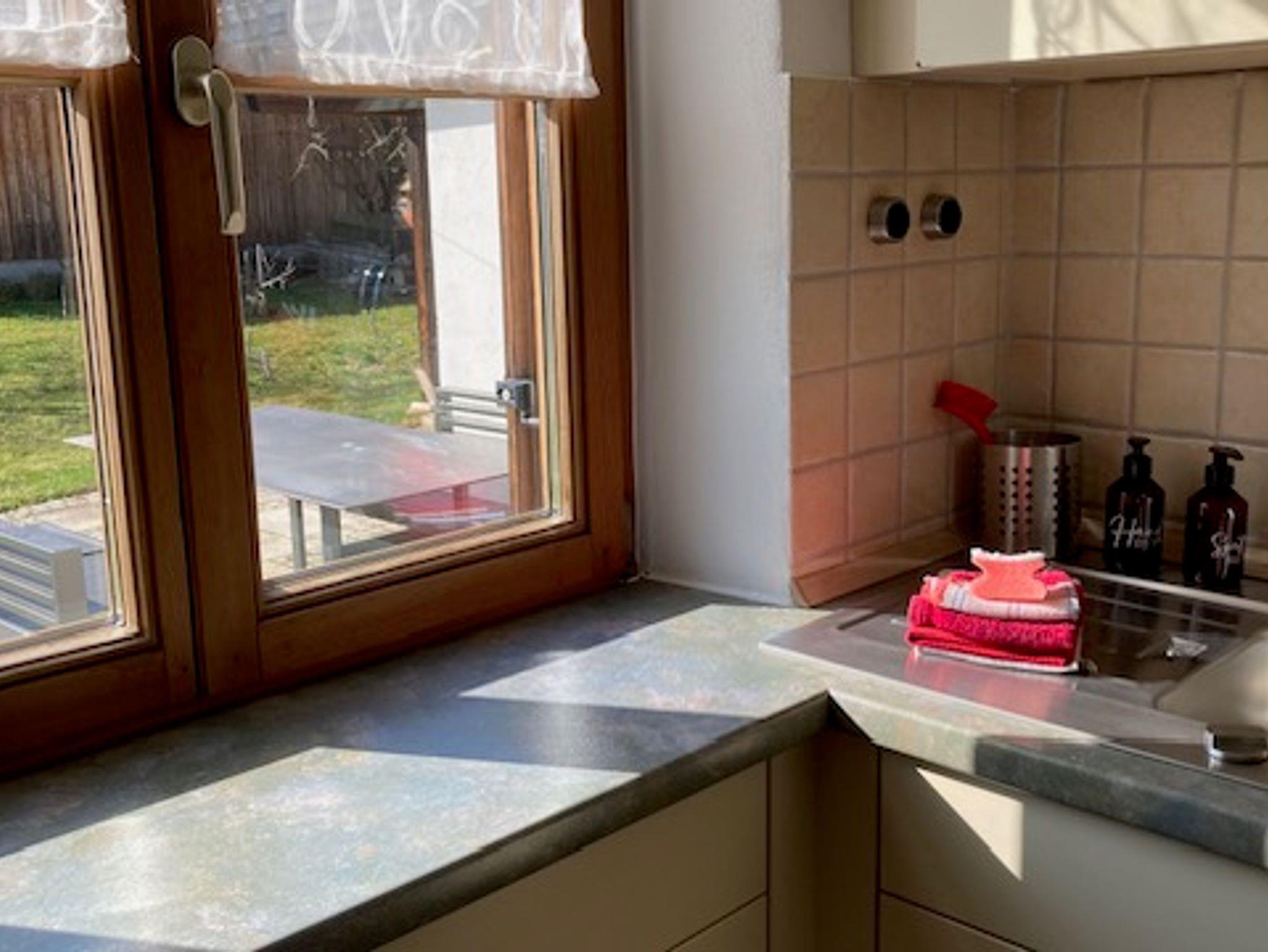 Die Wohnung liegt im EG und hat direkten Zugang zur Ostterrasse (25 m²) mit Blick auf das Naturdenkmal Biber (einer Nagelfluhgesteinsanhöhe mit Wallfahrtskirche). Die gemütliche 51 m² Wohnung besteht aus: Essküche mit maßgeschreinerter Eckbank, Einbauküche mit Geschirrspüler, Schlafzimmer mit Doppelbett 1,80x2,00m Liegefläche und neuem Flachbildfernseher Wohnzimmer mit hochwertiger Klappschlafcouch (Liegefläche 1,80m x 2,00m), Gaskachelofen und neuem Flachbildfernseher, kleines Bad mit Dusch-Badewanne, Fön und ausreichend Stauraum, Flur mit Garderobe. Besonderes Highlight ist der neue rustikal strukturierte Eichenholzparkett, der in den Wohnräumen und Essküche verlegt wurde.