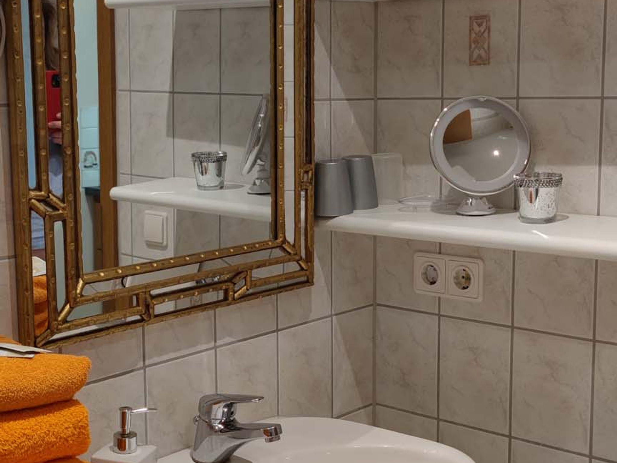 Im Badezimmer befindet sich eine Dusche, WC, Handtücher, Waschbecken mit Spiegel/Kosmetikspiegel, Handtuchtrockner und einen Föhn.