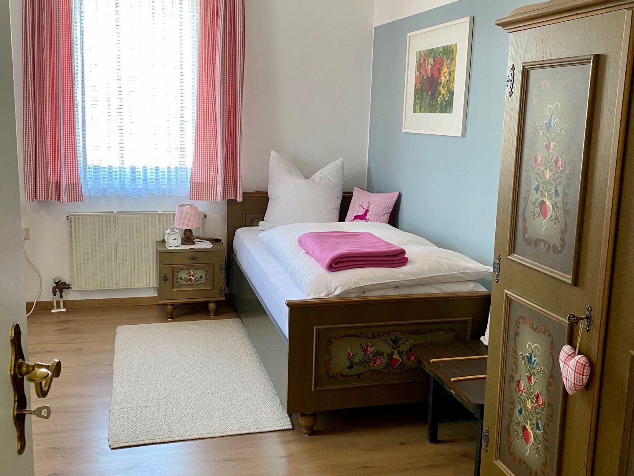 Schöne, gepflegte, geräumige 90m² große 3 Zimmer Ferienwohnung im bayerischen Stil im 1. OG. 3 Balkone mit Sitzgelegenheiten, 2 Schlafzimmer mit je einem Bad / Dusche / WC. 1 Schlafzimmer mit Doppelbett und das 2te Schlafzimmer mit Einzelbett (Zustellbett und ein Baby-Gitterbett ist möglich). In jedem Zimmer befindet sich ein Flachbild TV. Das Wohnzimmer ist mit einer bayerischen Essecke ausgestattet. Die moderne Küche verfügt über einen Geschirrspüler, Backofen, Ceranfeld, Kühlschrank mit Gefrierfach. In der Diele befindet sich ein Garderobenschrank, es gibt einen Abstellraum und kostenloses WLAN. Im Haus befindet sich eine Damenboutique.