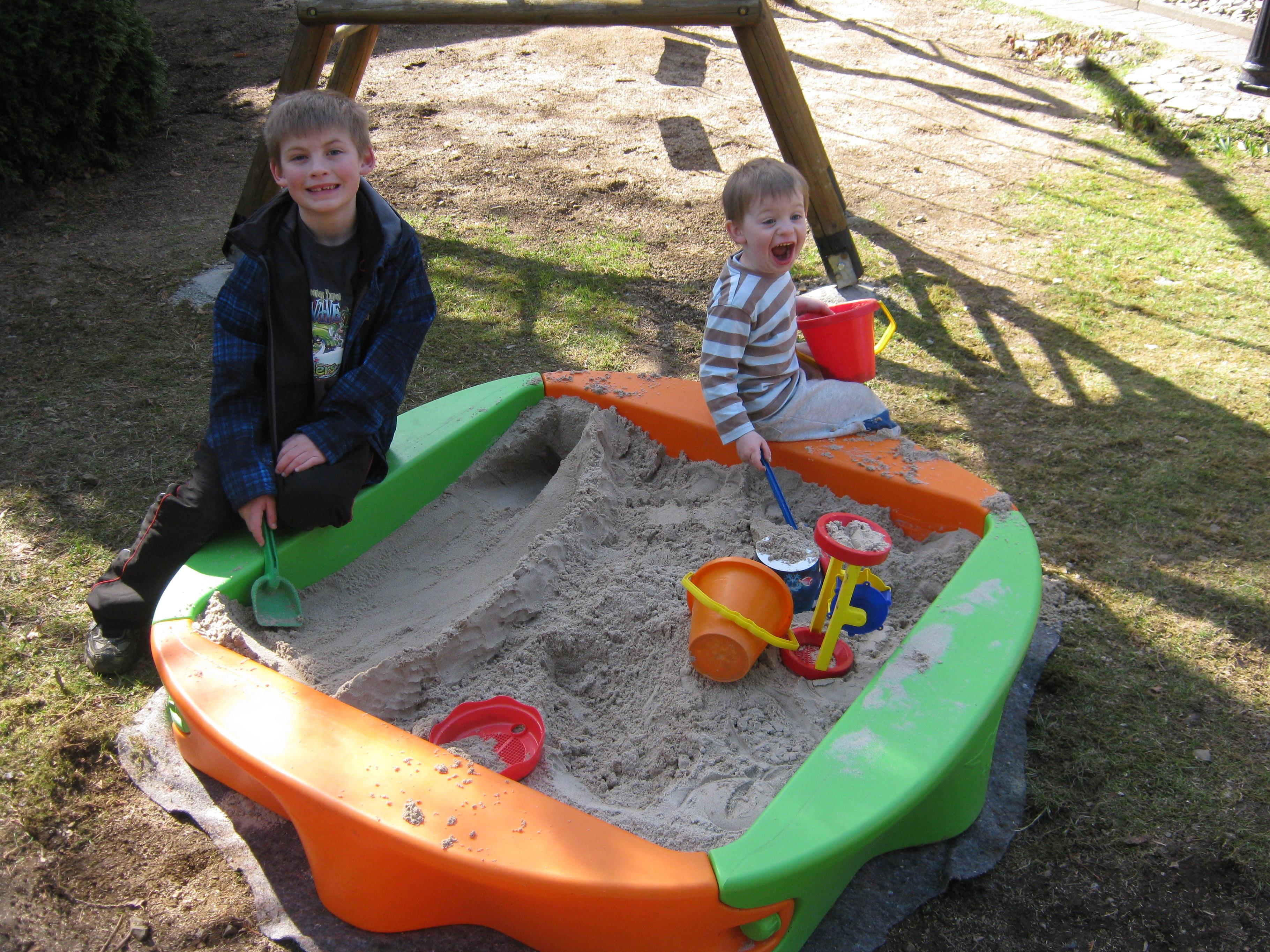 Sandkasten mit viel Spielzeug