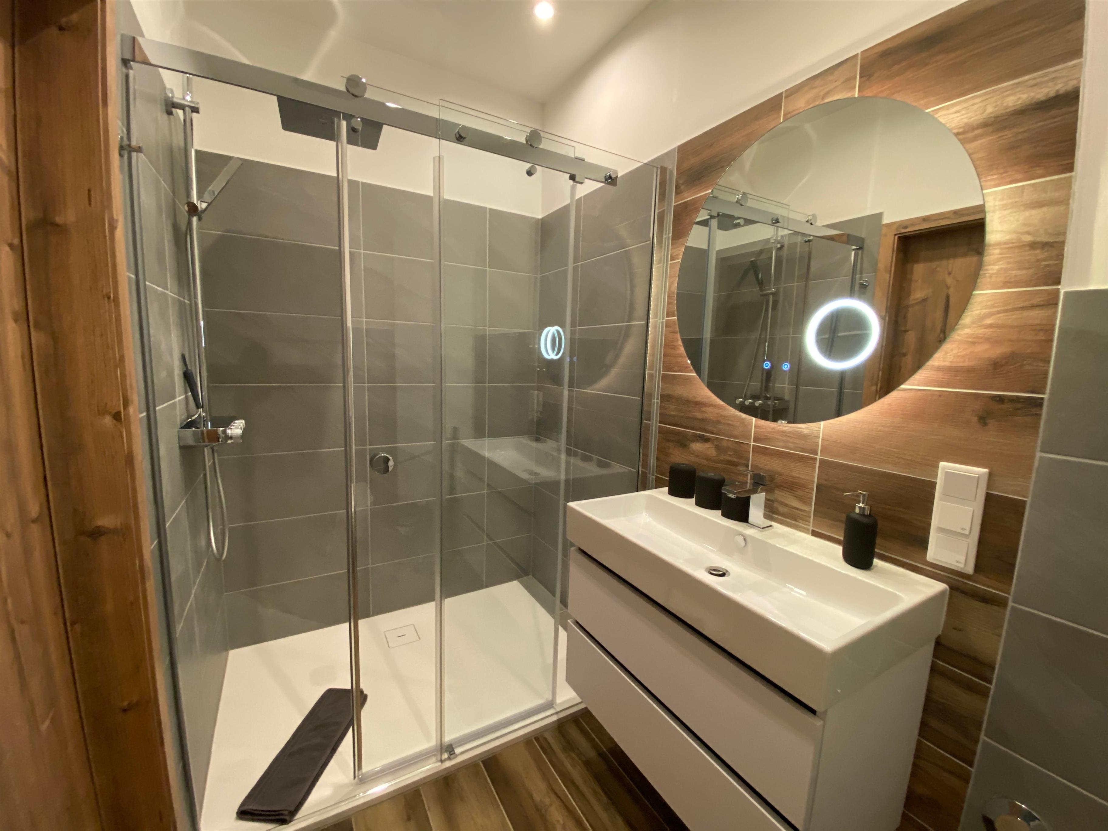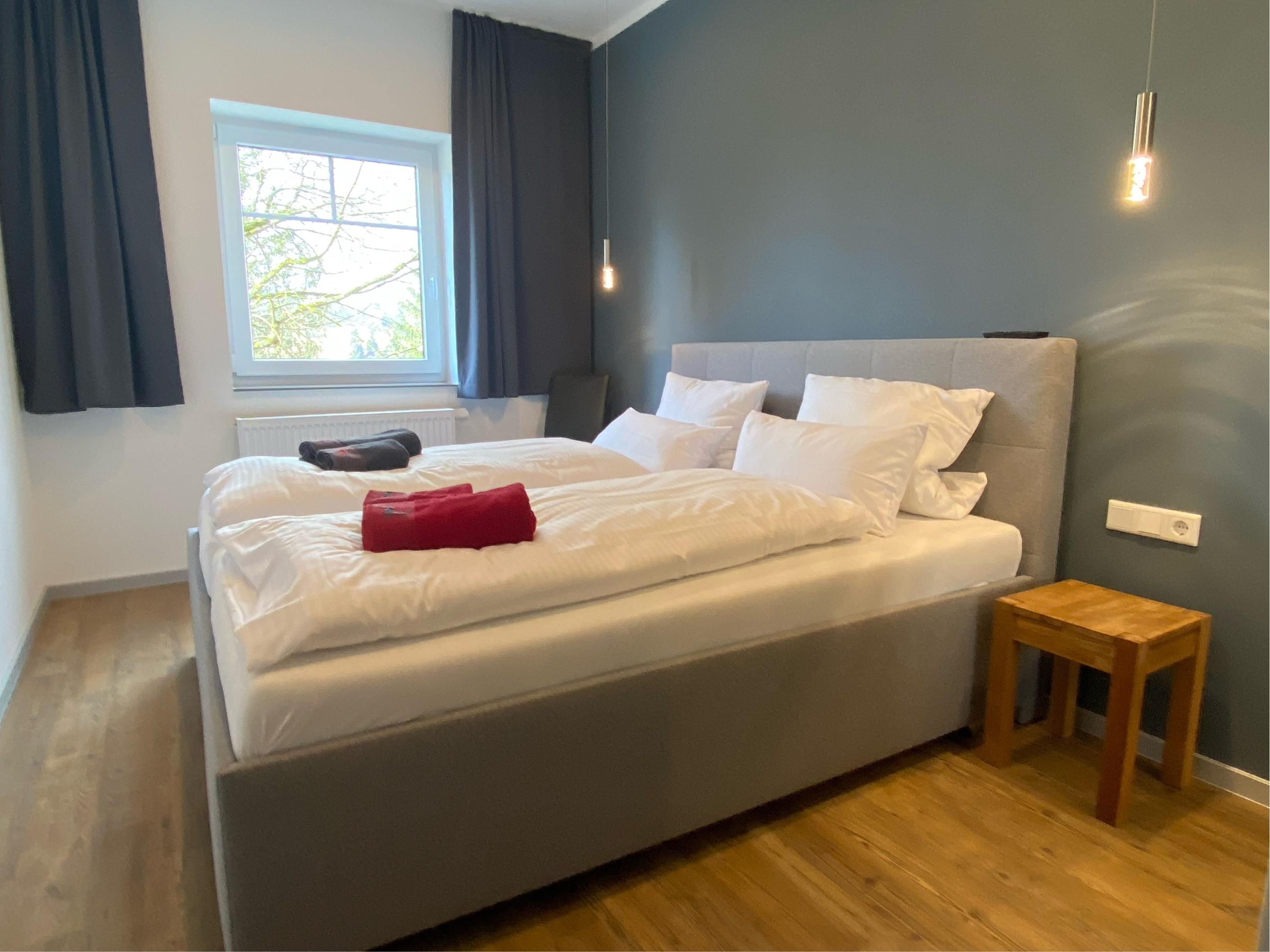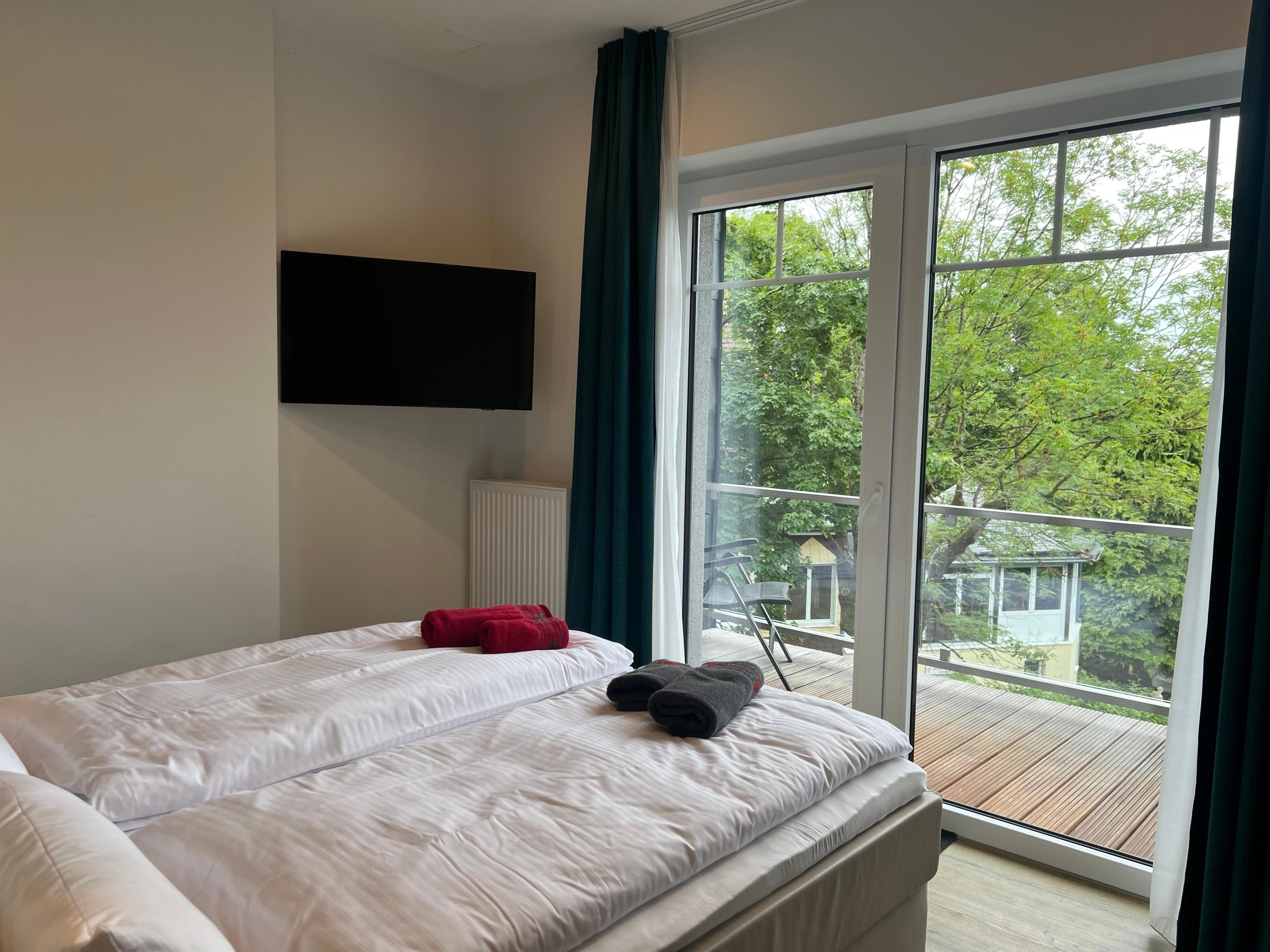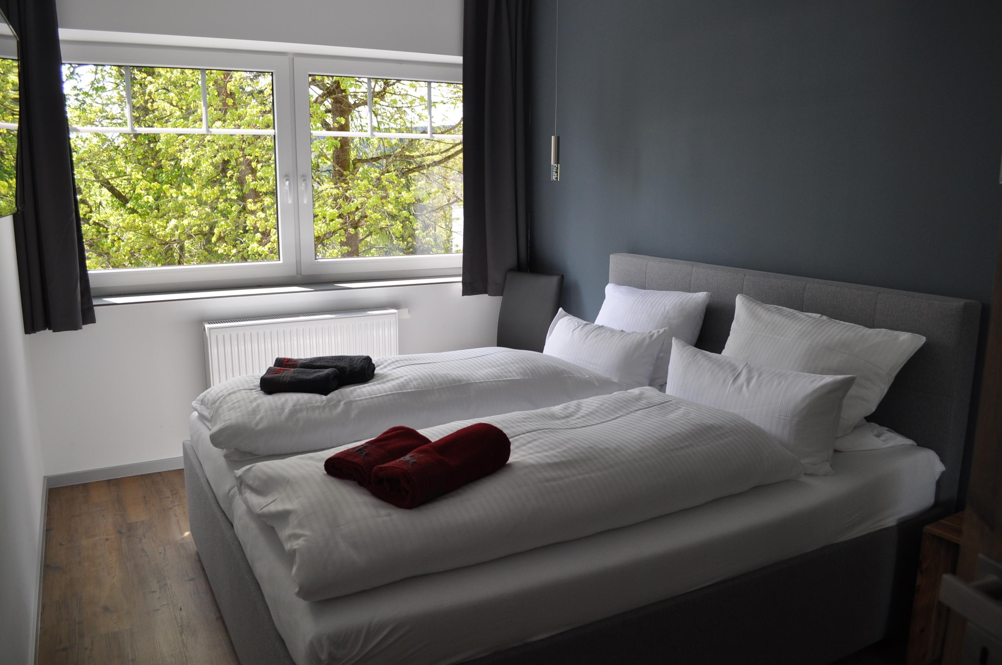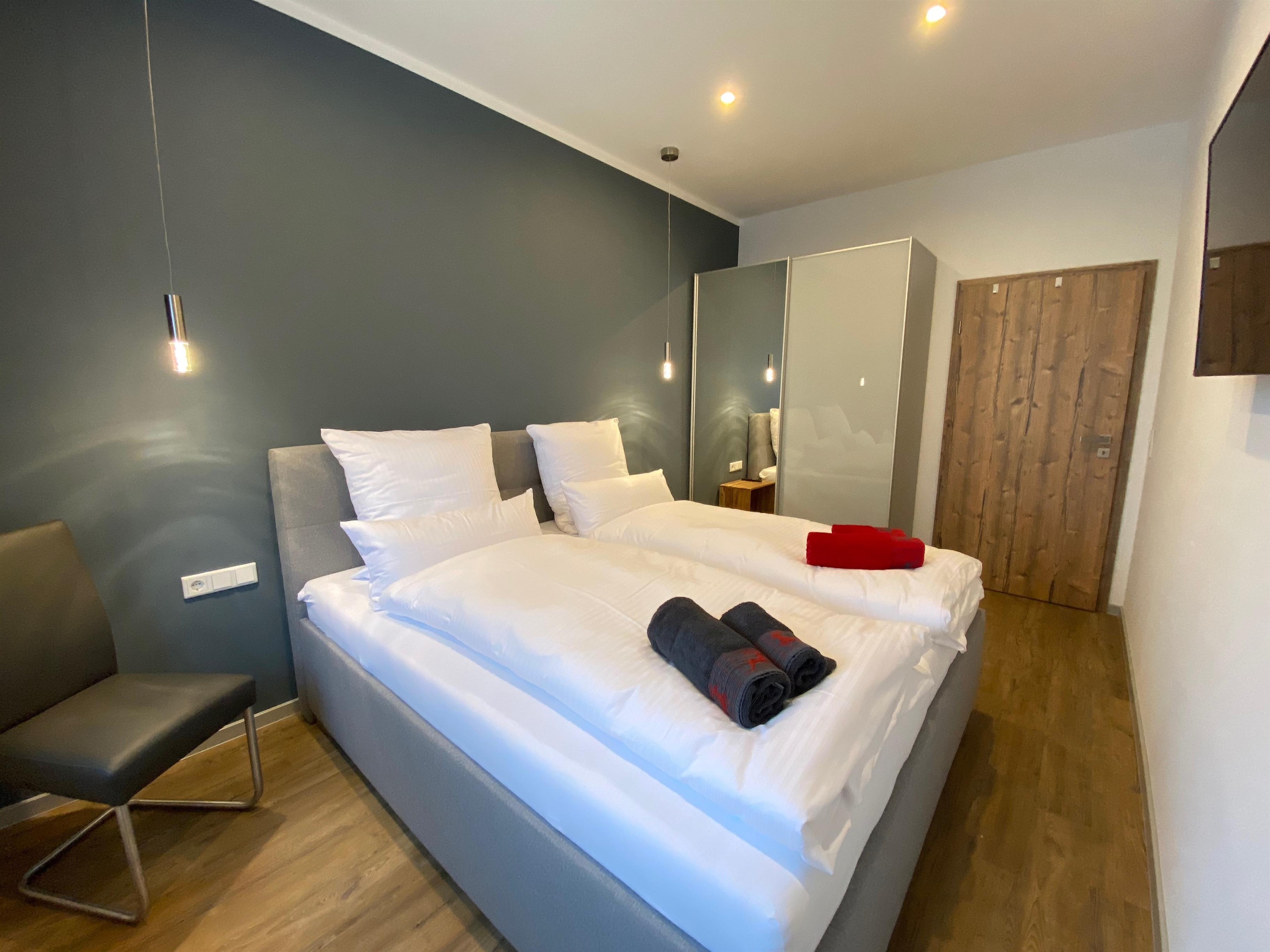 Diese Luxussuite befindet sich im 1. OG, ist für 6 Personen ausgelegt und ist ca. 104 qm groß. Es verfügt über eine Wohnzimmer mit Esstisch, eine Küche, zwei Bädern mit Regendusche eines zus. mit Badewanne, drei Schlafzimmern, zwei Südbalkonen und einer Sauna. Von den Balkonen haben sie einen Blick in den Garten. Die Doppelbetten verfügen auf der rechten Seite über eine Matratze mit Härtegrad 3 und auf der linken Seite mit Härtegrad 4.