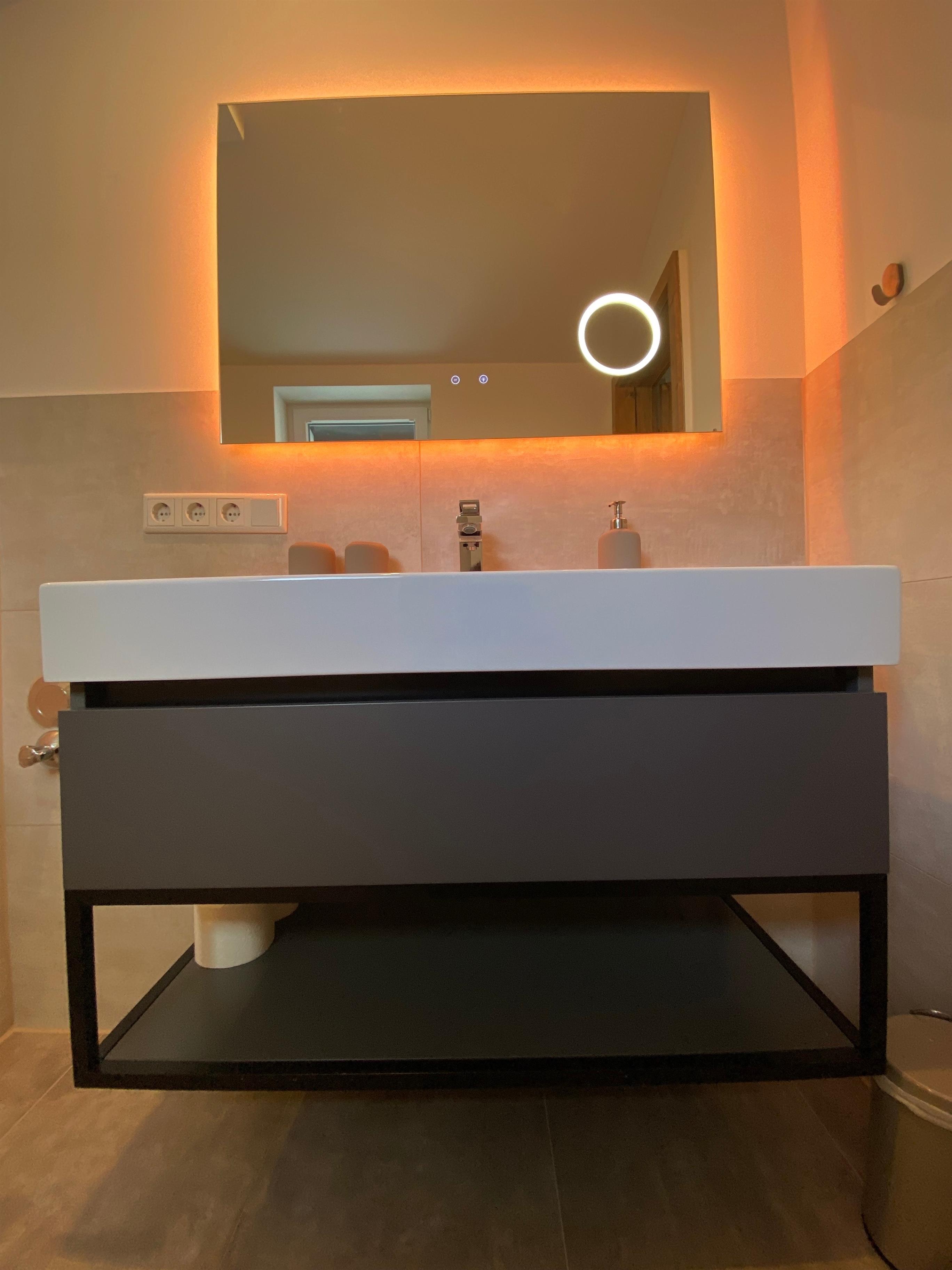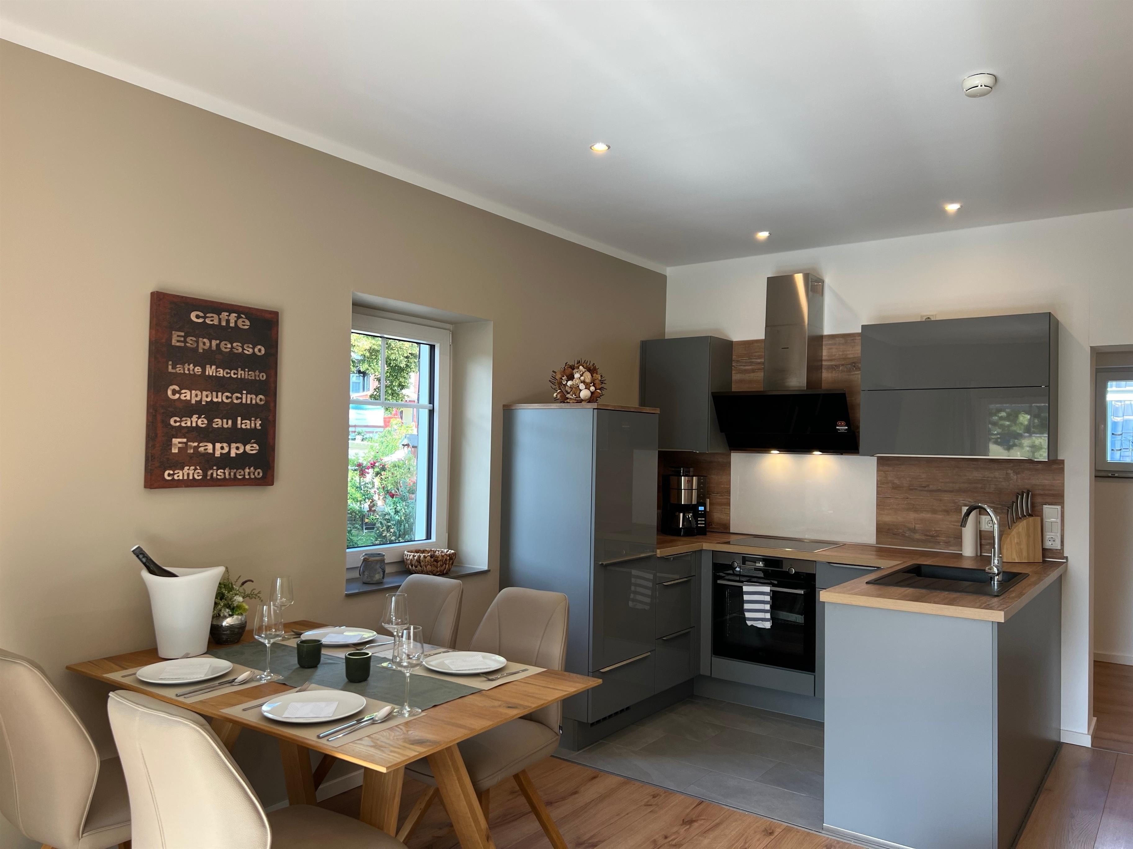 Es ist eine hochwertige Küche mit Geschirrspüler, Backofen und Induktions-Kochfeld verbaut. Die Ausstattung der Küche lässt keine Wünsche offen, u. a. finden Sie eine Auswahl an Gewürzen vor.
