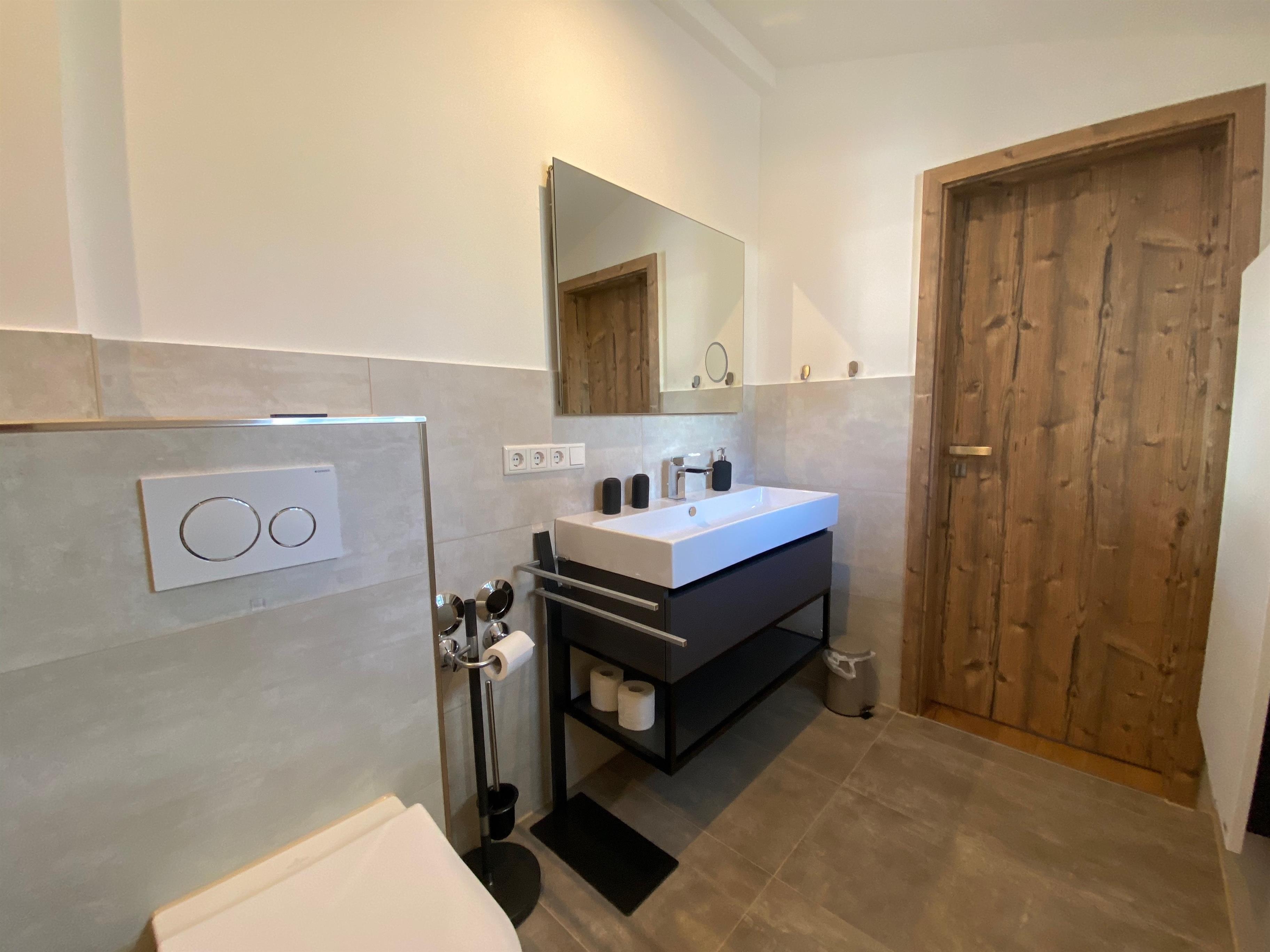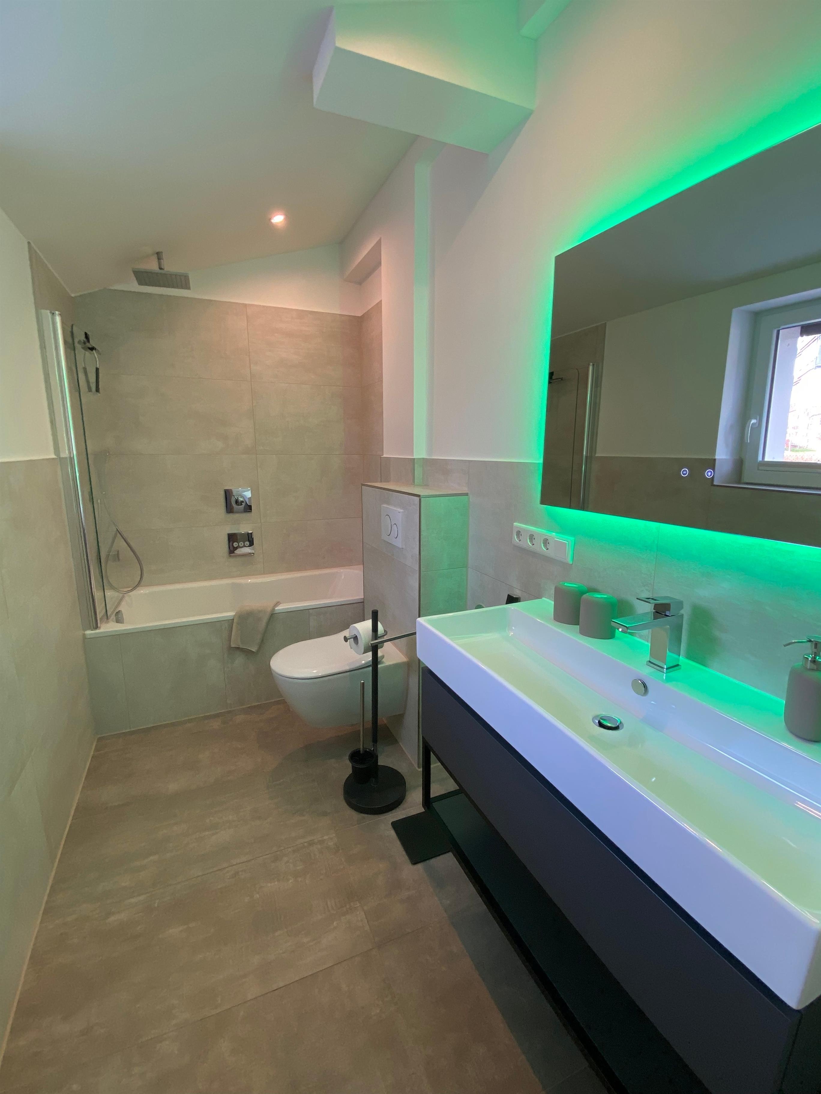 Ensuite-Bad. Ein Bad hat ein Badewannen/Duschkombination mit Regendusche.