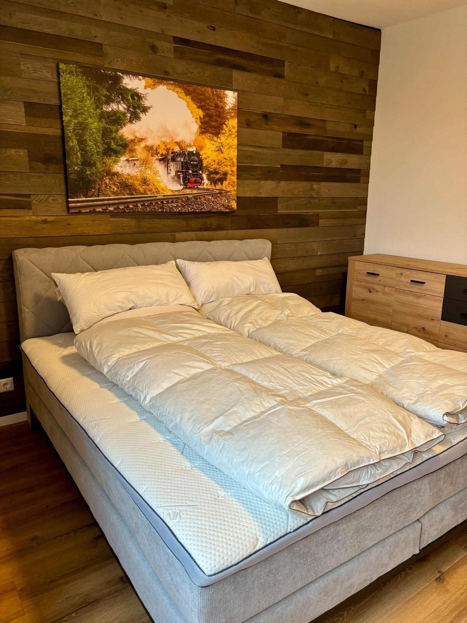 Die Wohnung Stadtblick befindet sich im Erdgeschoss und hat eine Größe von ca. 110 m². Sie verfügt über 2 Schlafzimmer, jeweils mit einem komfortablen Doppelbett (Boxspring) und 1 Schlafzimmer, dass mit zwei Einzelbetten ausgestattet ist.