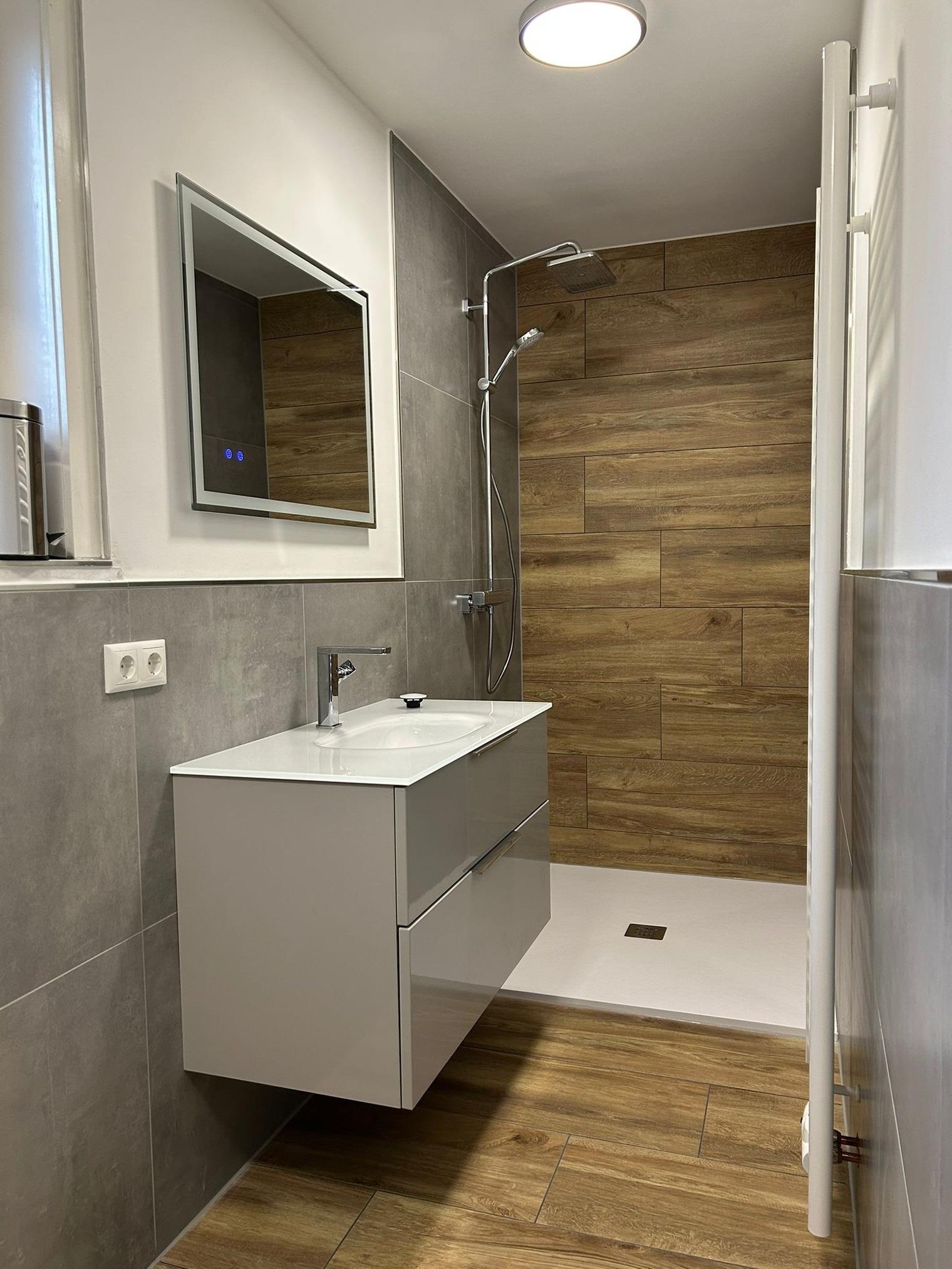 Der Wohnraum beinhaltet eine vollausgestattete Küche für Selbstversorger, ein gemütliches Wohnzimmer mit TV und Kaminofen sowie zwei moderne Badezimmer mit bodentiefer begehbarer Dusche und einem Haarföhn.