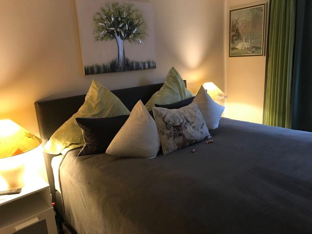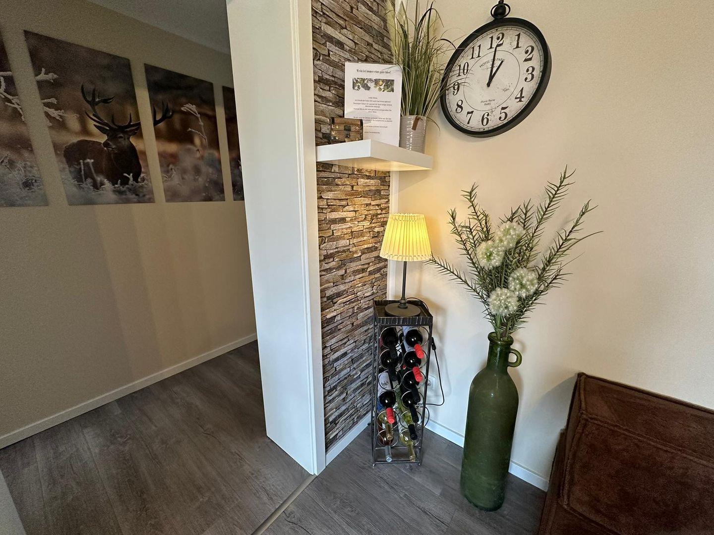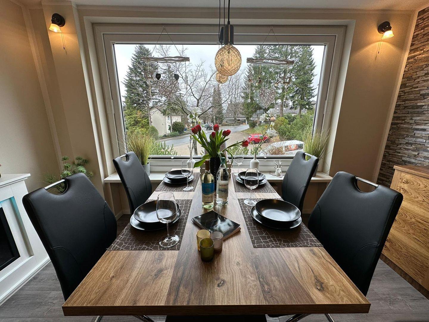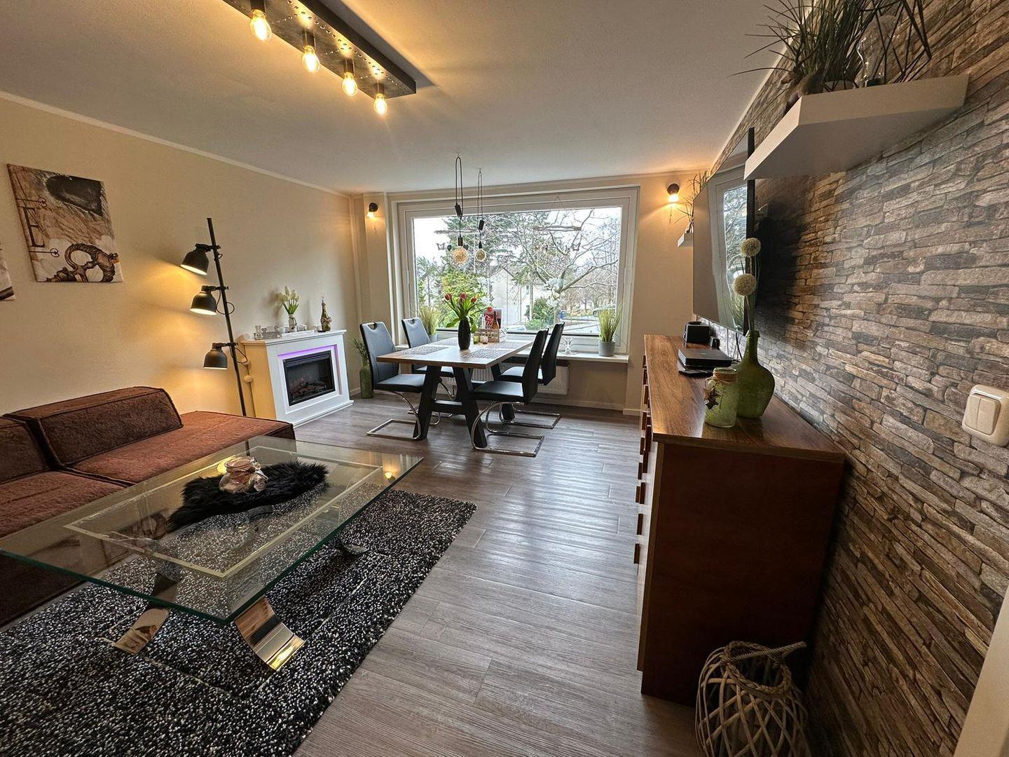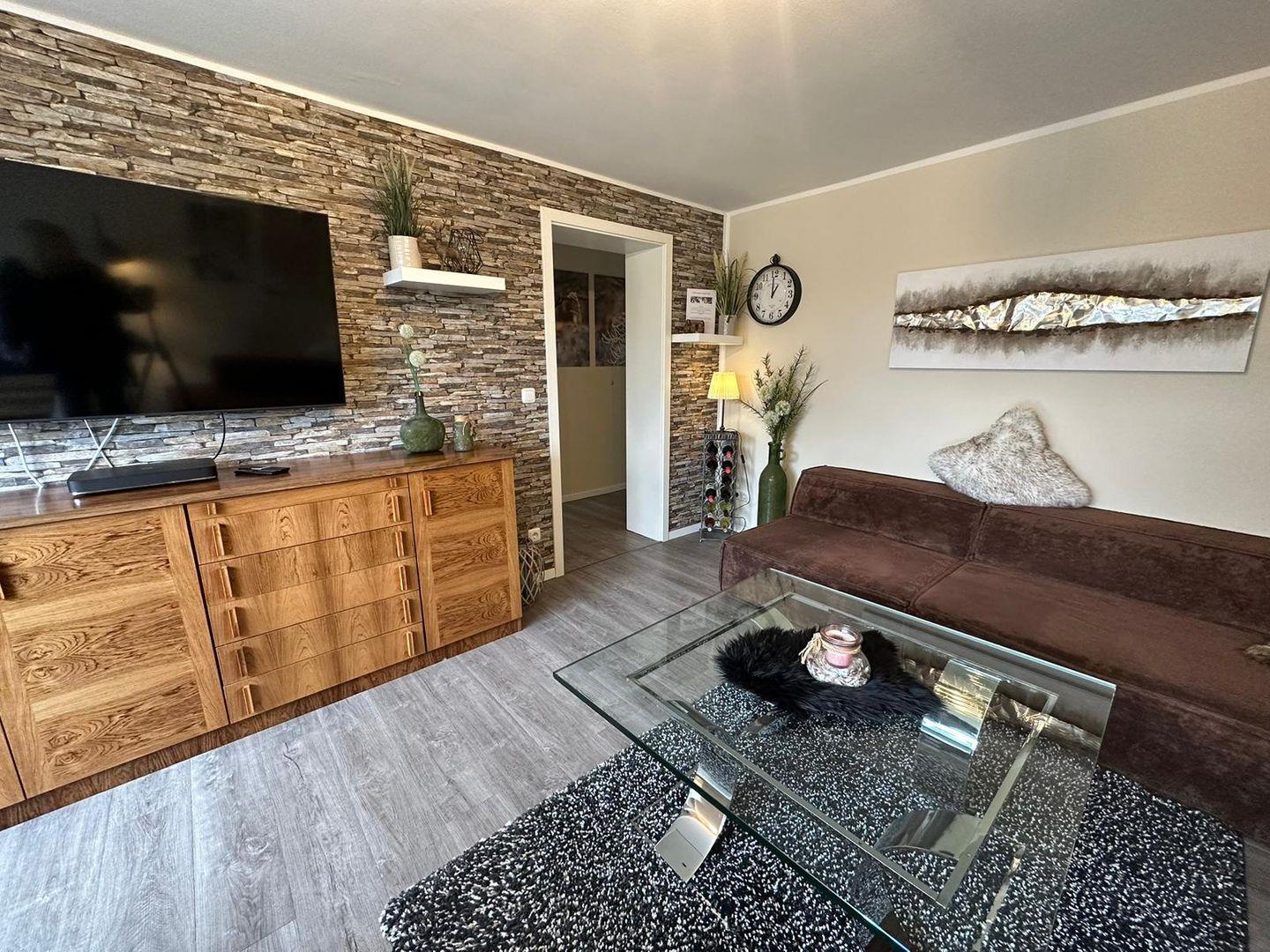 Das Herzstück der Wohnung bildet der große Wohnbereich, in dem sich eine gemütliche Sofaecke befindet. Hier können Sie entspannte Abende mit einem guten Film auf dem großen TV, der über Kabelanschluss verfügt, verbringen. Zudem sorgt der Kamin für eine wohlige Atmosphäre an kalten Winterabenden. Der Essbereich ist ideal für gemeinsame Mahlzeiten und bietet genug Platz für alle Gäste.