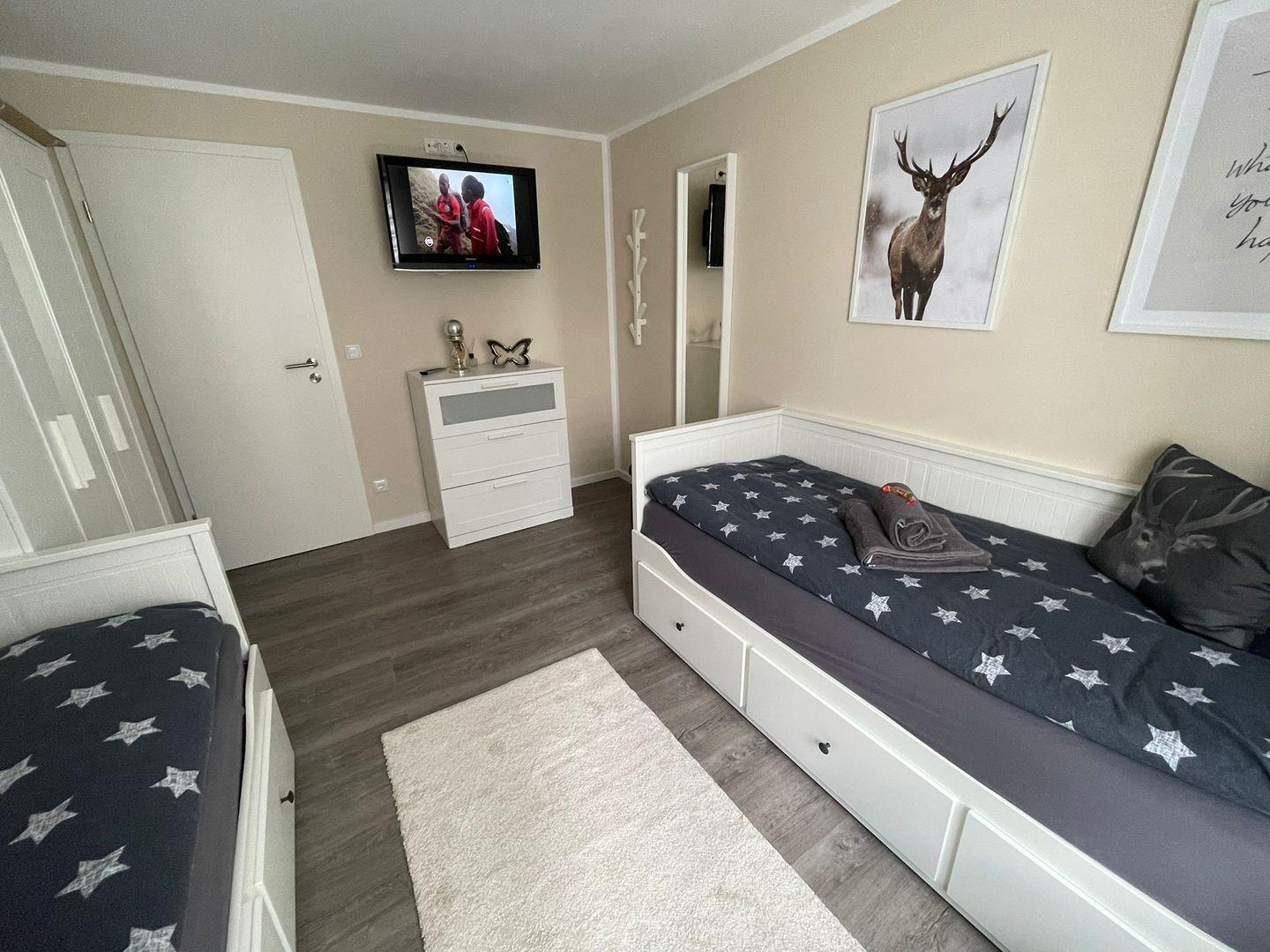 Die Unterkunft ist modern und stilvoll eingerichtet und wurde zuletzt im Jahr 2022 renoviert. Sie wartet mit zwei komfortablen Schlafzimmern auf, die für einen erholsamen Schlaf sorgen. Eines der Schlafzimmer bietet Platz für bis zu drei Personen, während das zweite Schlafzimmer ideal für zwei Personen ist. Die lichtdurchfluteten Räume sind mit Vinylböden ausgestattet, die nicht nur pflegeleicht, sondern auch angenehm warm unter den Füßen sind.