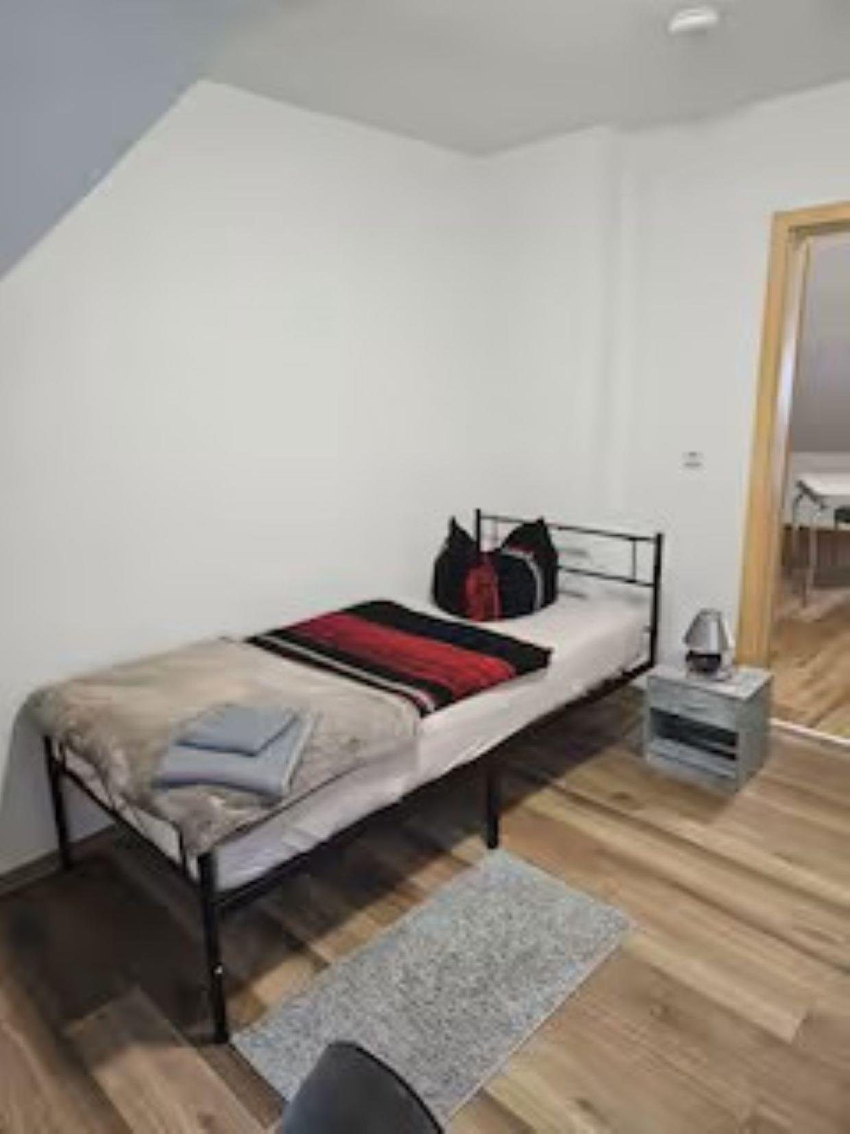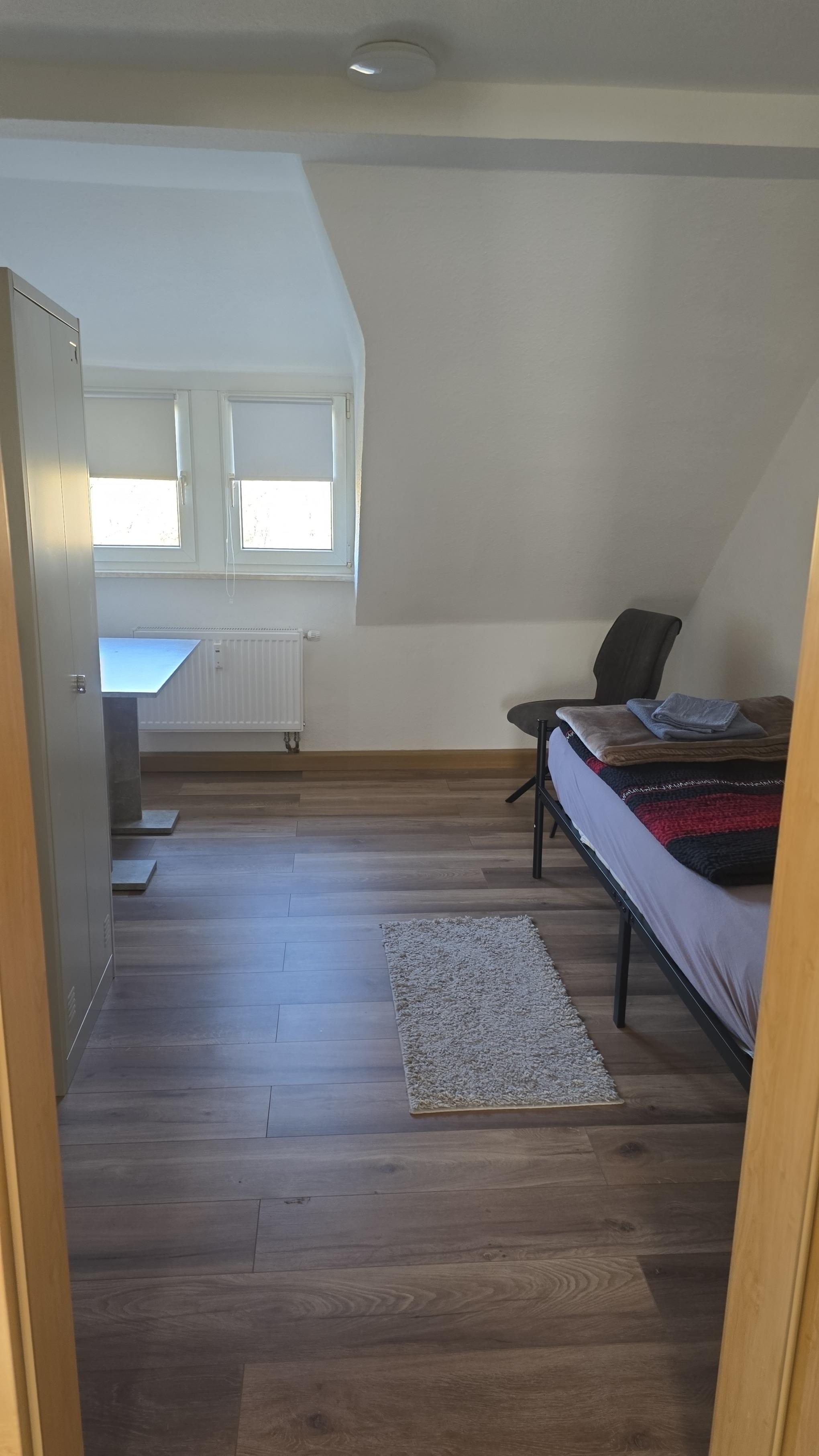 Jedes Zimmer verfügt über 1 oder 2 Einzelbetten 90x200 mit H4 Taschenfederkernmatratze, Kleiderschrank, Nachttischrank mit Nachttischlampe, Schreibtisch + Stuhl, Wäscheständer , Mülleimer. Insgesamt gibt es 2 Schlafzimmer.