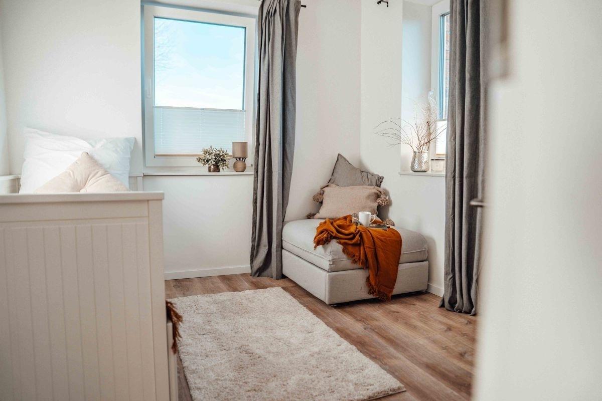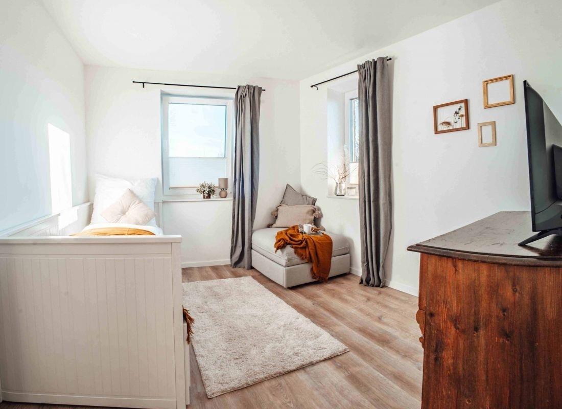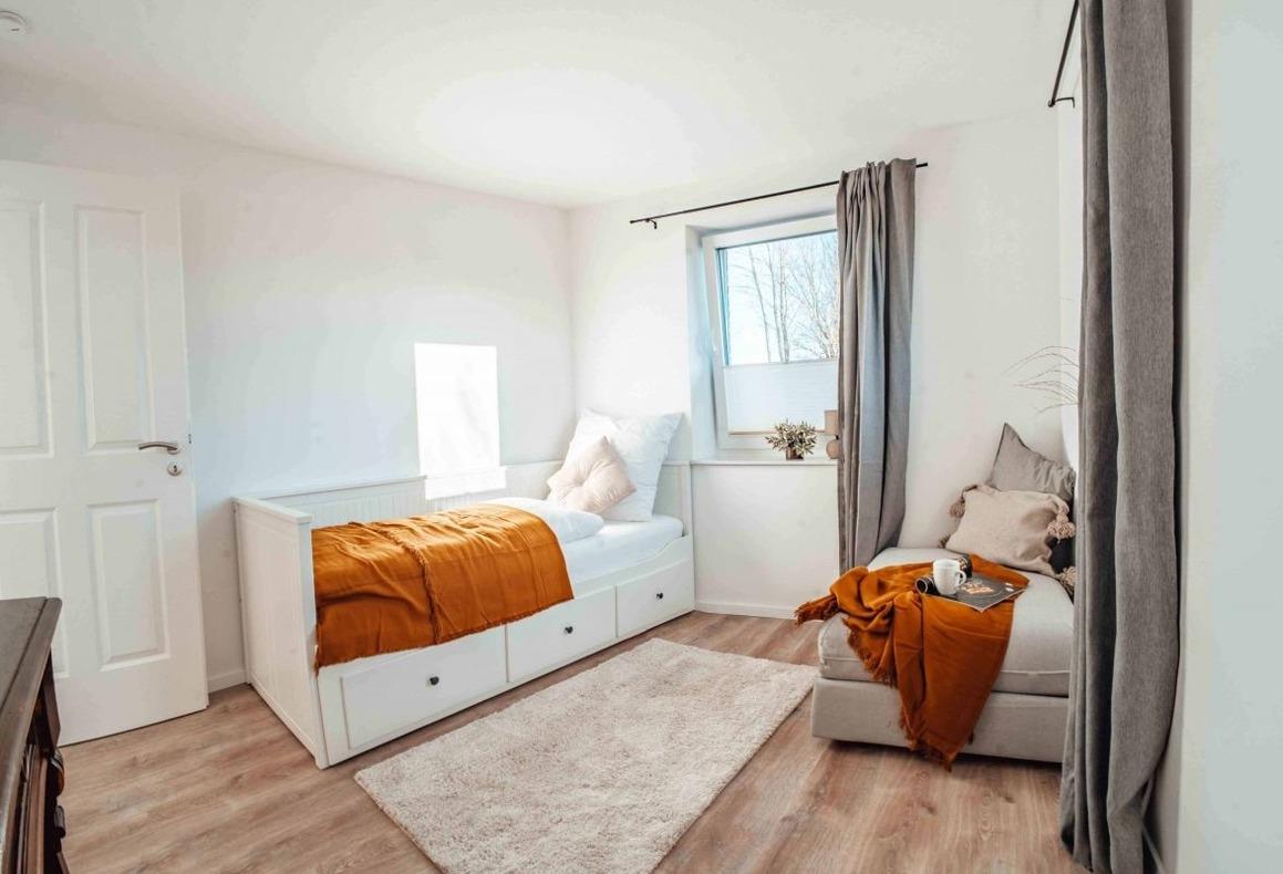 Es gibt zwei Schlafzimmer. Das Hauptschlafzimmer mit Doppelbett (180x200cm) und auch das kleinere Schlafzimmer mit zwei Einzelbetten (90x200cm) bestechen durch den Blick ins Grüne.