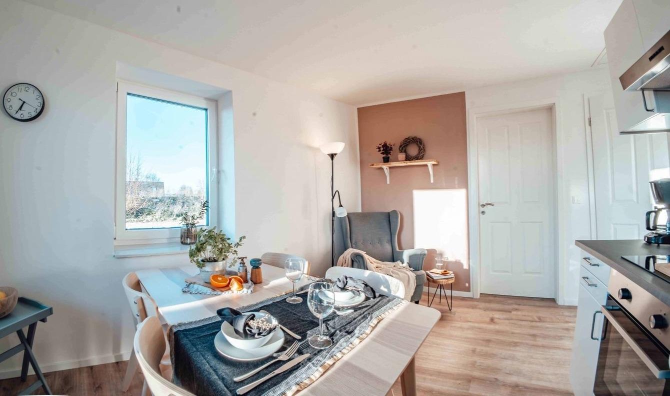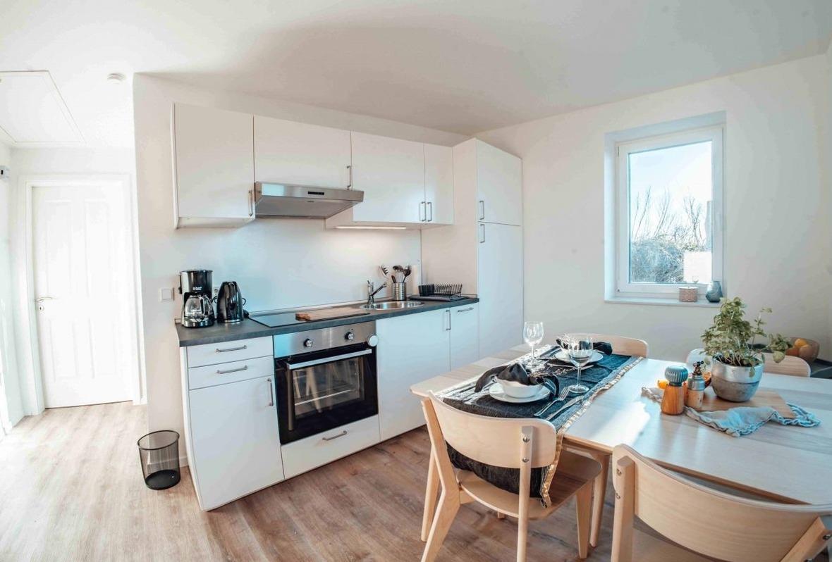 Der zentrale Ort der Wohnung ist ein helles Wohn-/Esszimmer mit einer Küchenzeile, Stühlen und einem Esstisch. Die hochwertige Küche ist mit Markengeräten (Filter-Kaffeemaschine usw.) ausgestattet.