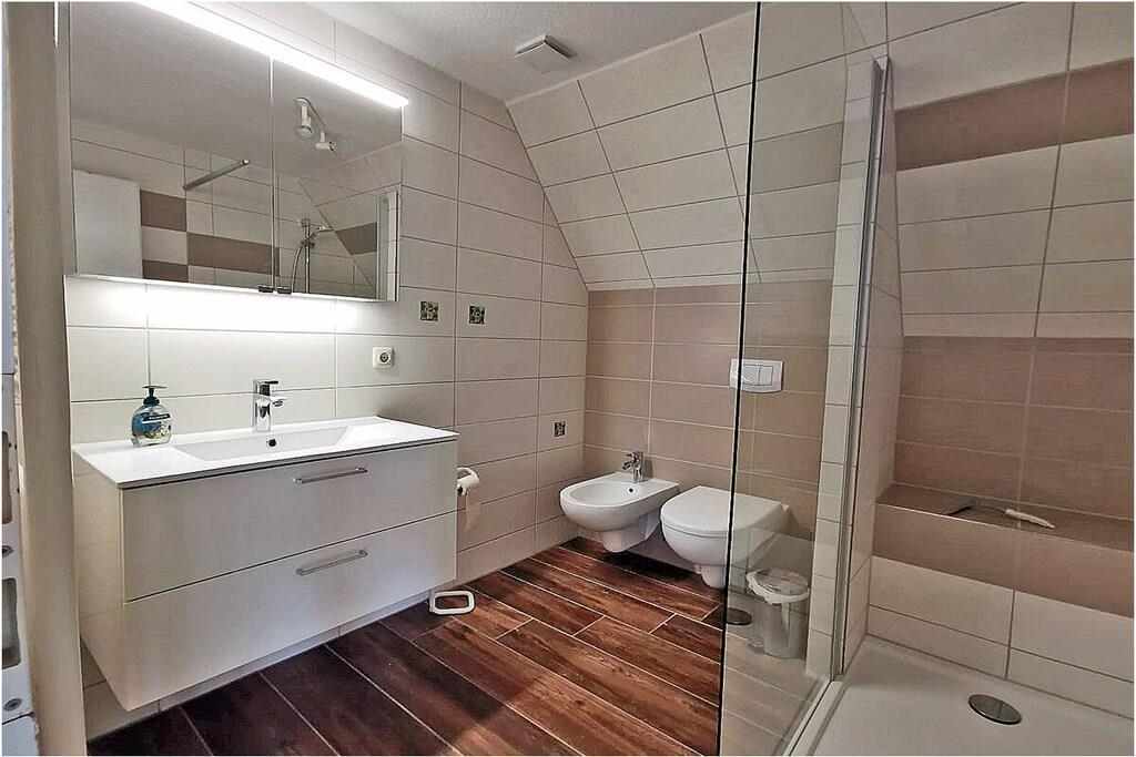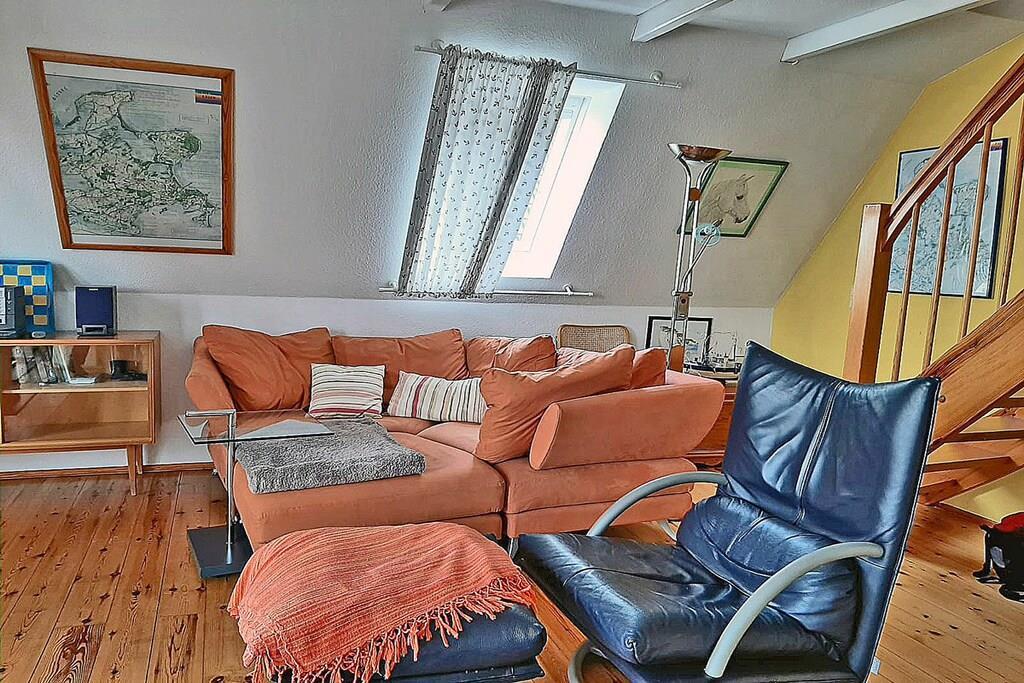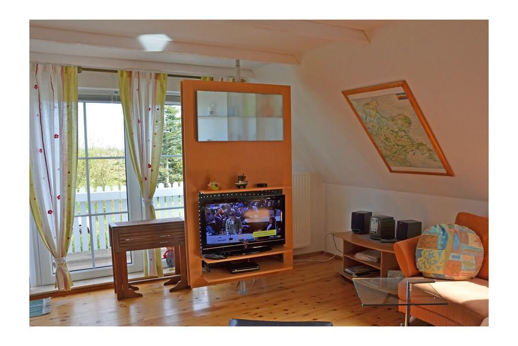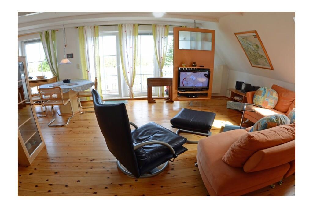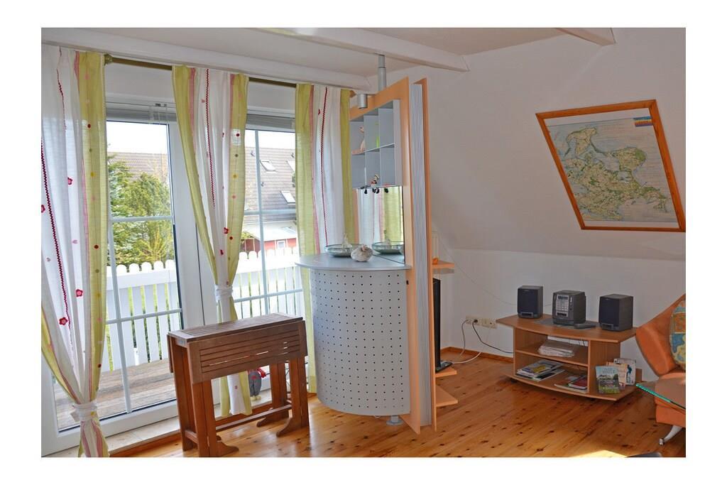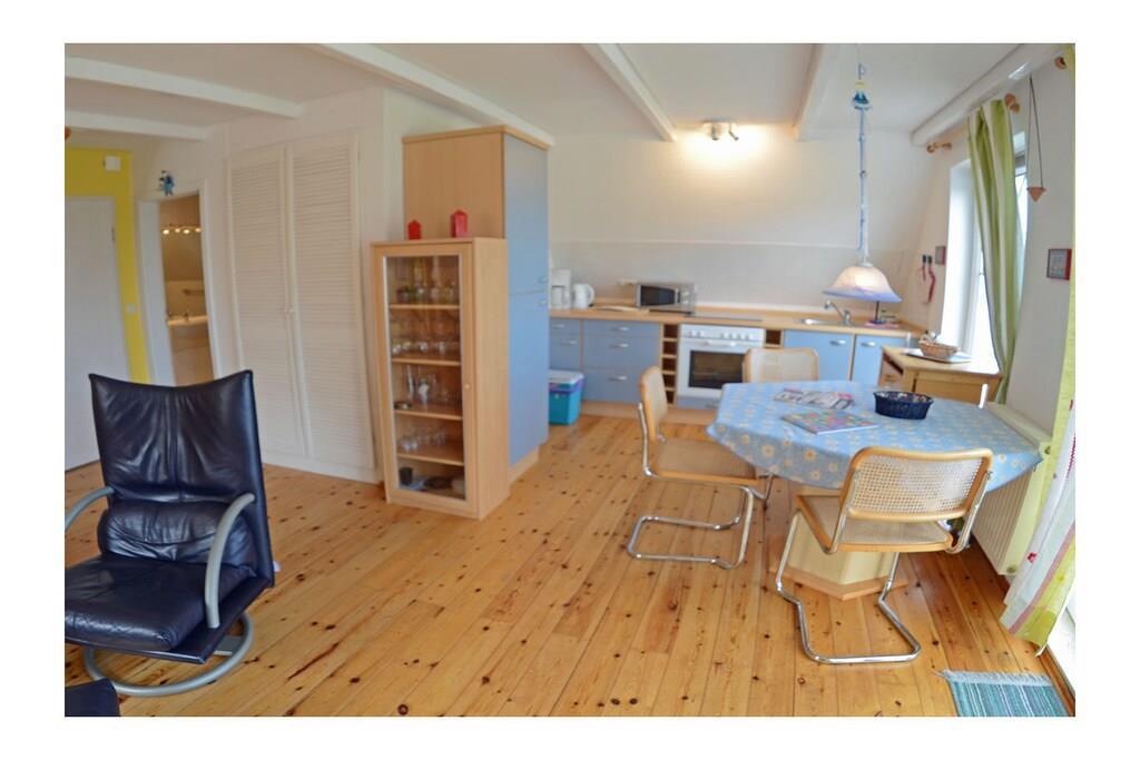Die ca. 60 m² große Maisonette-Ferienwohnung für 3 Personen, befindet sich im ersten Obergeschoss und besteht aus einem großen Wohn-/ Essraum mit offener, voll ausgestatteter Küche (Kühlschrank mit kleinem Gefrierfach, Geschirrspüler, 4 Platten-Ceranherd, Backofen, Mikrowelle, Esstisch für 4 Personen), TV/ Sat (Flatscreen), Stereoanlage mit CD, großen Fensterfront mit Zugang zum gemütlichen Holzbalkon mit Sitzmöbeln. Abstellraum mit Waschmaschine, Wäscheständer und Bügeleisen. Bad mit Badewanne, WC und Waschbecken. Das separate Schlafzimmer im Dachgeschoss ist über eine Holztreppe erreichbar und hat ein Doppelbett mit 180 cm x 200 cm (offenes Fußende), sowie ein Schlafsofa mit einer Liegebreite von 140 cm und einen Kleiderschrank. Die Ferienwohnung ist sehr großzügig, hell und mit einem Holzfußboden und einem drehbaren Bar-Fernsehcenter ausgestattet.