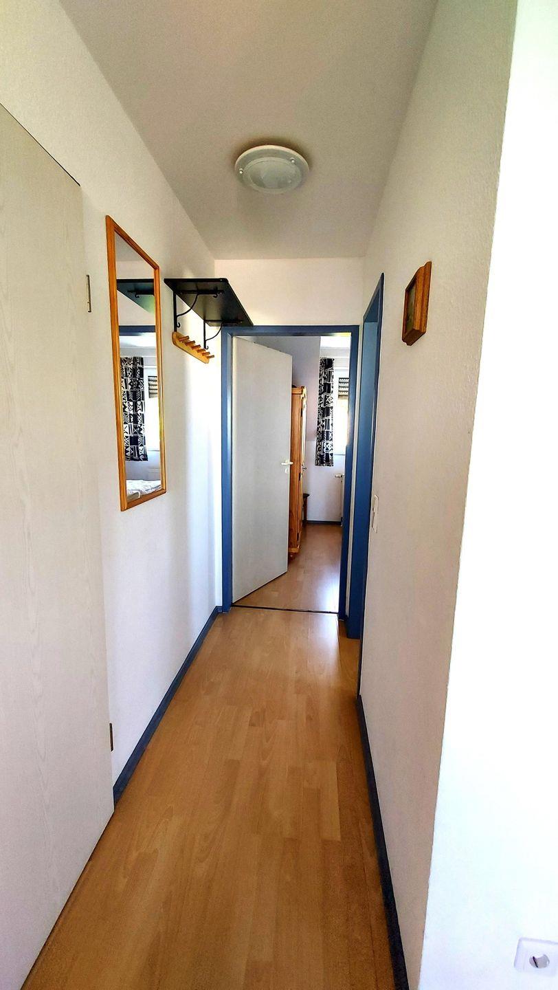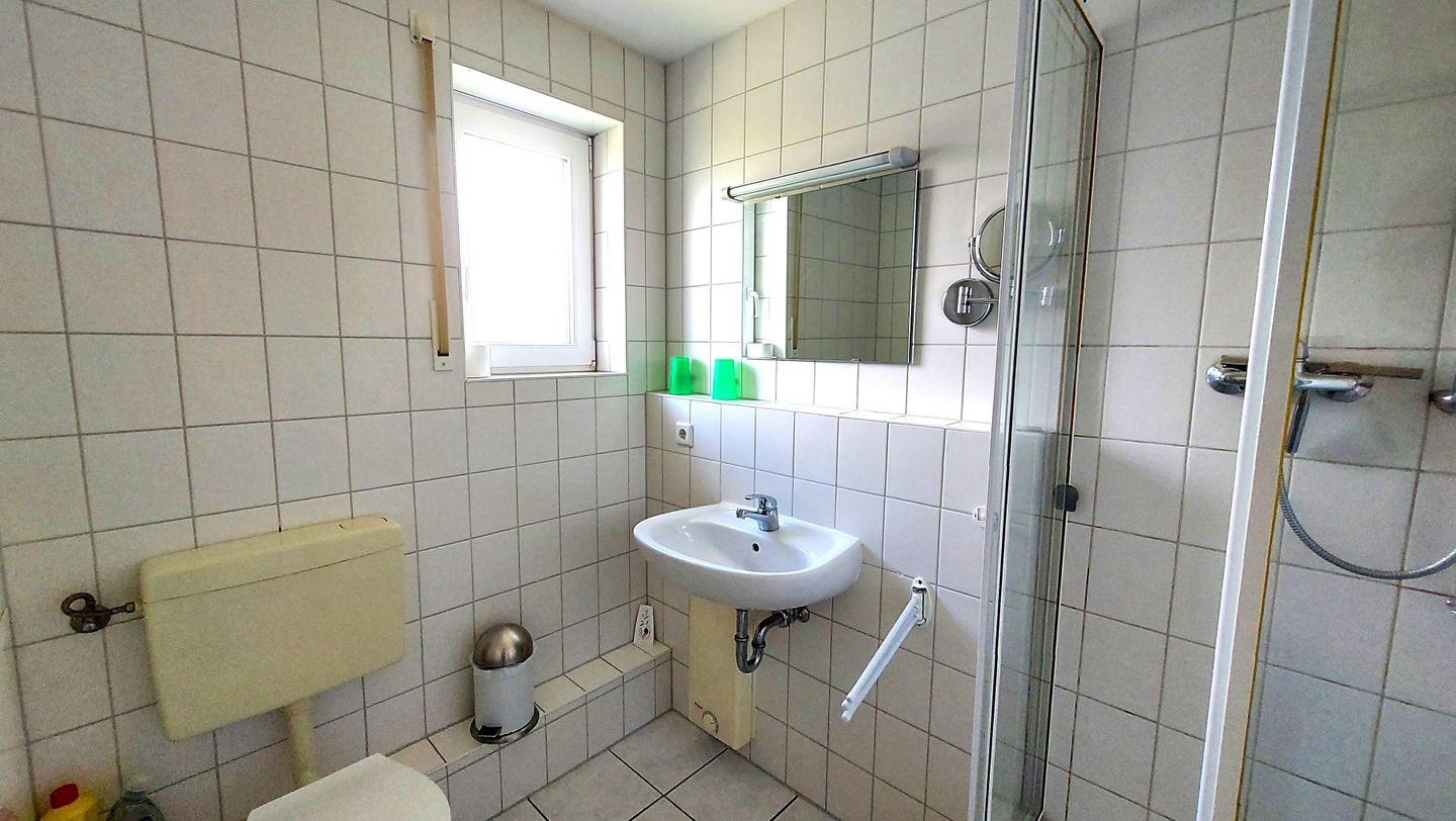 Das Badezimmer erreichen Sie direkt vom Flur aus. Am Ende des Flures schließt sich das Schlafzimmer in der unteren Ebene an.