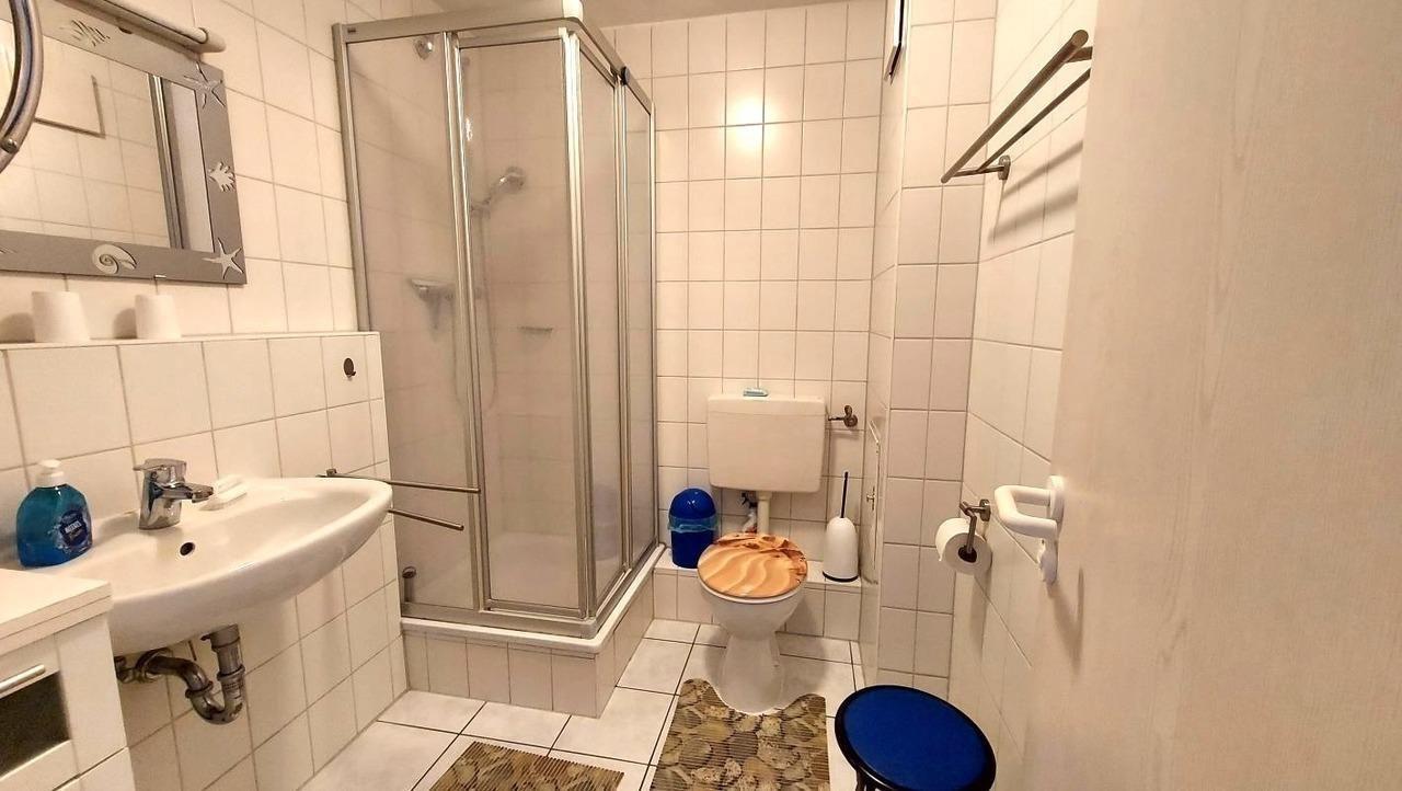 Das Badezimmer erreichen Sie direkt vom Flur aus. Am Ende des Flures schließt sich das Schlafzimmer in der unteren Ebene an.