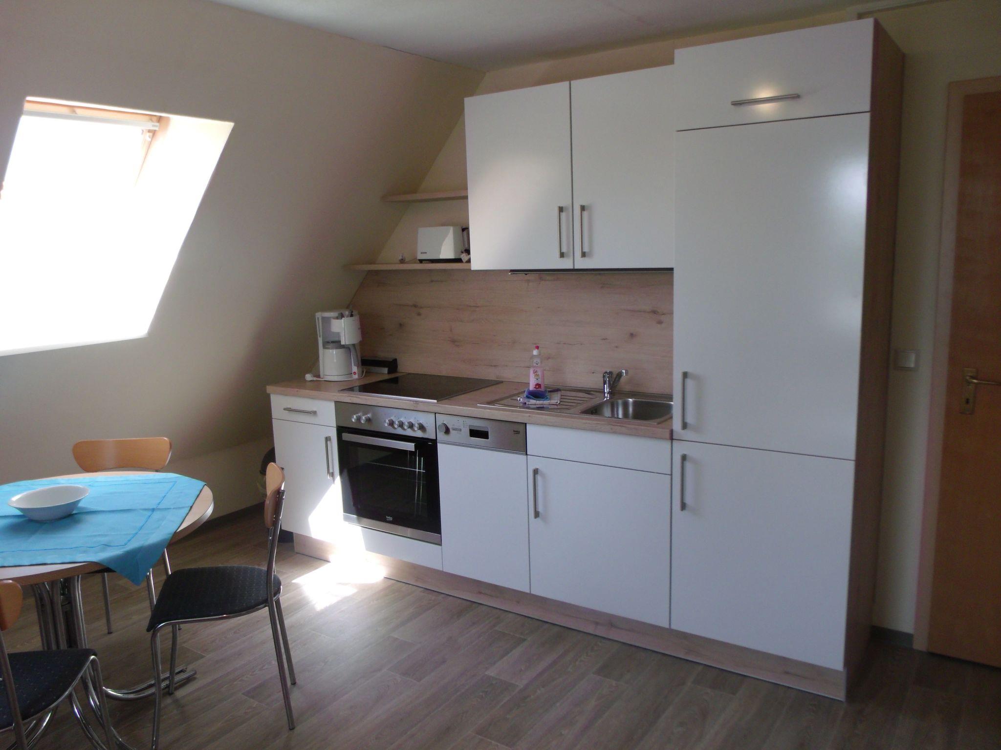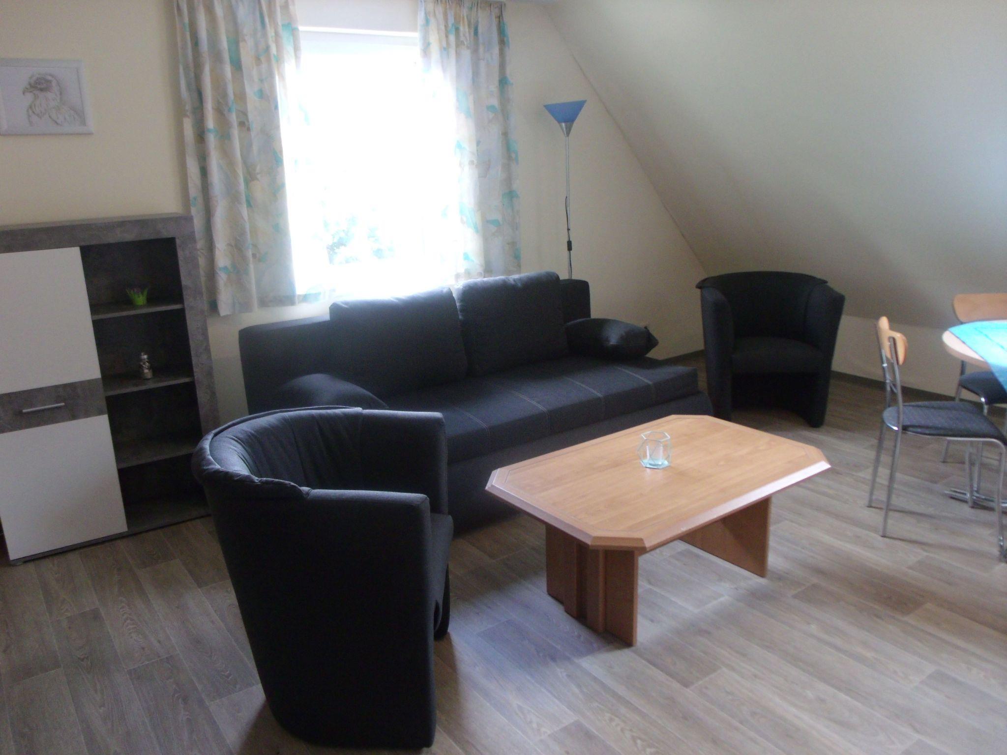 The flat is on the upper floor. In the living area there is a cosy couch with 2 armchairs, satellite TV, a modern kitchenette with all the usual appliances such as ceramic hob, oven and microwave. Appliances such as ceramic hob, oven, dishwasher, fridge, etc., dining area. In the bedroom there is a 1.60 double bed and a 0.90 single bed. The bathroom has a shower, WC and washbasin.