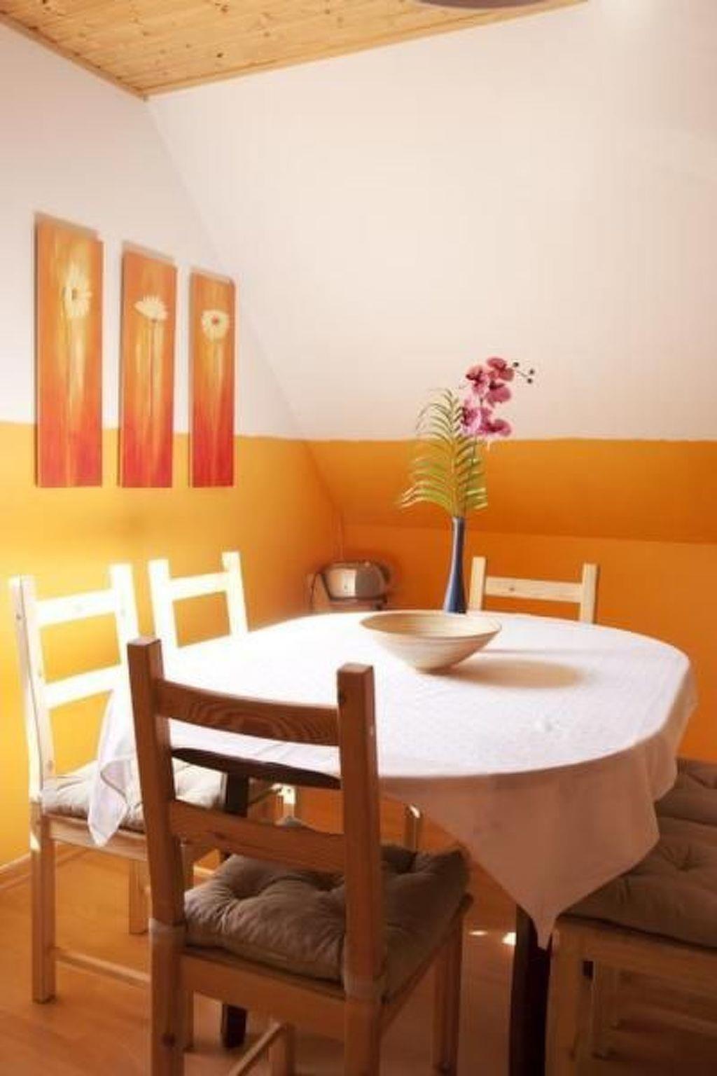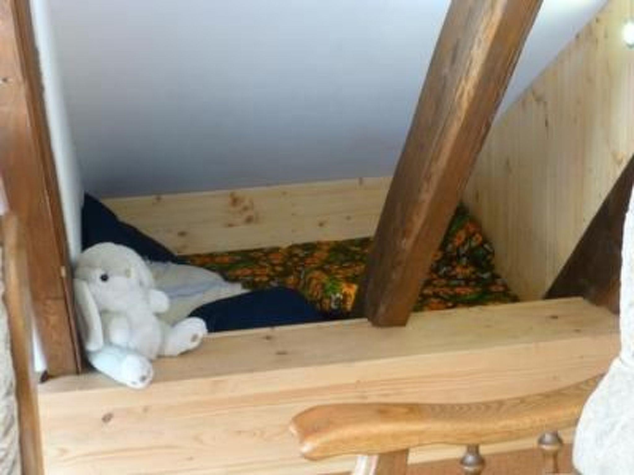 The interior of our holiday flat, which extends over the 1st floor and the converted attic, offers everything you need for a comfortable stay. A separate entrance leads you into the flat, where you will find two tastefully furnished bedrooms, both with double beds and additional single beds. The living areas are equipped with modern amenities such as satellite TV, a mini-kitchen in the first bedroom and a fully equipped main kitchen with all the appliances needed for self-catering. Additional cosiness is provided by the rustic living area furnishings on the top floor and the play and snuggle corner for younger guests.