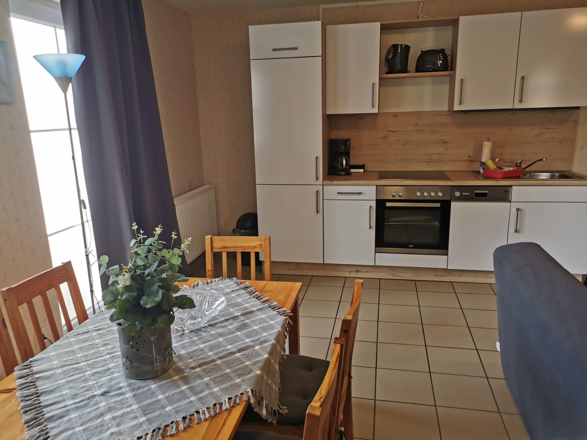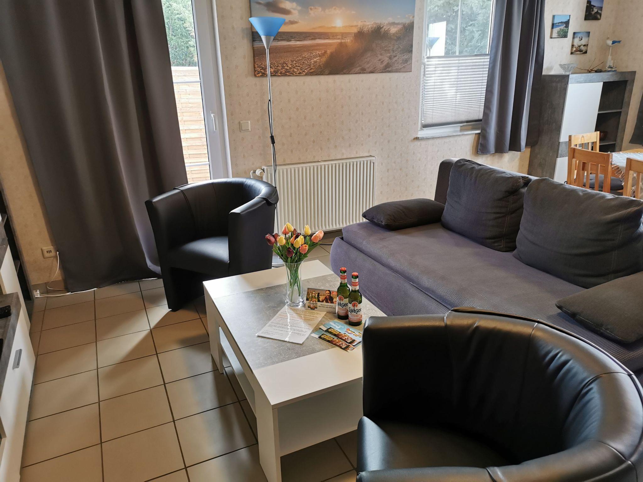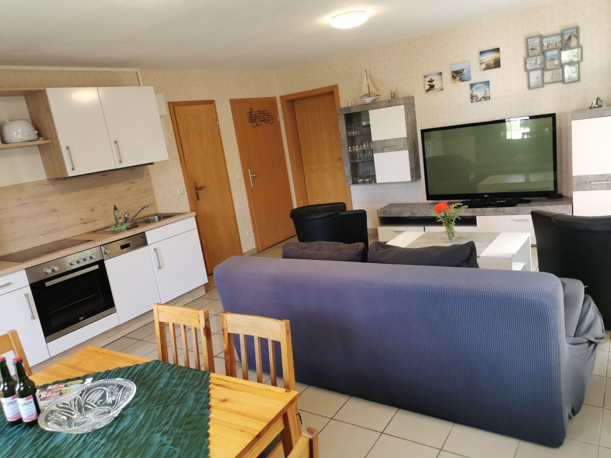 The flat is on the ground floor, about 60 m² in size, and consists of the following rooms: A living area with terrace, satellite TV, double sofa bed, a fully equipped kitchenette with ceramic hob, oven, microwave, dishwasher, coffee machine and dining area; an adjoining bedroom with 1.80 double bed and a bunk bed, as well as an adjoining bathroom with shower and WC.