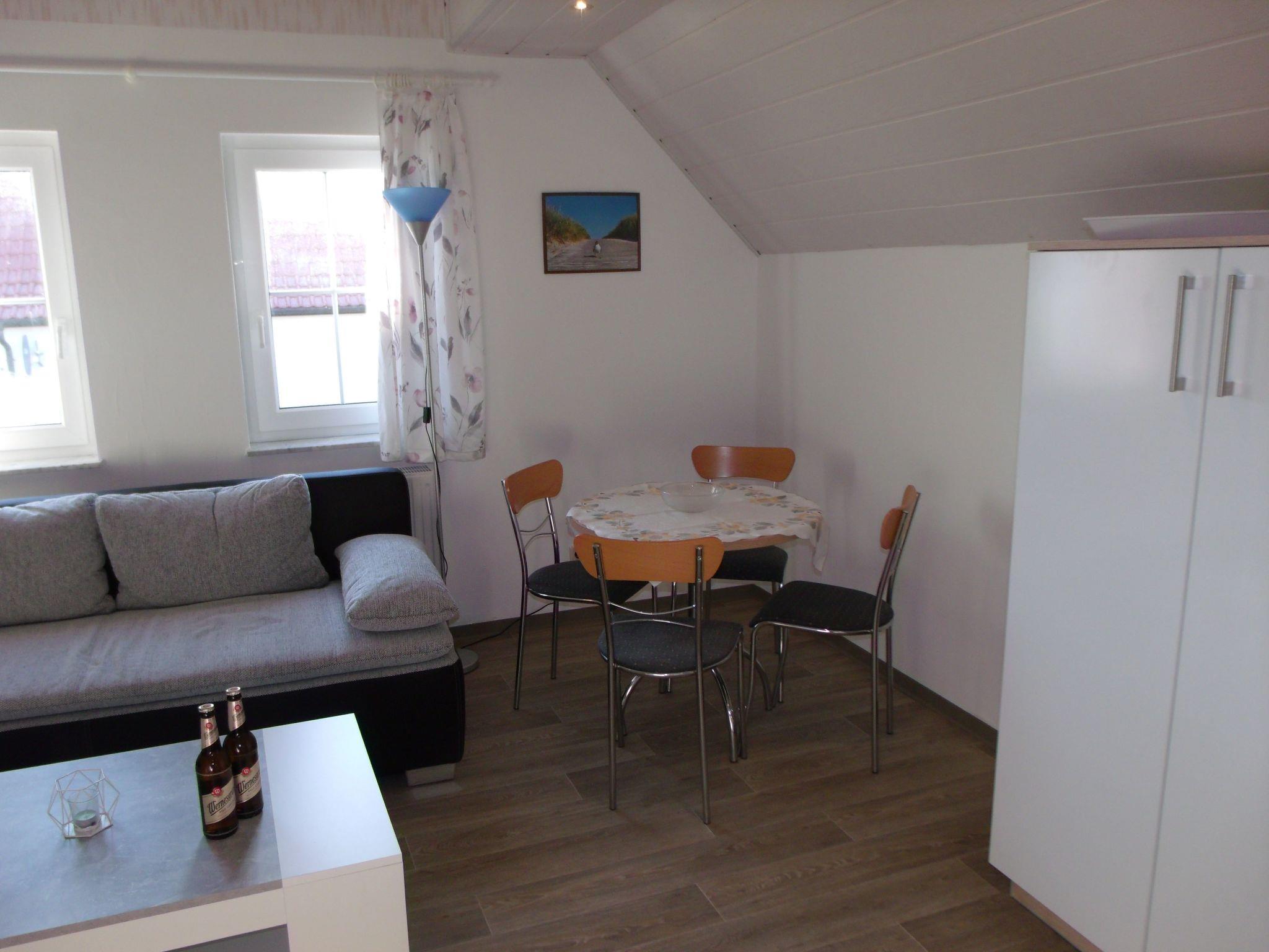 The flat is located on the upper floor. In the living area you will find a cosy double sofa bed and 2 armchairs, satellite TV, a modern kitchenette with 2-ring ceramic hob, dishwasher, fridge, microwave and the usual appliances. The bedroom has a 1.60 metre double bed. The bathroom has a shower, washbasin and WC.