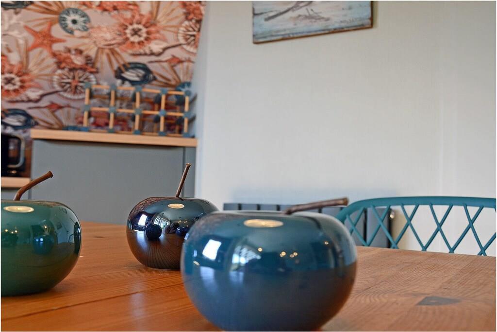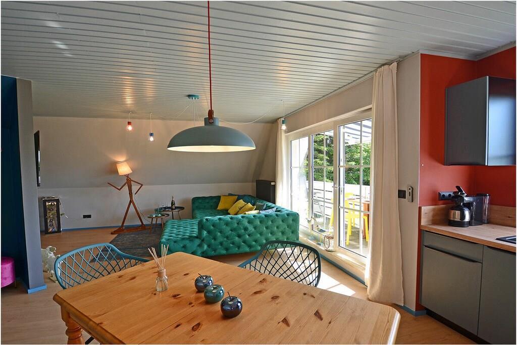 Eingangsbereich: Wohnzimmer mit gemütlicher Sofalandschaft (Schlaffunktion 110cm x 220) mit Balkonzugang, TV/Sat (Flatscreen), Radio, moderne offene komplett ausgestattete Einbauküche mit Esstisch, 4-Plattenherd (Ceranfeld), Backofen, Geschirrspüler, Kühlschrank mit kleinem Gefrierfach, Filterkaffeemaschine, Toaster und Wasserkocher Gäste-WC Garderobe mit großem Spiegel, Stauraum für Kleidung und Koffer Hauswirtschaftsraum mit Waschmaschine und Wäscheständer Außenbereich: Balkontisch mit 4 Stühlen, 2 Liegestühle, elektrische Sonnenmarkise Obergeschoss: Schlafzimmer mit Doppelbett (2 Matratzen je 80 x 200), Kommode und Schlafsessel (90 x 200), TV -Flachbild, komfortables Bad mit Dusche/WC