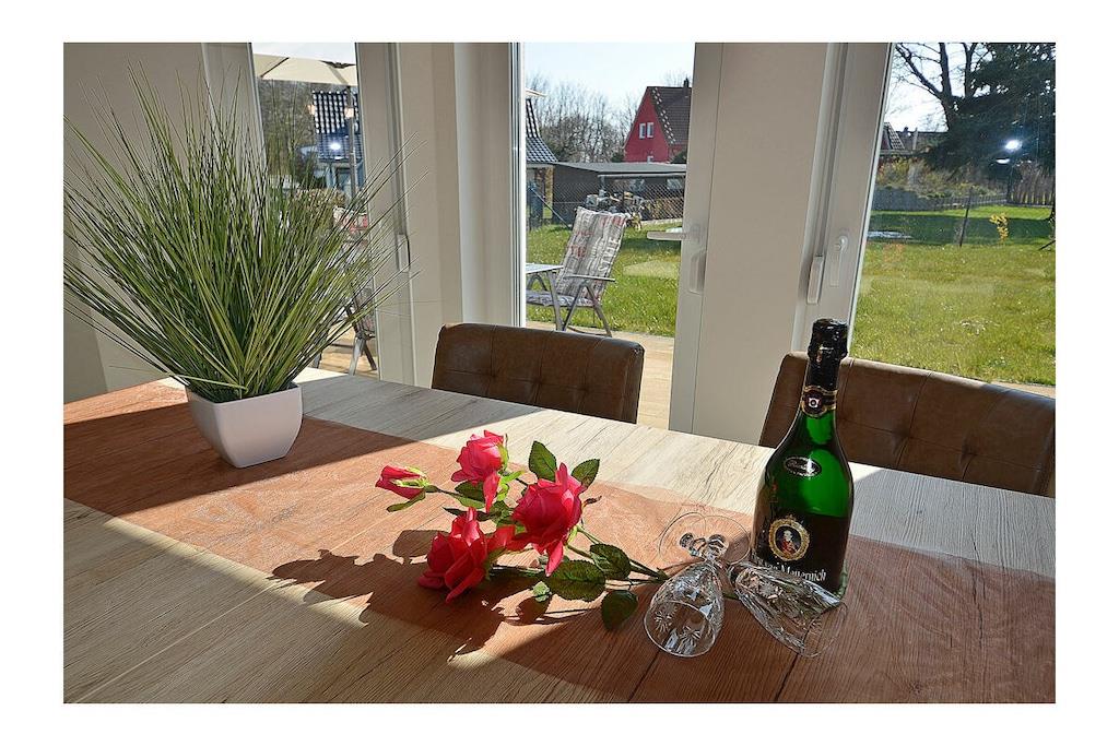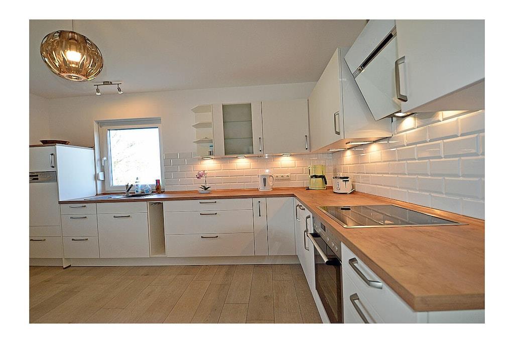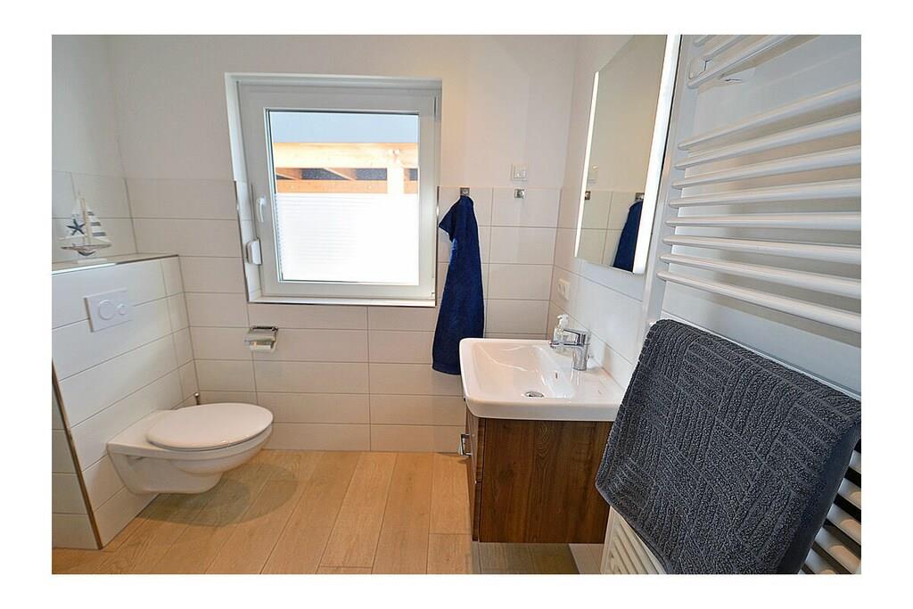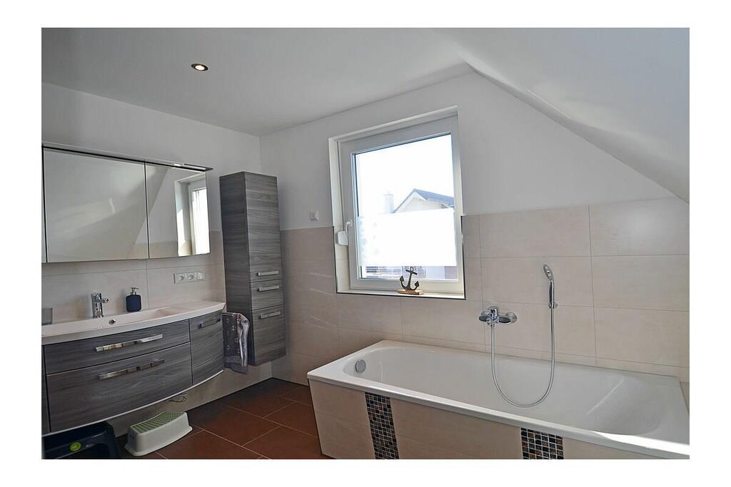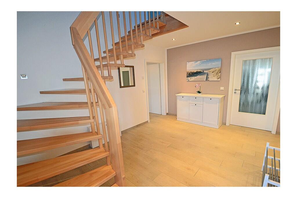 Erdgeschoss: großzügiger Wohnbereich mit gemütlicher Couchlandschaft und Schlaffunktion für 2 Personen, TV (Flatscreen), Internet (WLAN), Radio/CD und Bücher für gemütliche Abende, Fußbodenheizung im gesamten Haus, komplett ausgestattete hochwertige Einbauküche mit 4-Plattenherd (Ceranfeld mit Induktion), Kühlschrank, Gefrierschrank, Geschirrspüler und diversen Elektrogeräten, Badezimmer mit ebenerdiger Dusche und WC, Hauswirtschaftsraum mit Waschmaschine Obergeschoss: 1. Schlafzimmer mit einem Doppelbett (2 Matratzen je 90 x 200) und großem Kleiderschrank, TV (Flatscreen), 2. Schlafzimmer mit einem Doppelbett (140 x 200) und Kleiderschrank, 3. Schlafzimmer mit zwei Einzelbetten (90 x 200) und 1 Kinderbett (70 x 140), Kleiderschrank, großzügiges modernes Bad mit ebenerdiger Dusche und Badewanne/ WC, Kosmetikspiegel und Föhn Aussenbereich: Terrasse mit gemütlichen Gartenmöbeln und Sonnenschirm, Grillmöglichkeit besteht (kein Grill vorhanden)