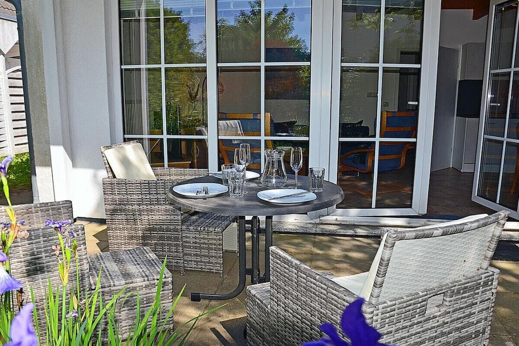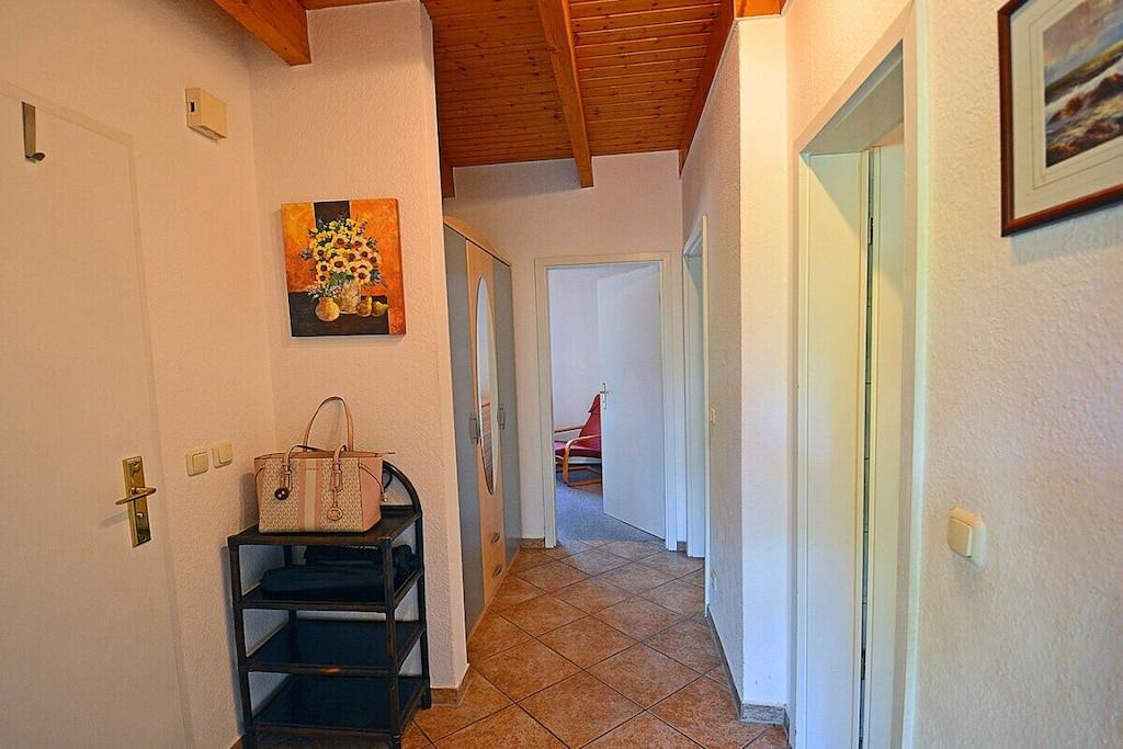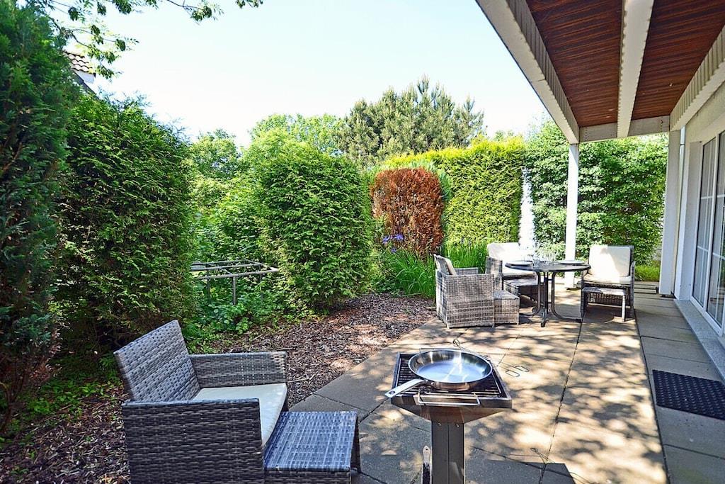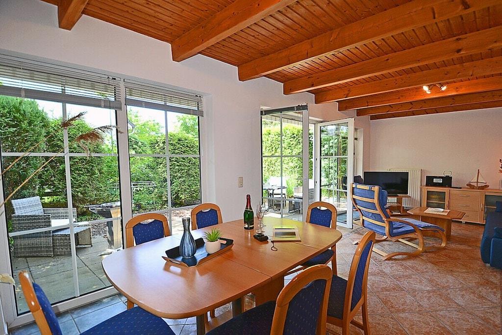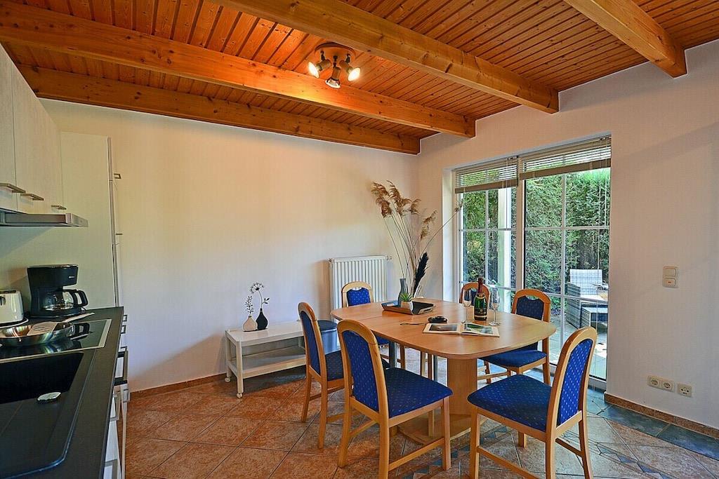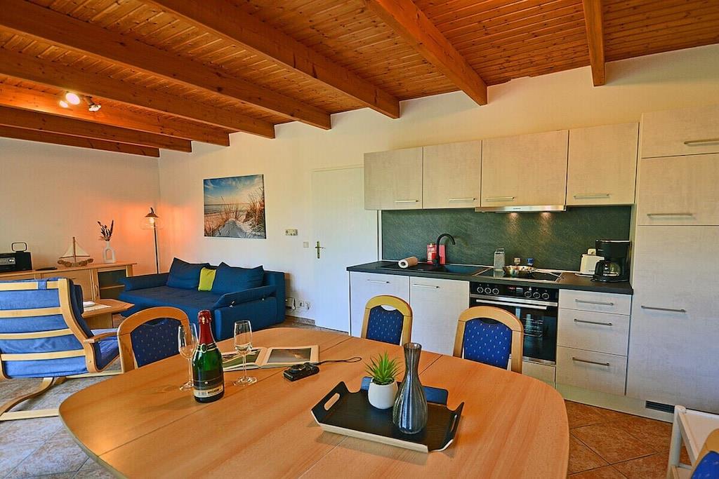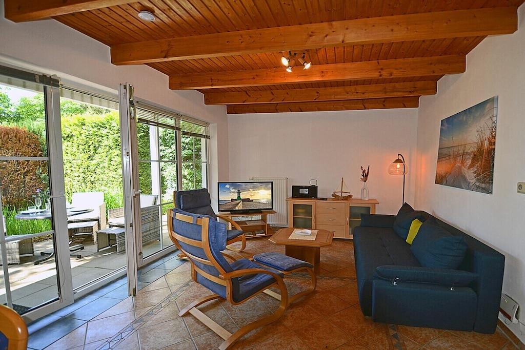 Hyggelig stue med spiseplads og sovesofa, TV/satellit (fladskærm/smart-TV), radio/CD-afspiller, gratis Wi-Fi, bøger til afslappende læsning, fuldt udstyret køkken med 4-brænder induktionskogeplade og ovn, opvaskemaskine, køleskab med stort frostrum, filterkaffemaskine og diverse andre apparater. Soveværelse 1 med dobbeltseng (to madrasser, hver 80 x 200 cm) og garderobe, soveværelse 2 med to enkeltsenge (hver 90 x 200 cm), badeværelse med bruser og toilet. Udendørs område: Terrasse med fire havestole, grillfaciliteter (grill medfølger), udendørs sauna med to bænke til 4-6 personer er vejrbestandigt i en lille træhytte ved siden af terrassen, privat parkeringsplads foran ejendommen, kæledyr tilladt efter aftale.