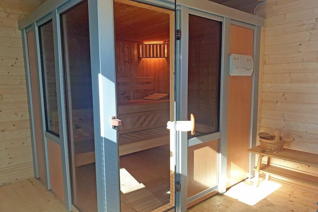 Stueetage: (entre(, ), stue / spisestue(, tekøkken, bibliotek, enkeltsovesofa, Fjernsyn, spisebord, radio, CD-afspiller, kogeplade, brødrister, komfur, kaffemaskine, ovn, opvaskemaskine , køleskab, fryser), soveværelse(, dobbeltseng), badeværelse(, toilet, bruser, håndvask)) , , , soveværelse(enkeltseng, enkeltseng), loungerum(sauna), Internetadgang, Internetadgang, varme, have(sauna, Grill center, grill, havemøbler), parkering