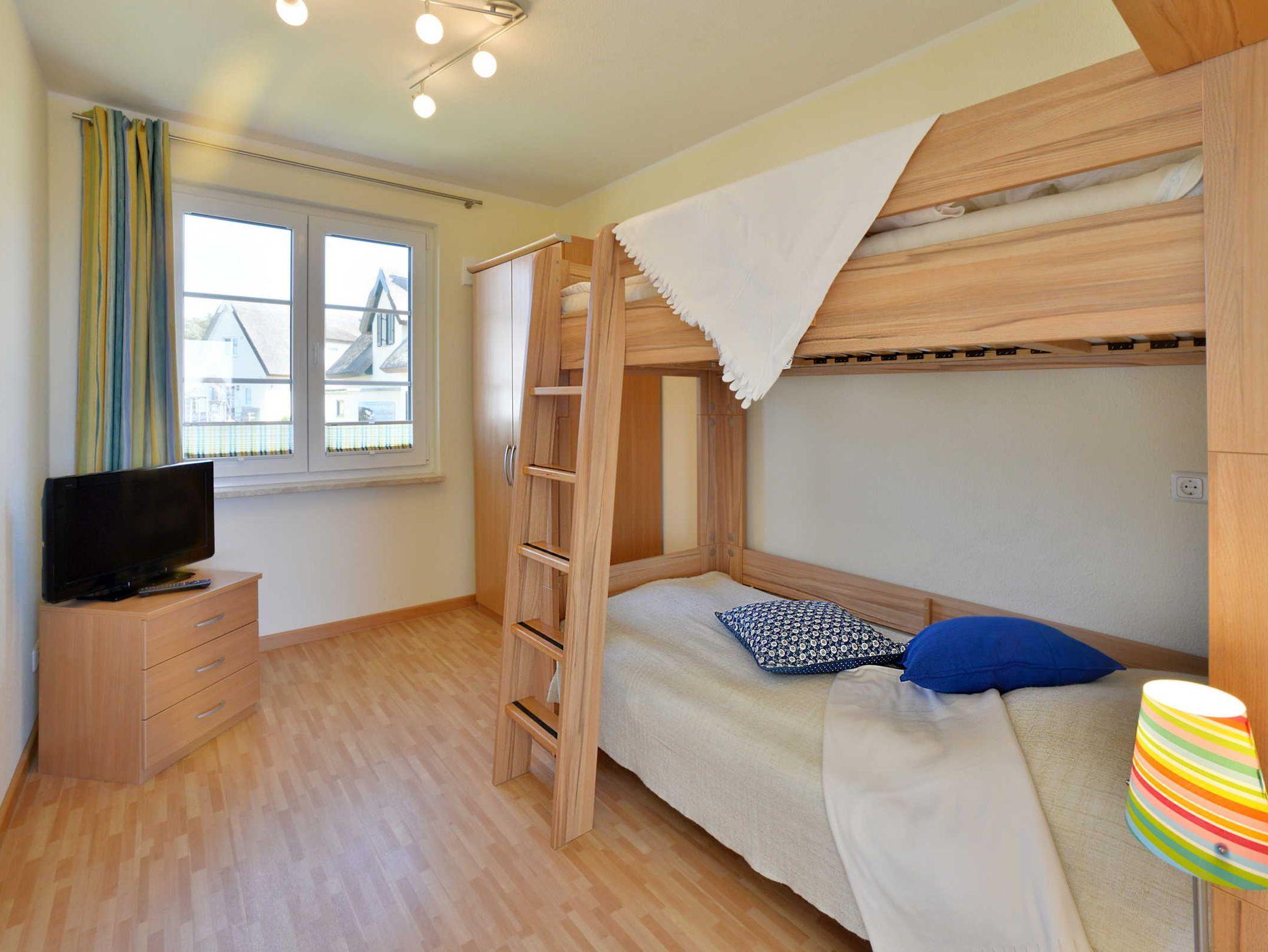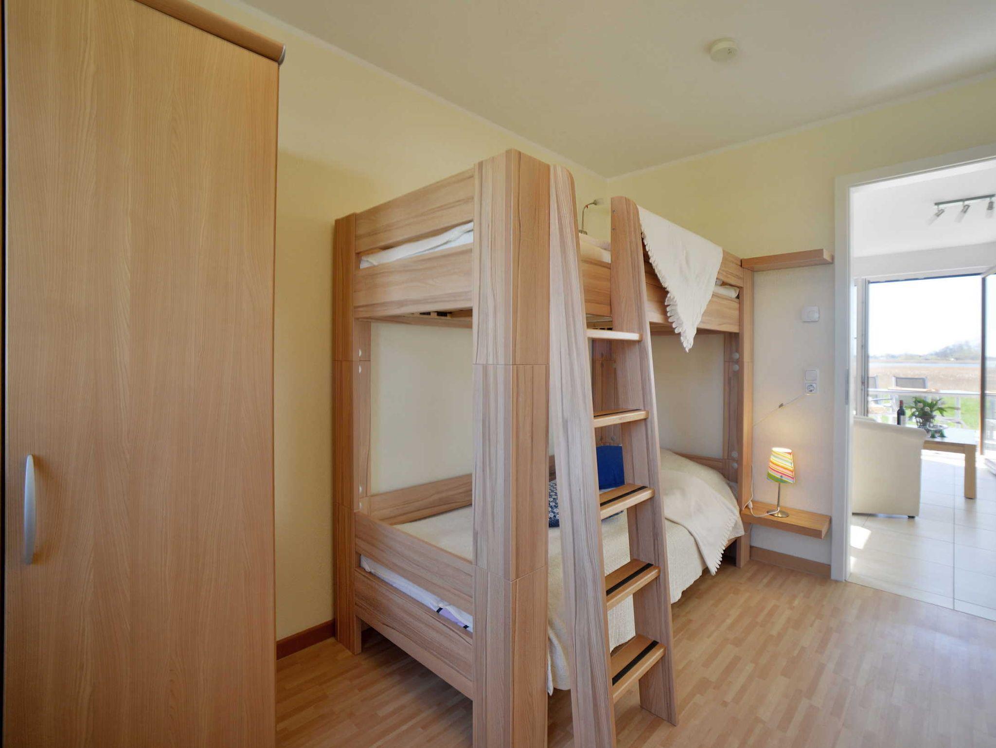 In der Ferienwohnung befindet sich ein Schlafzimmer mit einem Doppelbett und ein Kinderschlafzimmer mit einem Etagenbett. Auf Wunsch kann ein Kinder-/ Babybett zugestellt werden.