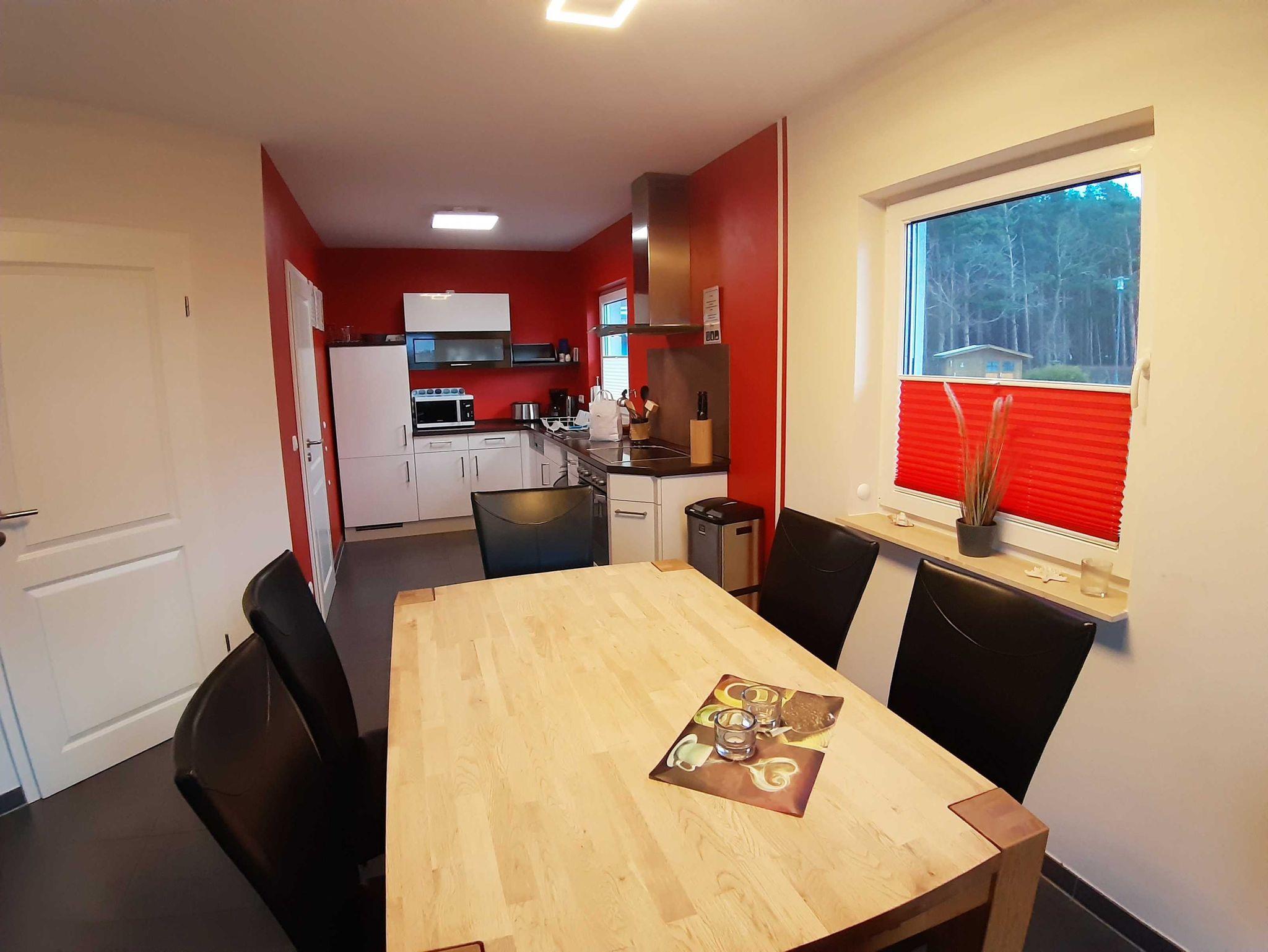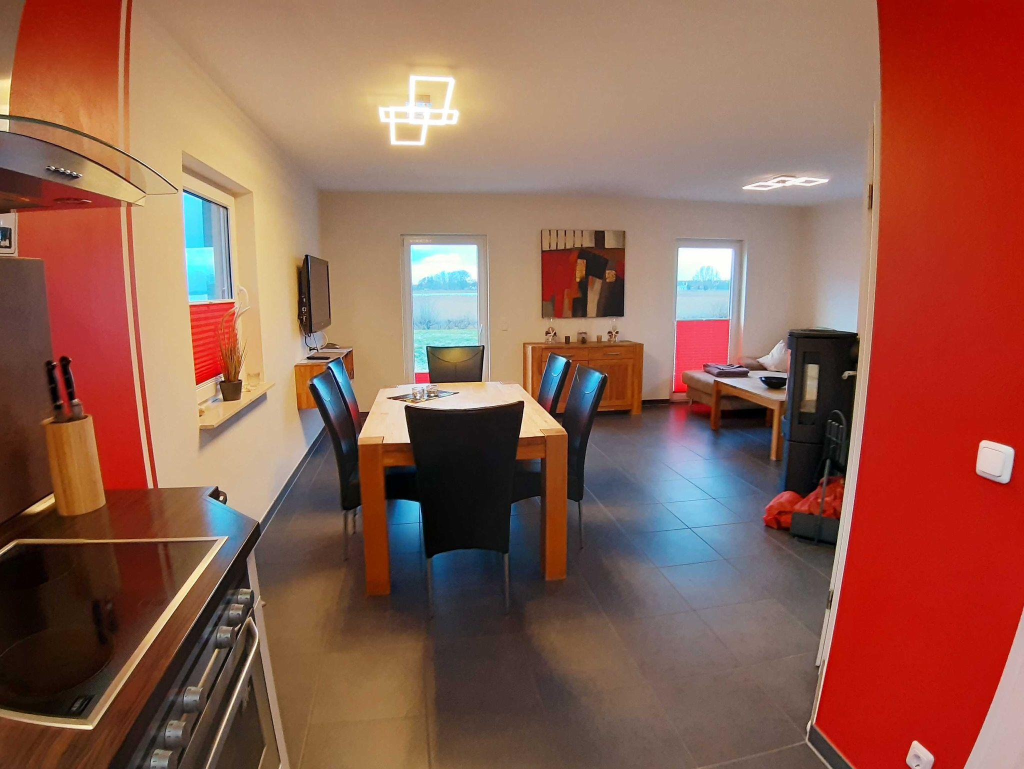 Das Feriendomizil besitzt im Erdgeschoss einen geräumigen Wohn- und Küchenbereich mit Kamin und angeschlossener Terrasse mit Strandkorb und Gartenmöbeln, außerdem eine Gästetoilette und ein Schlafzimmer mit einem Einzelbett. In der 1. Etage befindet sich ein Schlafzimmer mit einem Doppelbett und einem Babybett, ein Schlafzimmer mit 2 Einzelbetten sowie in Bad mit Dusche und Waschmaschine.