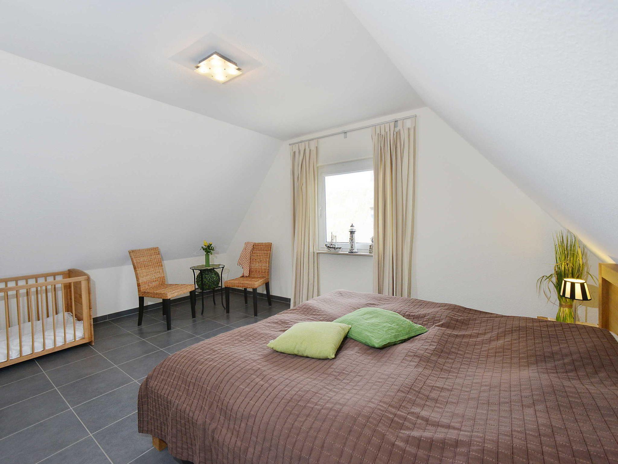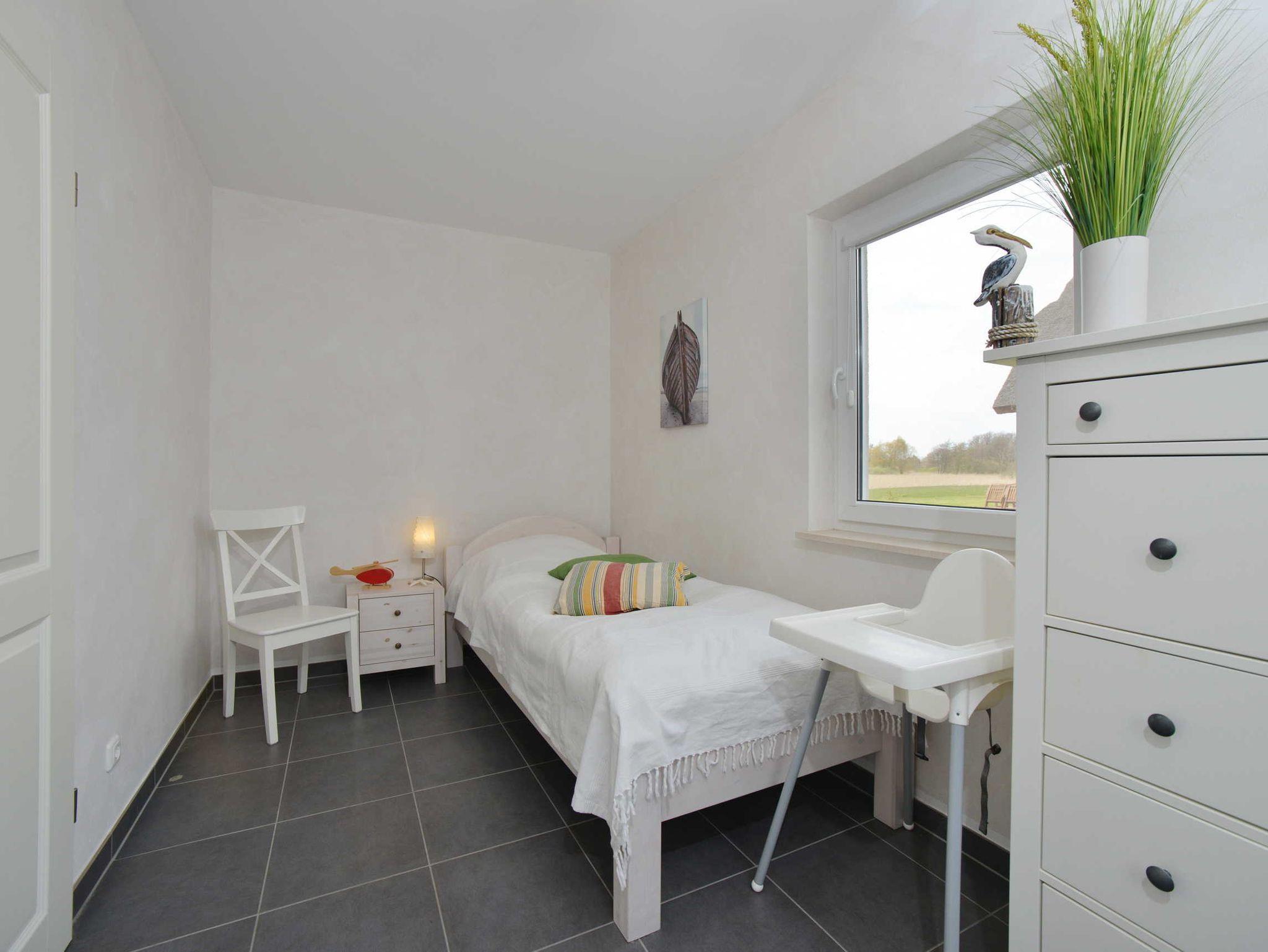 Das Haus bietet 5 Schlafplätze, in 3 Schlafzimmer. Das Schlafzimmer im Erdgeschoss beherbergt ein Einzelbett, in der 1. Etage befindet sich ein Schlafzimmer mit einem Doppelbett und einem Babybett und ein Schlafzimmer mit 2 Einzelbetten.