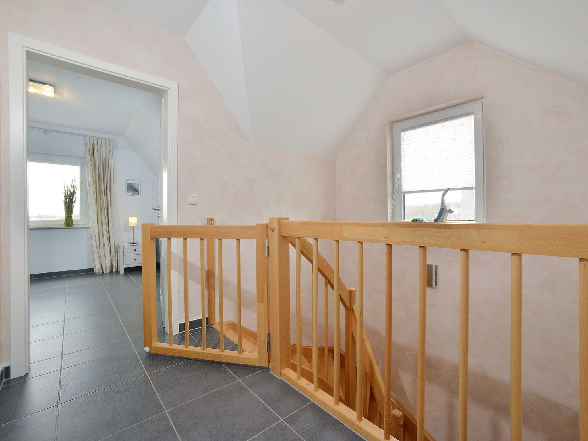 Für die Sicherheit unserer kleinen Gäste kann die Treppe nach Bedarf mit einem Treppenschutzgitter abgesichert werden.