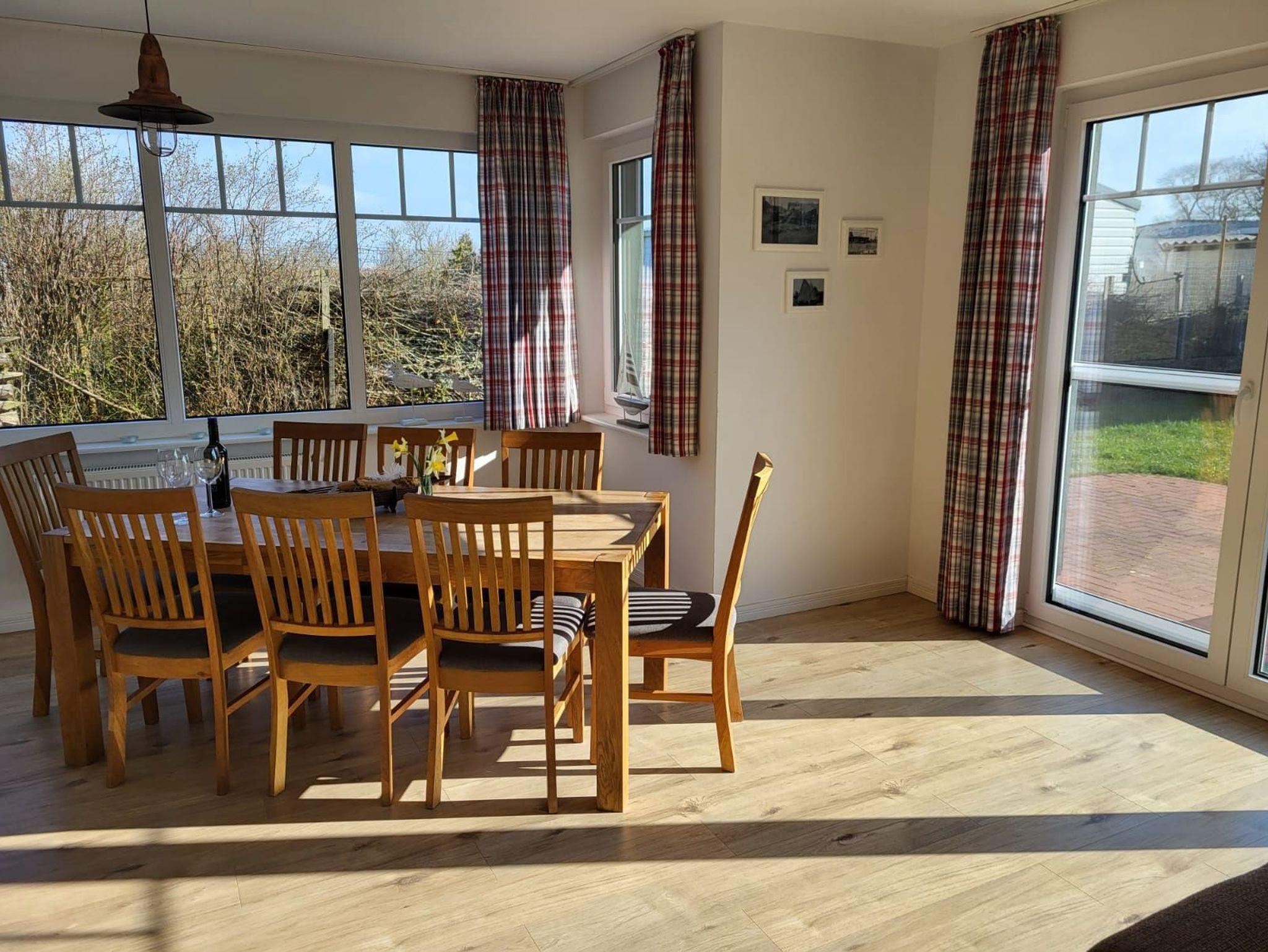 - Großzügiges Wohn-Esszimmer: Esstisch mit 8 Stühlen, gemütliches Ecksofa, SAT-TV 43 Zoll, Radio, Insektenschutz an der Terrassentür, Kaminofen