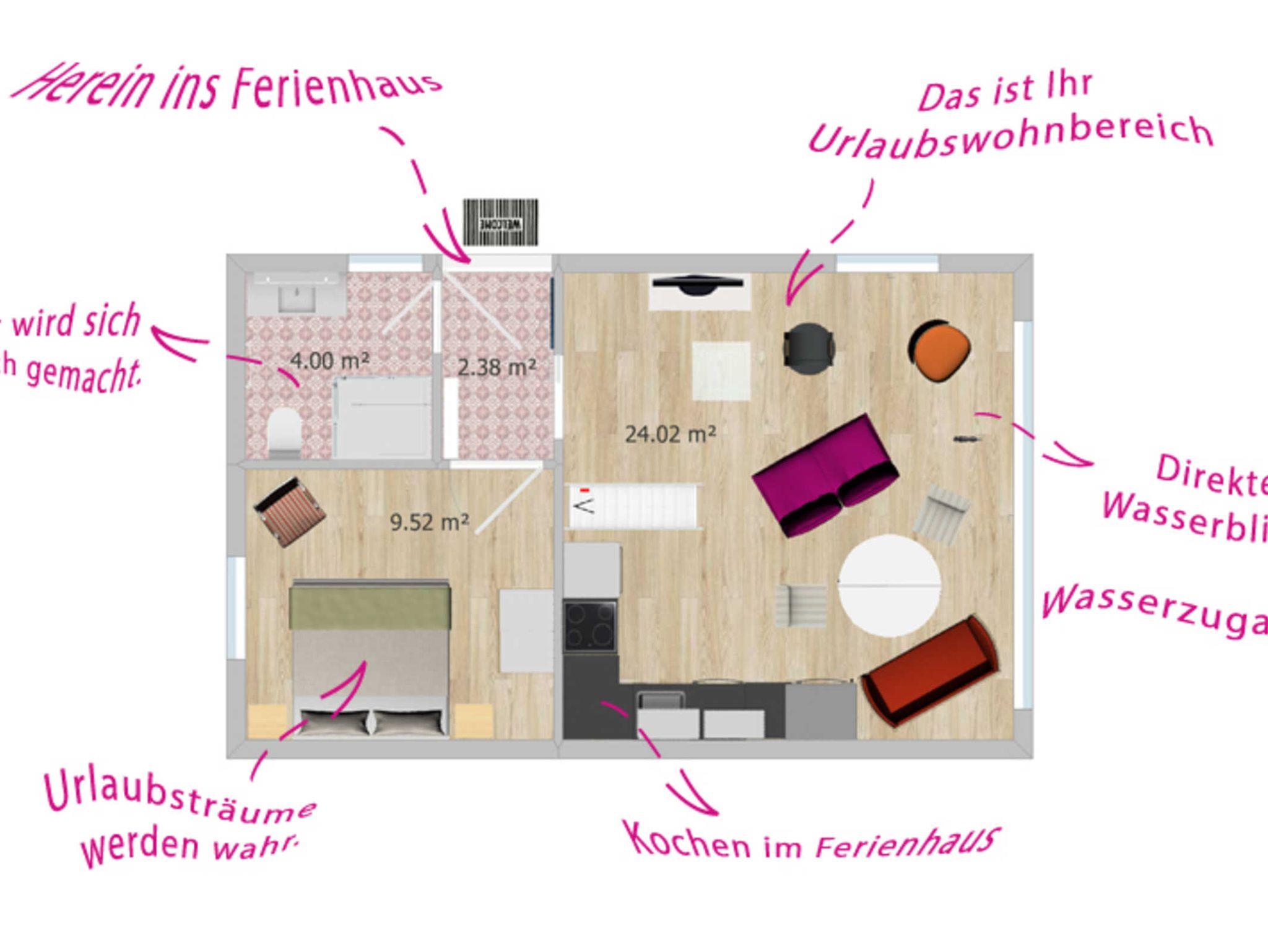 Nach rechts gelangt man ins Bad mit schicker Dusche, WC und einer Waschgelegenheit. Daran schließt sich das Schlafzimmer an, bei dem ein großes Doppelbett im Mittelpunkt steht. Highlight ist sicher das große Wohnzimmer. Hier findet Ihr Urlaub statt. Ob beim Kochen in der schicken neuen Küche oder kuscheln vor dem Kamin - alles da, was man für perfekte Ferien braucht. Man kann direkt hier speisen oder auf der großen Terrasse das Frühstück bei herrlicher Sonne genießen. Das riesige Panoramafenster zum Wasser zählt sicher zu den coolsten baulichen Features Ihres Ferienhauses Frieda.