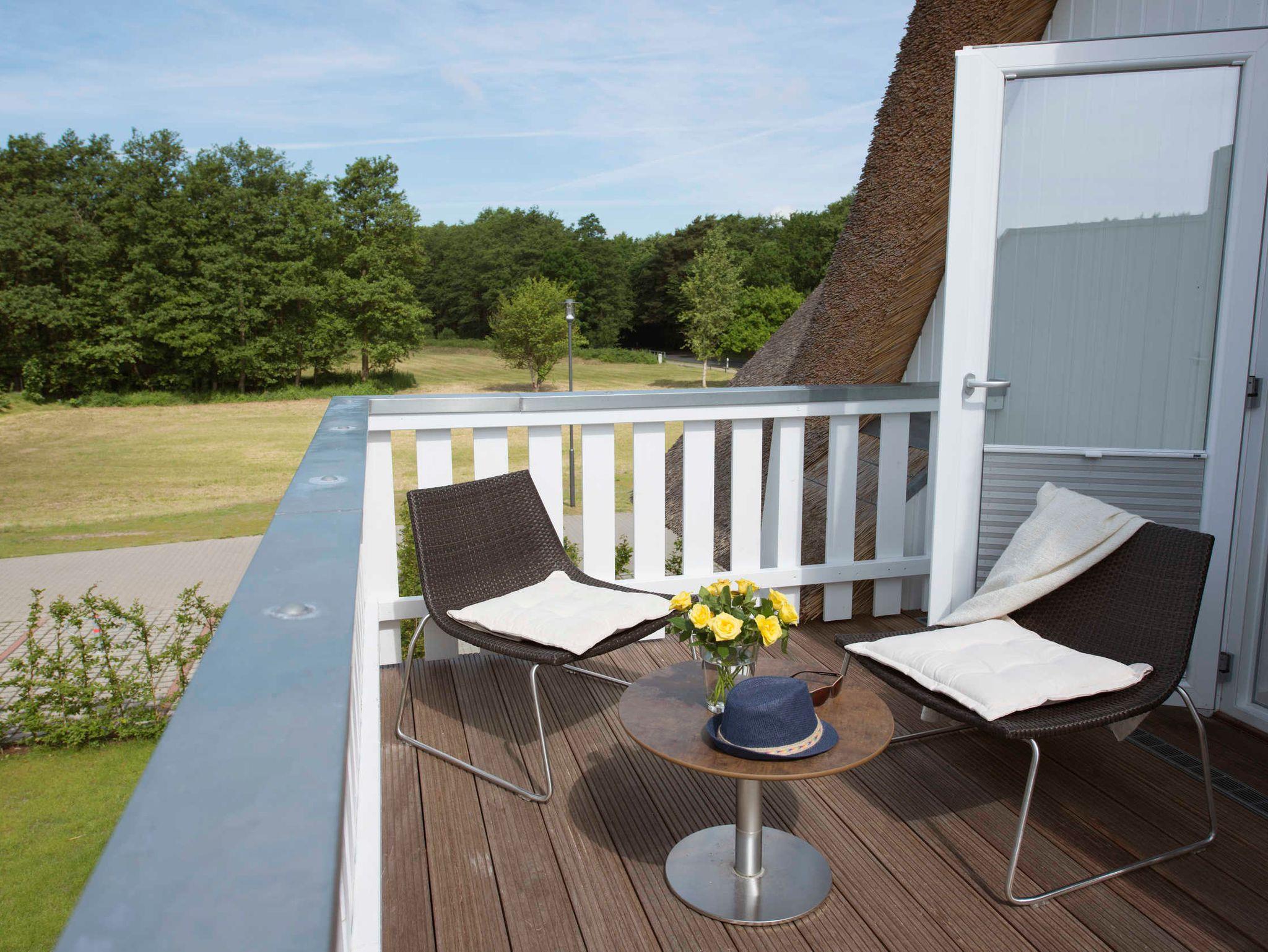 Auf der Terrasse relaxen Sie im Strandkorb oder auf den hochwertigen Gartenmöbeln und genießen den Ausblick. Der Balkon ist ebenfalls mit Gartenmöbeln ausgestattet.