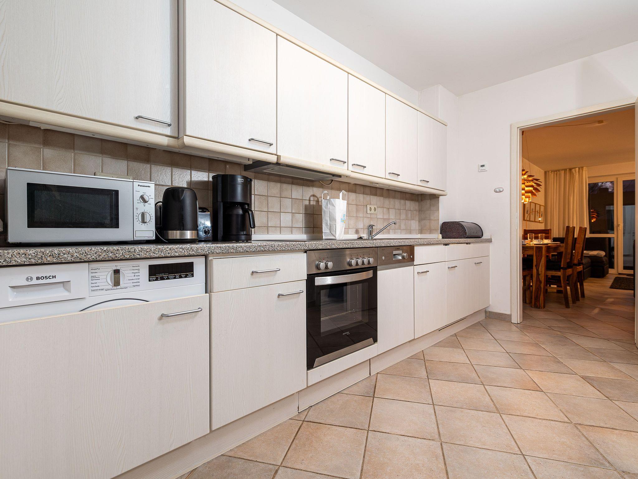Küche mit Spülmaschine, Mikrowelle, Kühlschrank mit Gefriermöglichkeit, Kaffeemaschine, Wasserkocher, Toaster