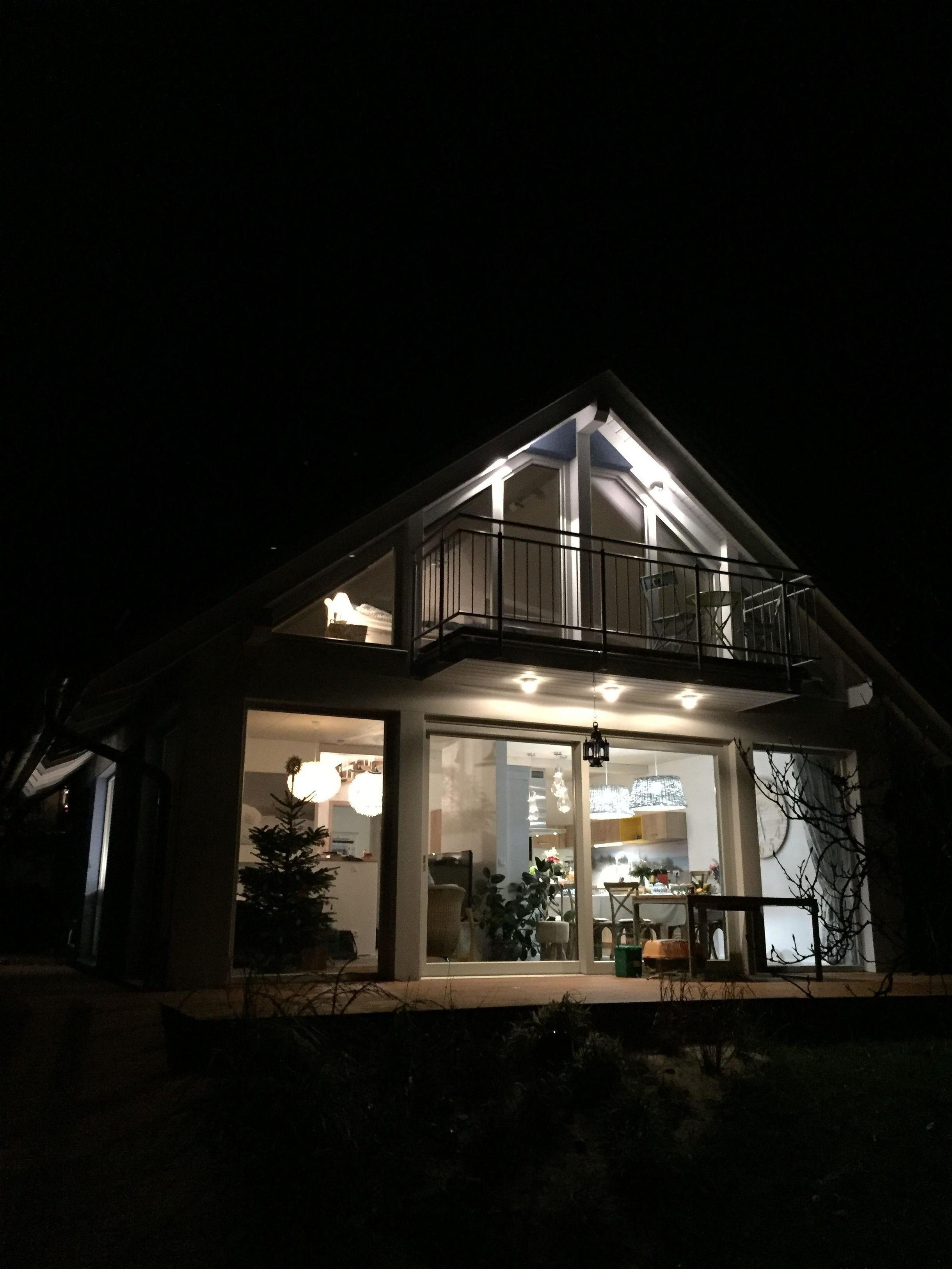 Besonders charismatisch und einladend macht die Arbeit mit Holz und Glas. Das gesamte Haus wurde in Holzrahmenbauweise gefertigt, innen wie außen sind viele Holzelemente sichtbar und geben dem Haus das unverwechselbare individuelle Gesicht. Auf drei Seiten befinden sich riesige bodentiefe Fensterelemente, die das Gebäude mit Sonne durchfluten. Faszinierend ist besonders die Vollverglasung zum Meer hin, mit einem großen Schiebeelement im Erdgeschoß, welches innen und außen verschmelzen lässt. Die wenigen Wände, fehlende Türen und die hohe weiß lasierte Vollholzdecke schaffen den Eindruck einer großen Einheit von Wohn- und Essbereich.