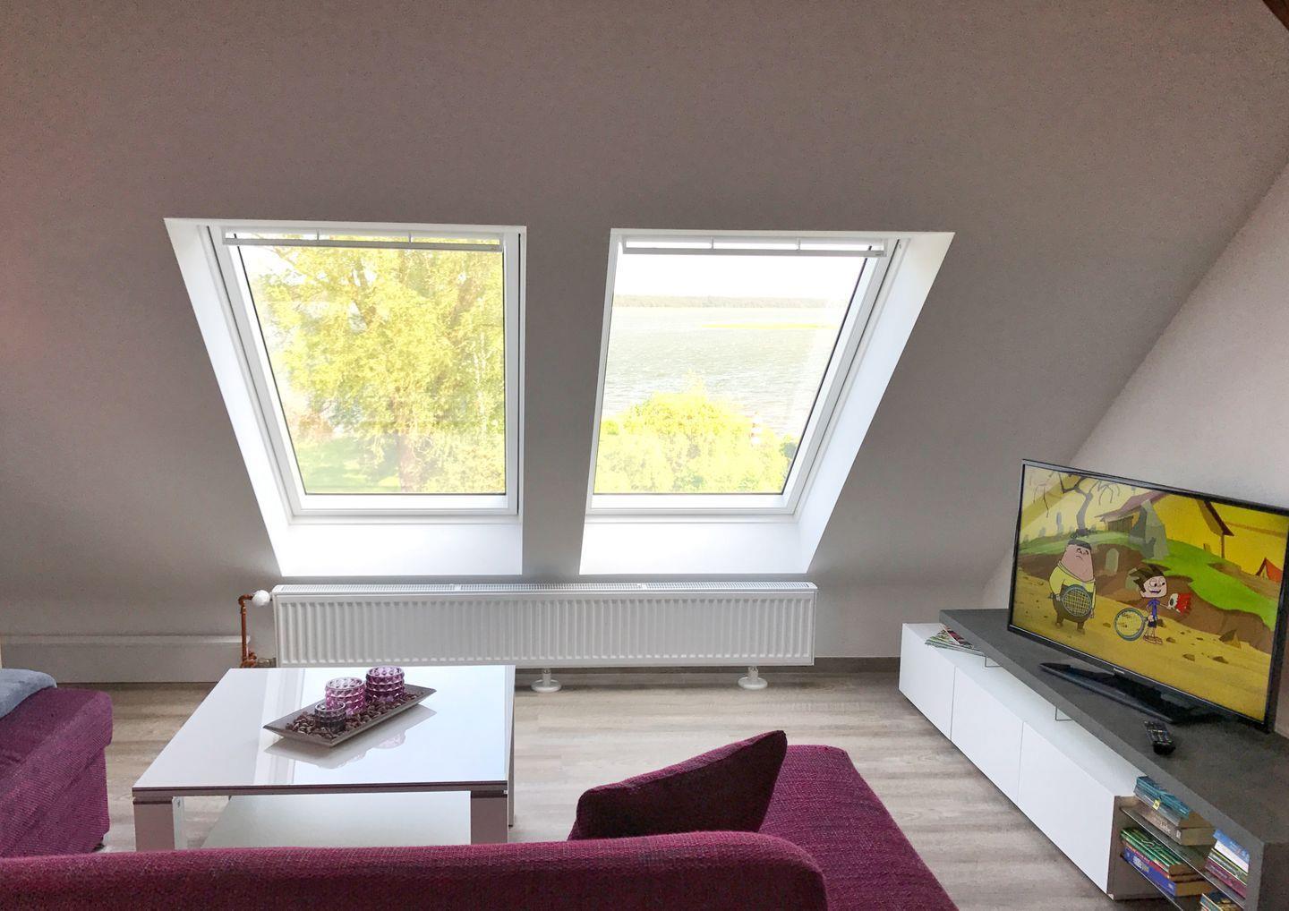 Die Ferienwohnung "Lofoten" befindet sich im Obergeschoss des Appartementhauses und bietet seinen Gästen Schlafmöglichkeiten für maximal 6 Personen. Die Wohnung verfügt über ein neu eingerichteten Wohnbereich mit integrierter Küchenzeile, einen Essbereich sowie eine gemütliche Sitzecke mit einer Schlafcouch für 2 Personen. Aus den großen Fenstern des hellen Appartements genießen Sie einen herrlichen Blick auf den Großen Jasmunder Bodden und können vorbei fahrende Segelschiffe beobachten. In der großen Wohnung finden Sie außerdem ein Schlafzimmer mit Doppelbett sowie ein weiteres Schlafzimmer mit 2 Einzelbetten vor. Zusätzlich zum Badezimmer mit Dusche, Waschbecken und WC bietet Ihnen die geräumige Dachgeschosswohnung noch ein weiteres Gäste-WC mit Waschbecken. Über das Schlafzimmer mit den Einzelbetten gelangen Sie auf eine große Sonnenterrasse, die zum Entspannen einlädt. WLAN ist vorhanden.