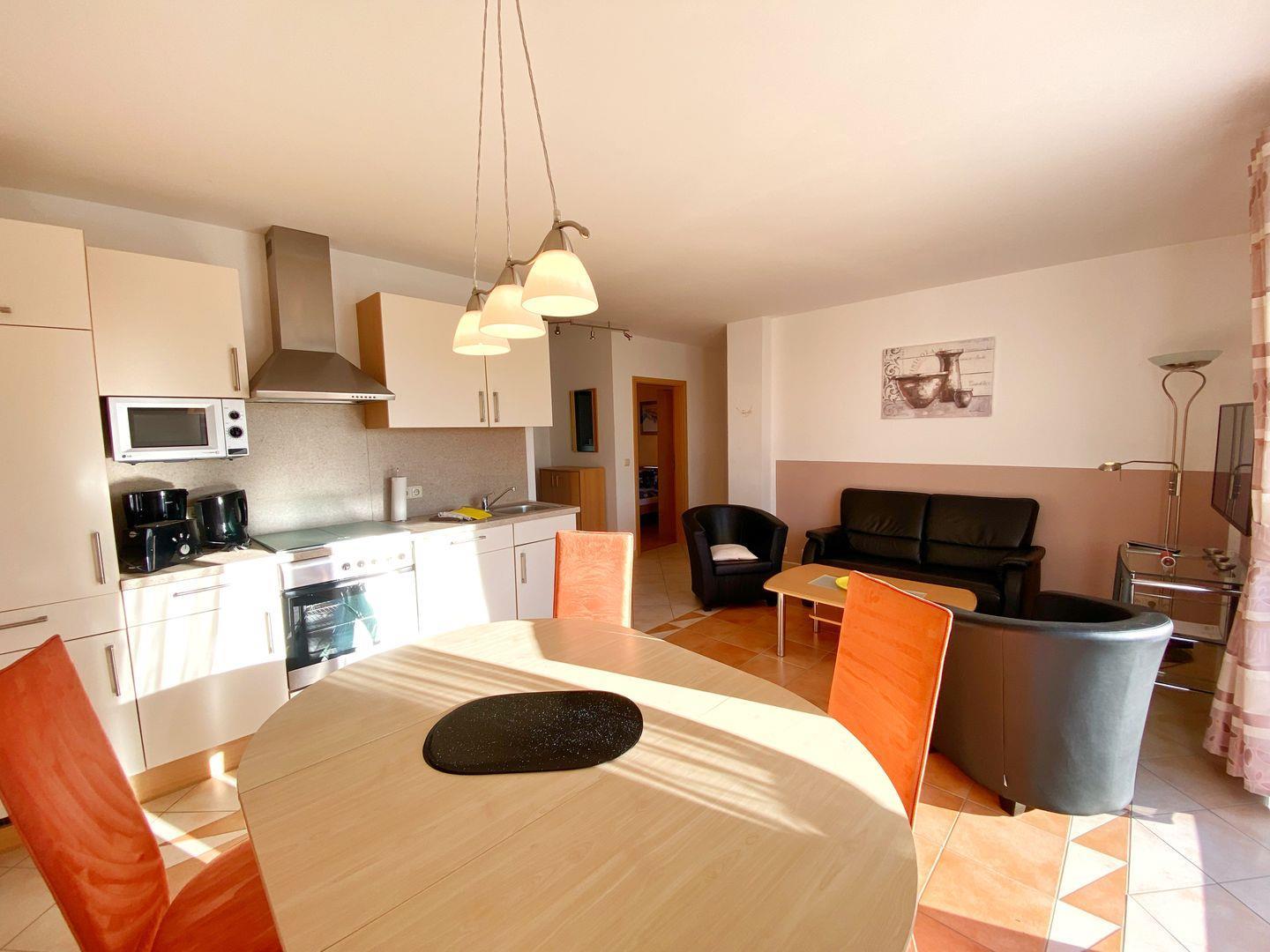 In das Wohnzimmer mit vorgelagerter Terrasse ist eine komplett ausgestattete Küche integriert. Die offene Küche verfügt über Geschirrspüler, Mikrowelle, Ceranfeld, Backofen, Kühlschrank mit Gefriermöglichkeit und natürlich über Kaffeemaschine, Toaster und Wasserkocher.