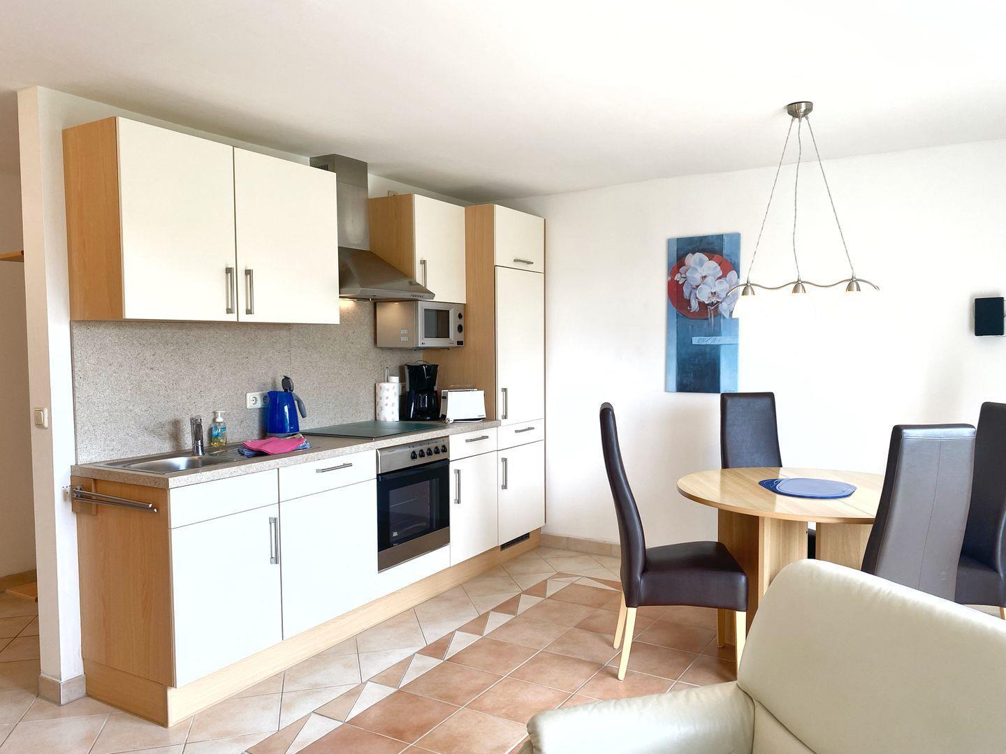 In das Wohnzimmer ist eine komplett ausgestattete Küche integriert. Die offene Küche verfügt über Geschirrspüler, Mikrowelle, Ceranfeld, Backofen, Kühlschrank mit Gefriermöglichkeit und natürlich über Kaffeemaschine, Toaster und Wasserkocher.