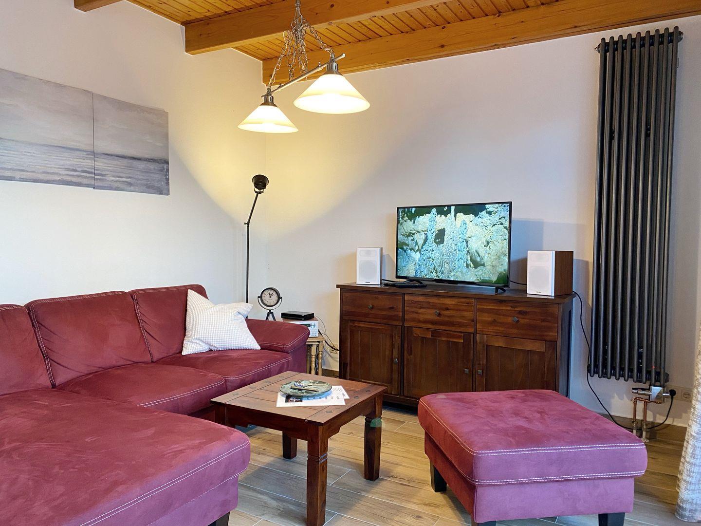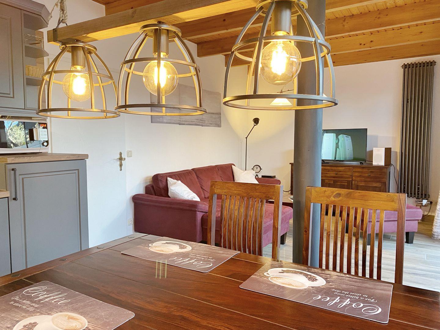 Der Wohn- und Essbereich ist mit Holzmöbeln im Kolonialstil eingerichtet. In der komfortablen Landhausküche sind Ceranfeld, Backofen, Geschirrspülmaschine und Kühlschrank mit Gefriermöglichkeit integriert und es gibt eine Mikrowelle. Der Wohnbereich ist u.a. mit einer Couchecke und einem großformatigen Fernseher ausgestattet. Das moderne Badezimmer bietet Dusche, WC, Waschtisch mit Spiegelschrank, Haartrockner und eine Waschmaschine.