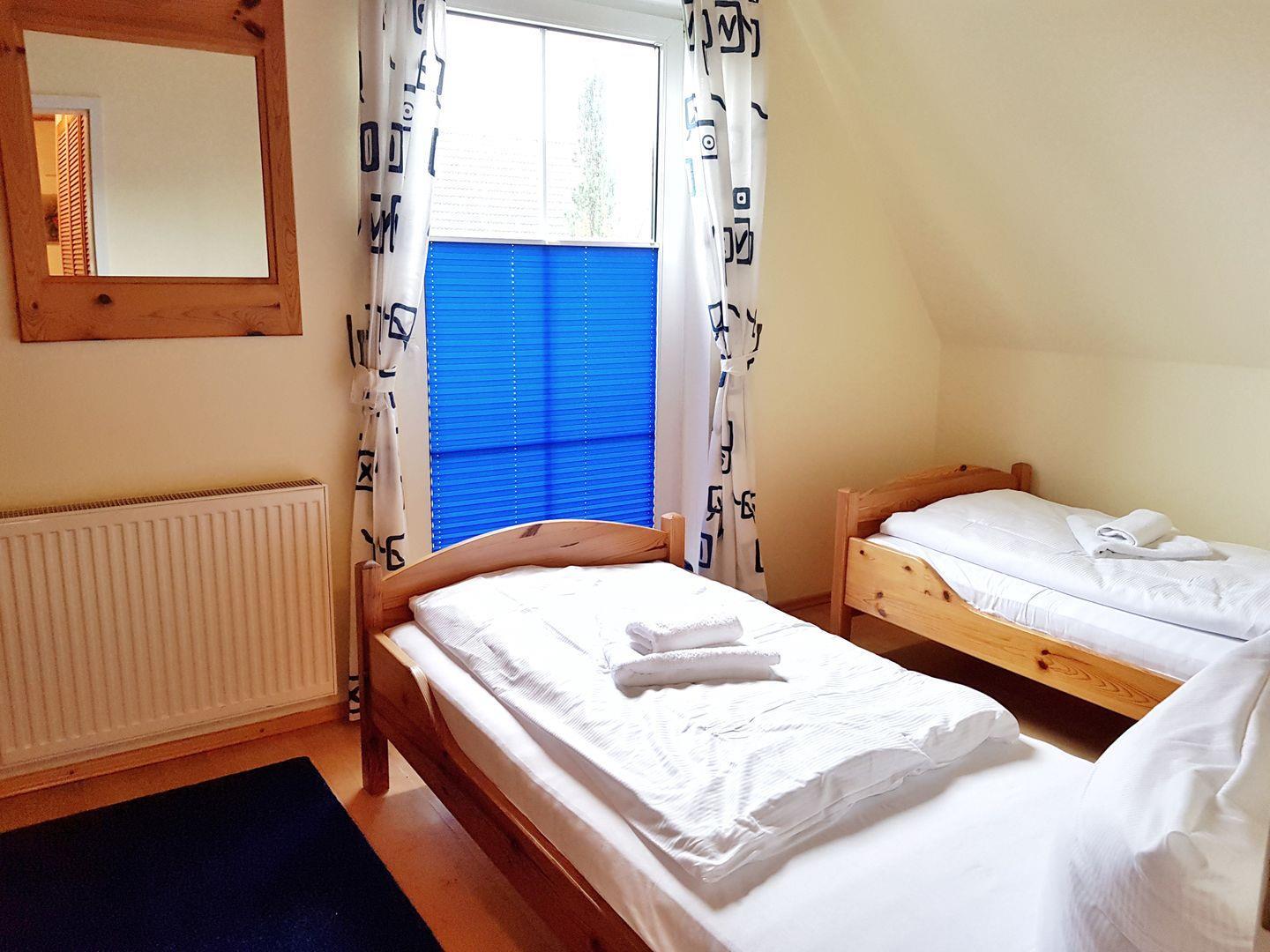 Im Wohnbereich befindet sich u.a. eine Couch und ein großformatiger Fernseher. Sie schlafen entweder in einem gemütlichen Schlafzimmer mit Holzmöbeln und zwei Einzelbetten, oder in unserem Highlight, dem Doppelbett im romantischen Spitzboden.