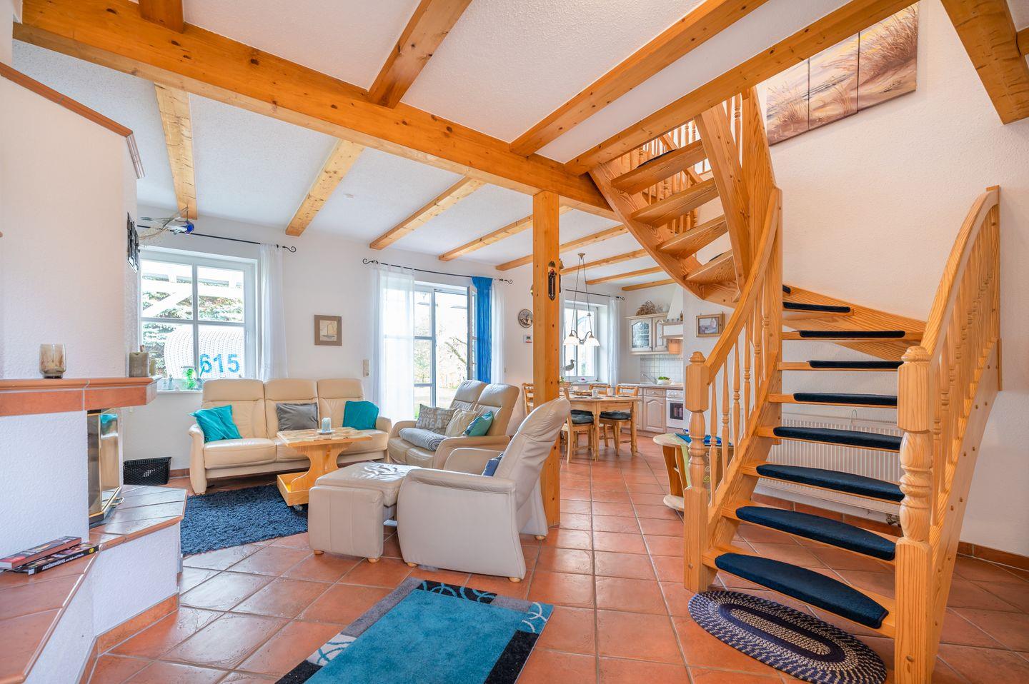 Das großzügige Wohn-Esszimmer ist mit einem Esstisch für 4 Personen, einem Couchtisch sowie zwei Ledersofas (Zwei- und Dreisitzer) ausgestattet, ergänzt durch einen Fernsehsessel von "Stressless". Für Ihren Komfort finden Sie außerdem Schreibtisch, Schuhschrank, Garderobe und eine Kommode im Erdgeschoss. Zwei Schlafzimmer, eine voll ausgestattete Küche und zwei Bäder runden das Angebot ab. Im Erdgeschoss befindet sich ein Gäste-WC mit Dusche, Toilette, Waschbecken, Spiegel, Schrank und Fenster. Im Obergeschoss erwartet Sie ein Bad mit Eckbadewanne, Dusche, WC, Waschbecken, Spiegel, Haartrockner, Schrank und Fenster. Der Hauswirtschaftsraum mit Waschmaschine, Wäscheständer, Bügelbrett, Bügeleisen, Regalen, Staubsauger und Besen sorgt für zusätzlichen Komfort.