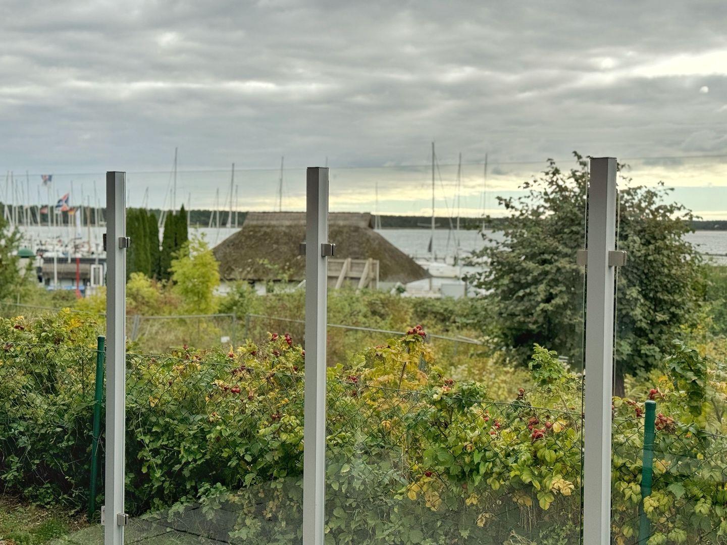 4 Personen und sehr gerne auch für Ihre Haustiere. Sie verfügt über eine teilweise überdachte Südterrasse mit gläsernem Windschutz, der einen herrlichen Blick auf den Hafen und den Großen Jasmunder Bodden bietet. Die Verglasung an der Terrasse ist 180 cm hoch und zur Nachbarterrasse gibt es eine Seitenmarkise um den Bereich komplett zu schließen.
